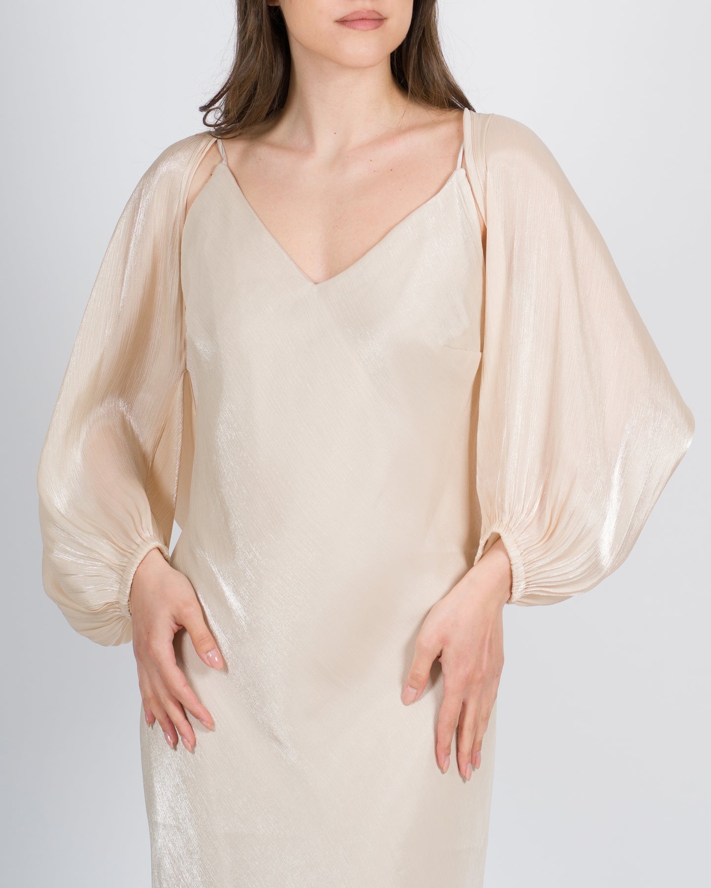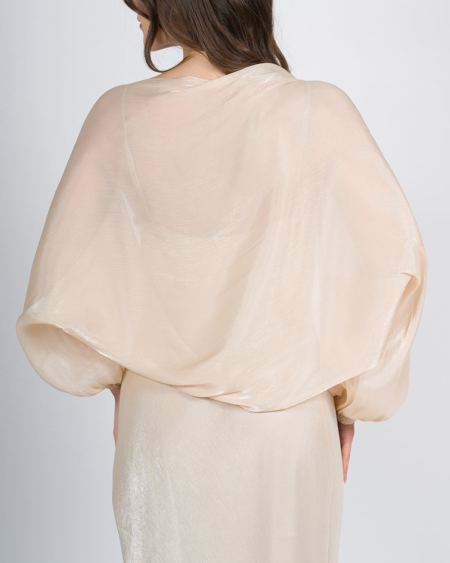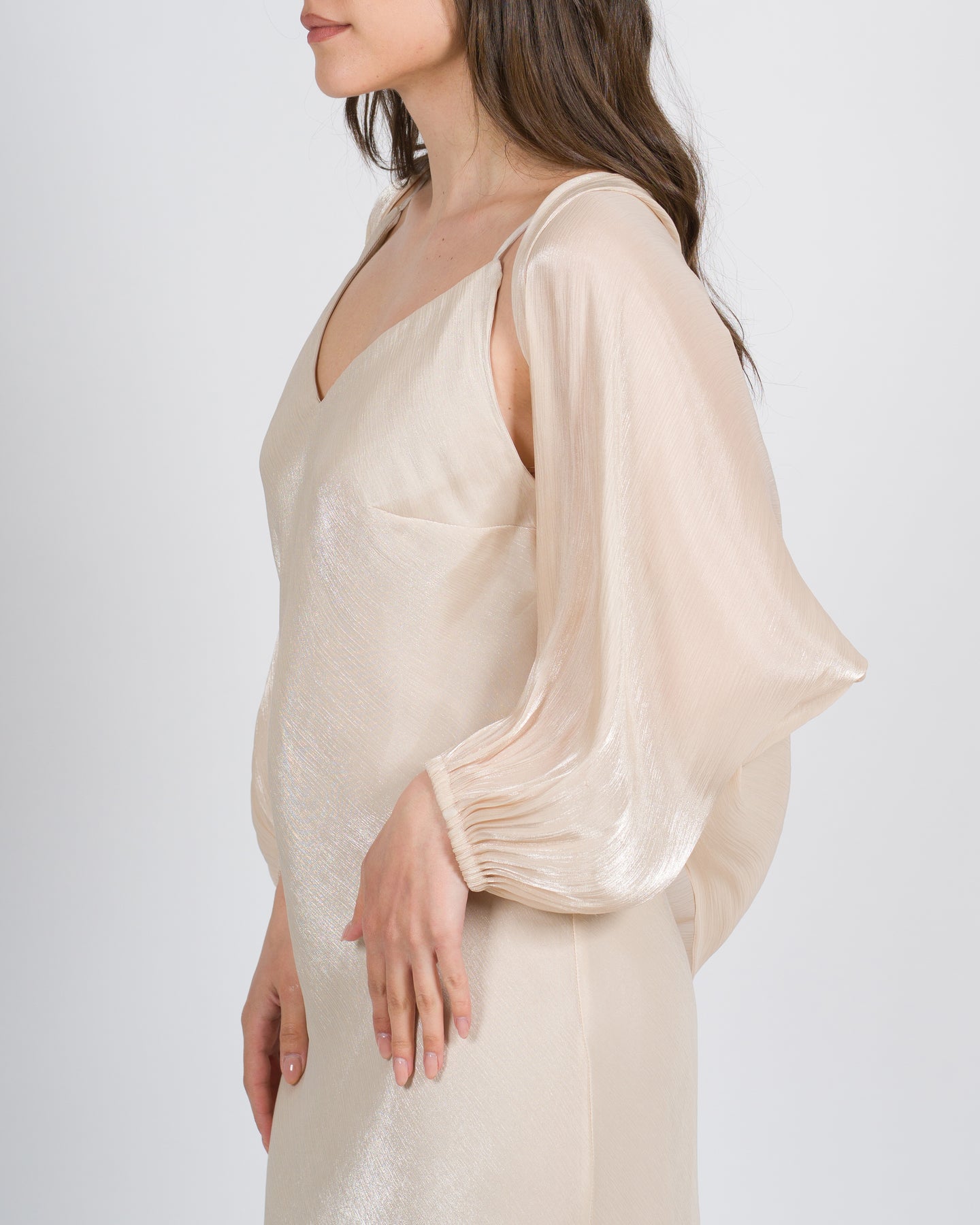 Coprispalle con finitura effetto metallizzato e maniche a sbuffo con orli elasticizzati. È una scelta sofisticata che si abbina a qualsiasi look formale.