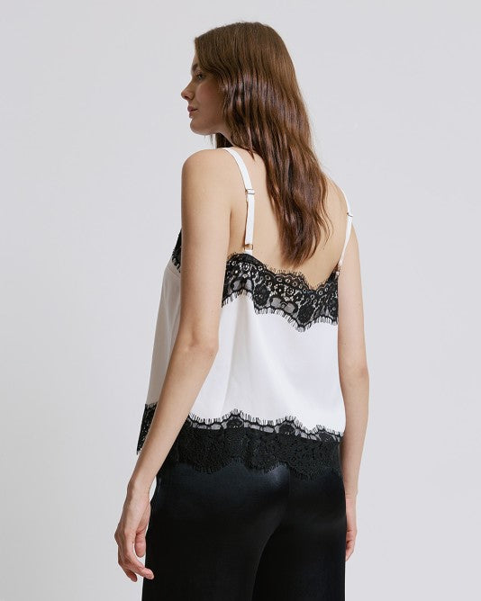 Top in raso con dettagli in pizzo. Presenta uno scollo a V e spalline regolabili.