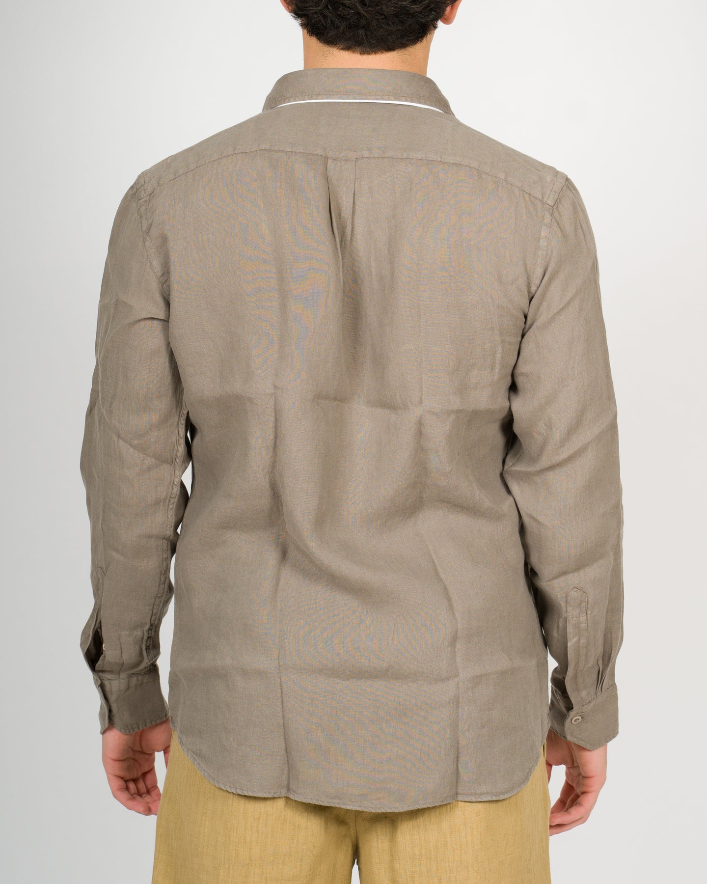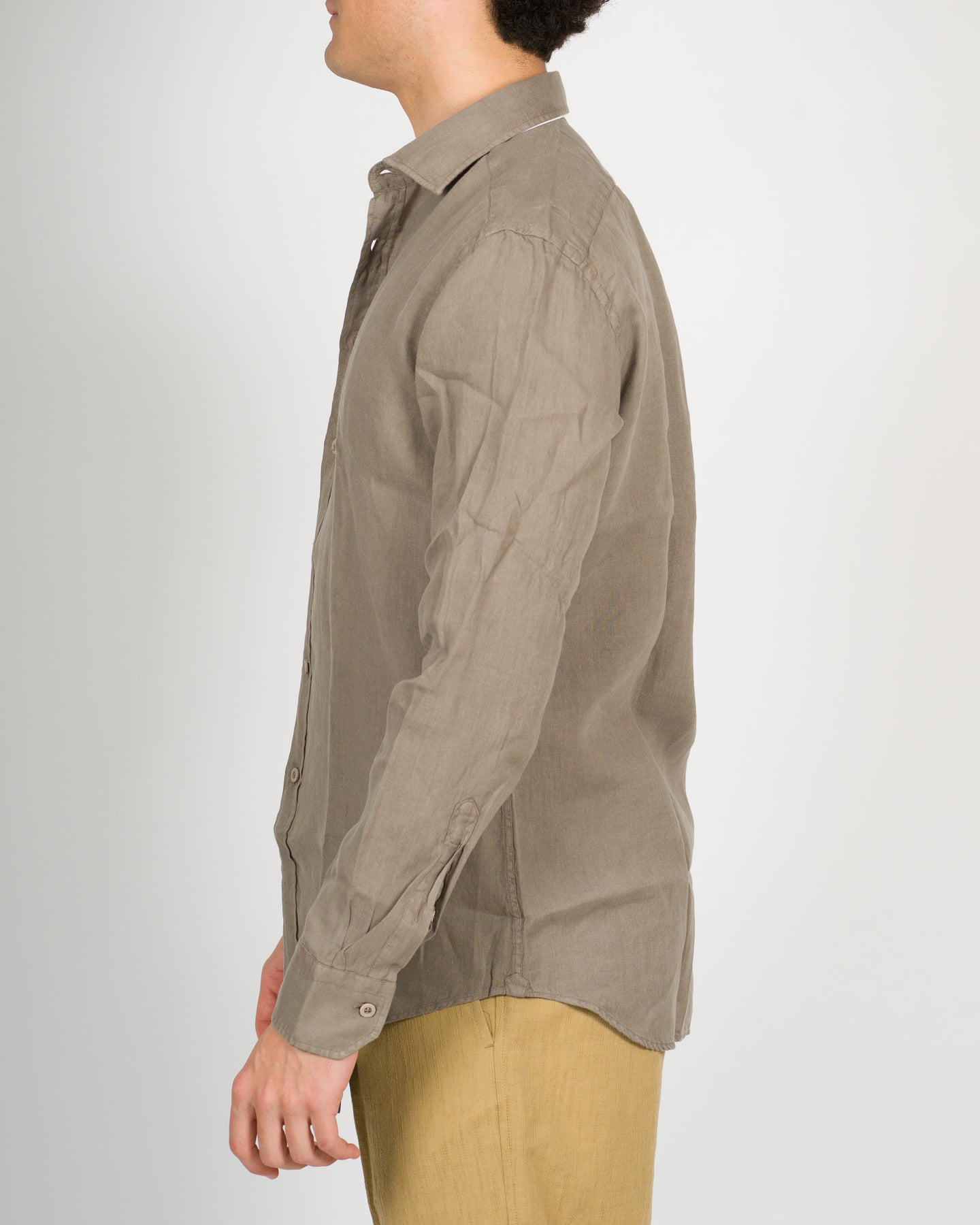 Camicia manica lunga in tessuto 100% lino unito.Vestibilità regular.Il modello è alto 1,80 e indossa la taglia L.
