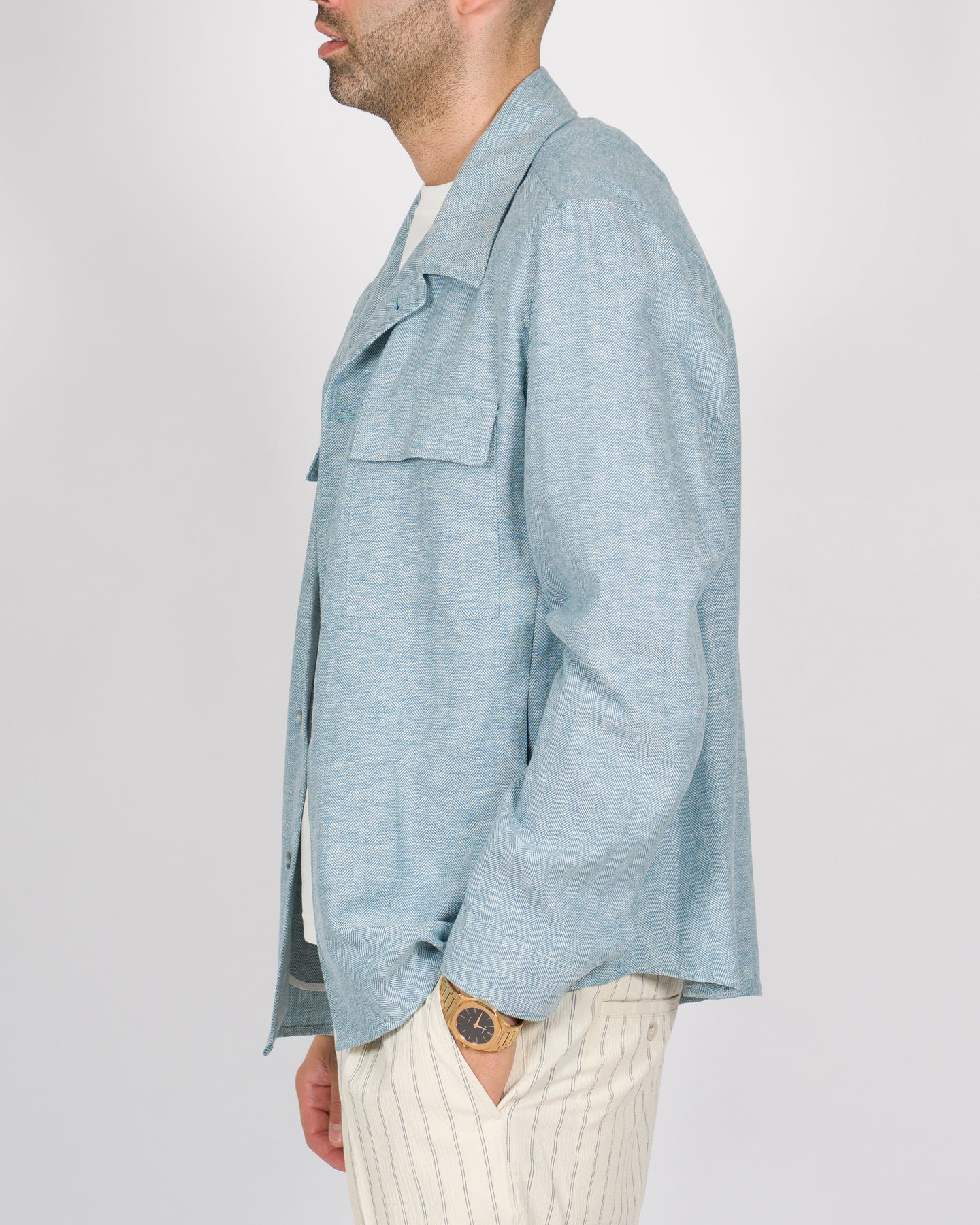 Camicia over con collo bowling e tasconi in tessuto lino spigato.
