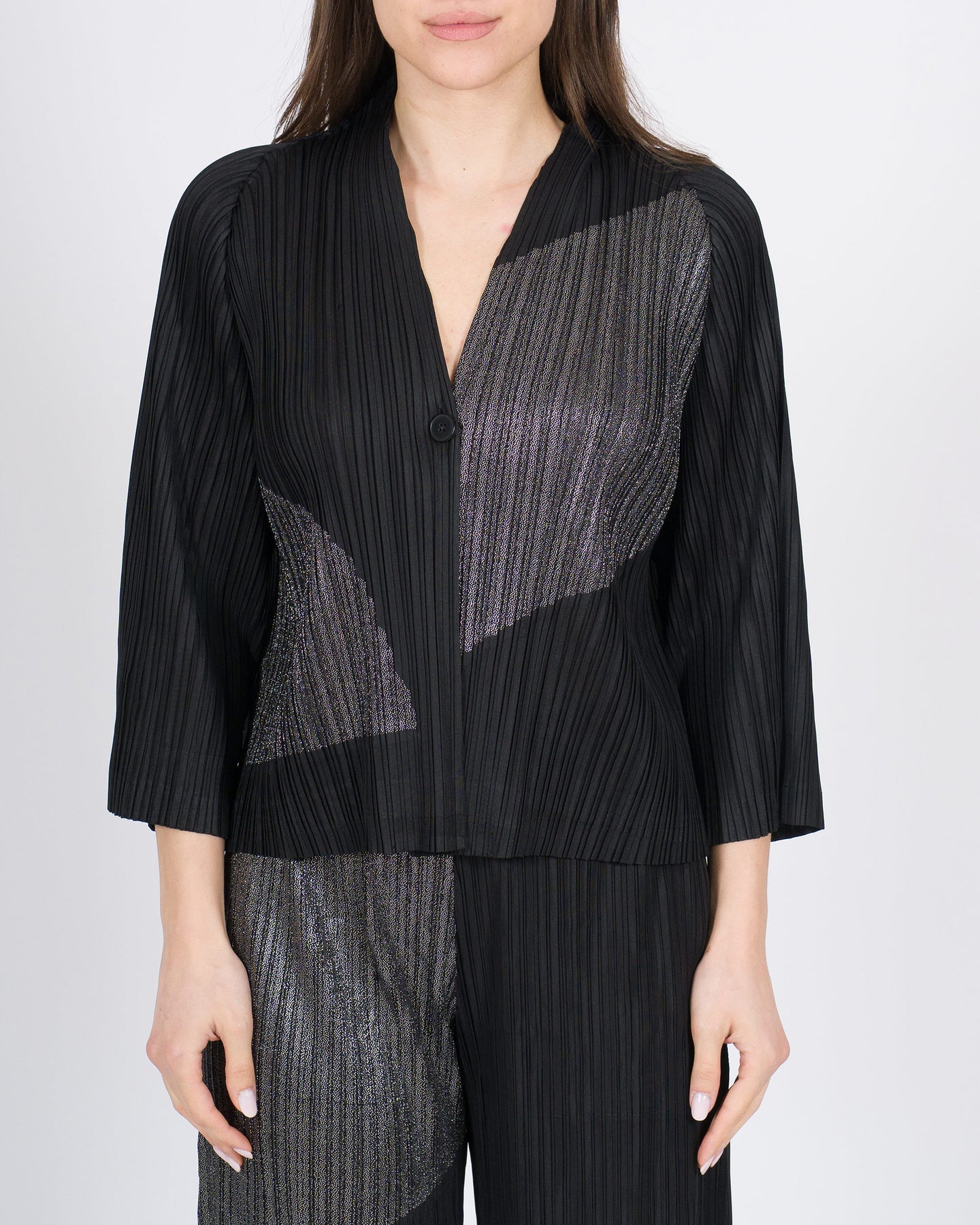 Giacca nera plissé Meimeij con inserti geometrici in lurex, dal design moderno ed elegante. Realizzata in tessuto leggero e strutturato, valorizza la silhouette grazie alla lavorazione plissé e ai dettagli luminosi in filo lurex. Perfetta per outfit raffinati da sera o look contemporanei da giorno. Un capo iconico firmato Meimeij che unisce stile minimal, texture ricercate e tendenza glamour.