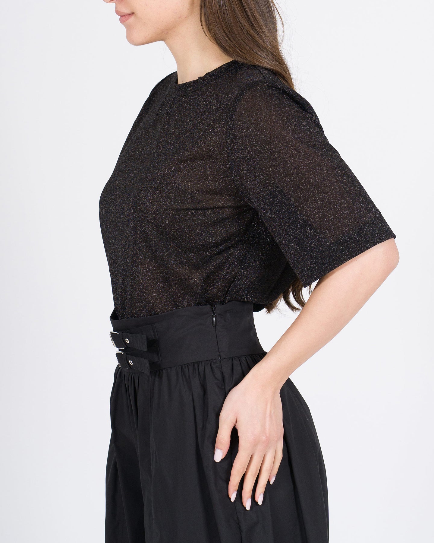 Eleganza luminosa, vestibilità morbida, stile contemporaneo.La t-shirt MEIMEJ in lurex nero avvolge la silhouette con comfort, combinando linee essenziali a un dettaglio scintillante per un look minimal e sofisticato.Un capo versatile, perfetto da abbinare a pantaloni larghi, gonne o bermuda per outfit eleganti e ricercati.