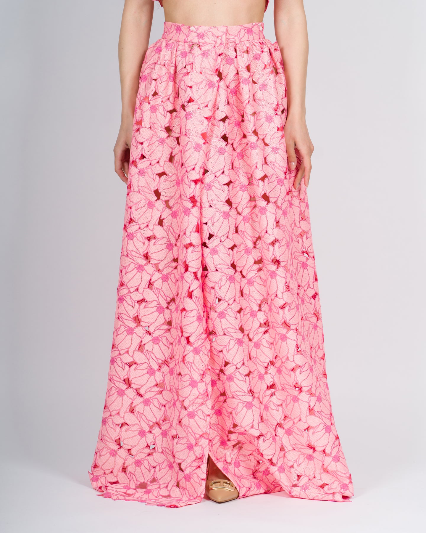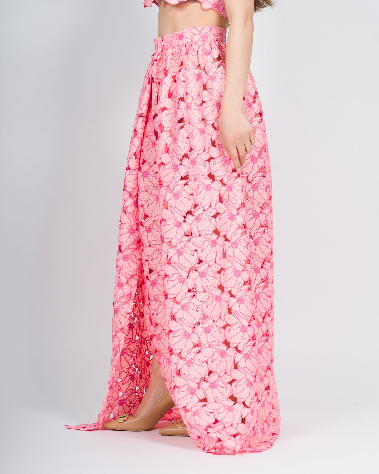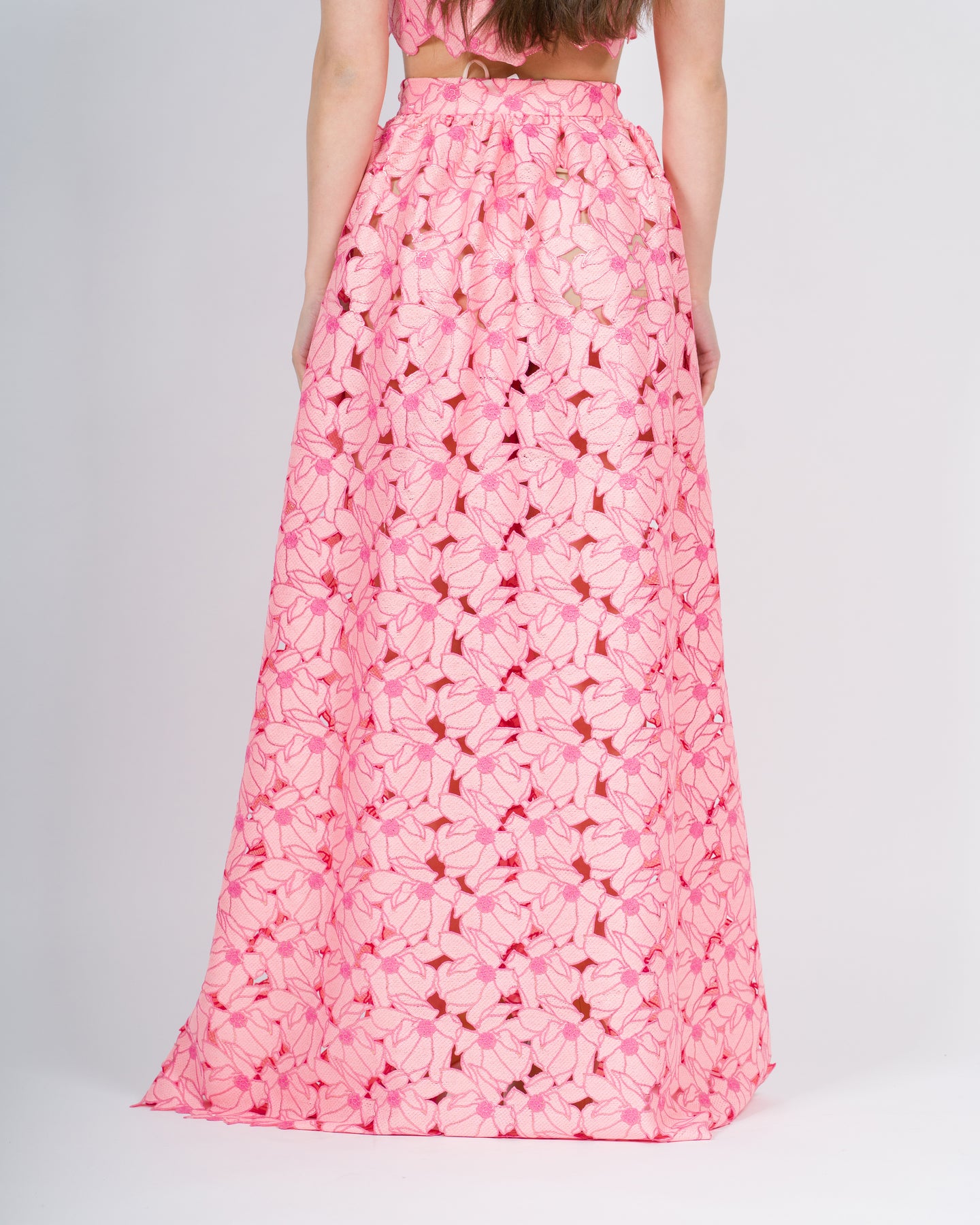 Gonna lunga in tessuto macramè ricamato.La modella indossa la taglia XS ed è alta 1.70 cm
