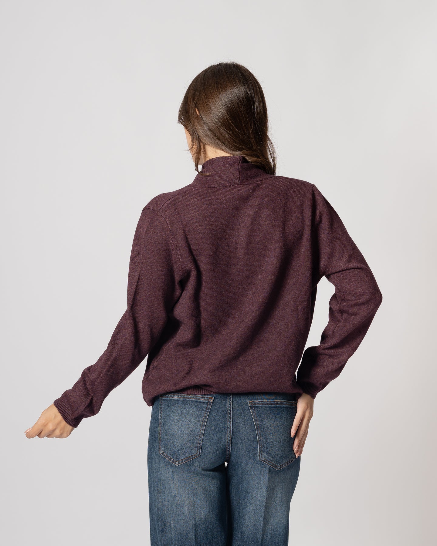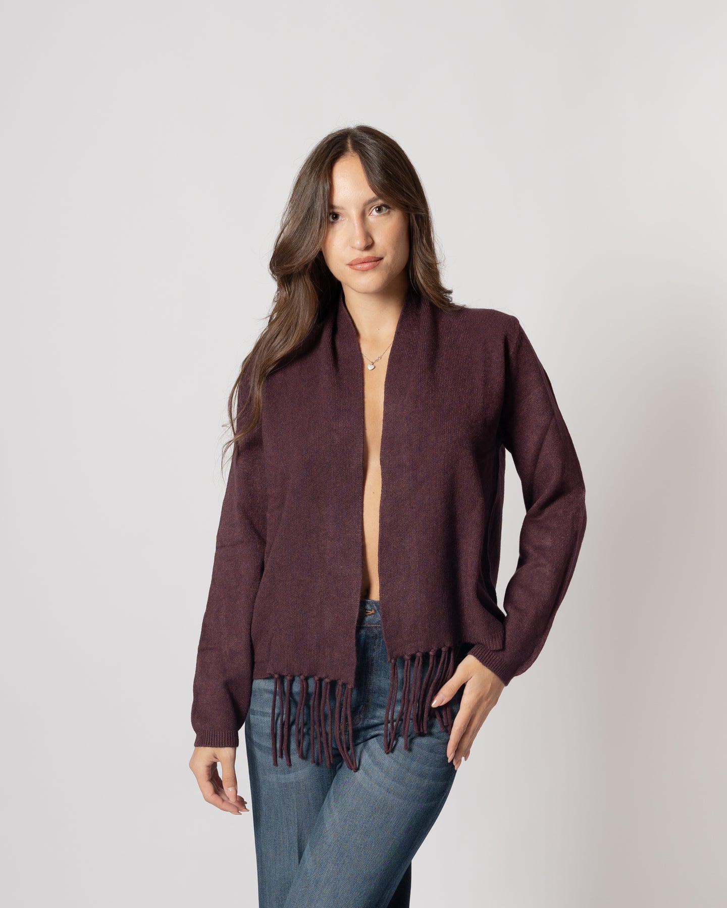 Cardigan manica lunga senza bottoni con frange in tessuto viscosa colore prugna.