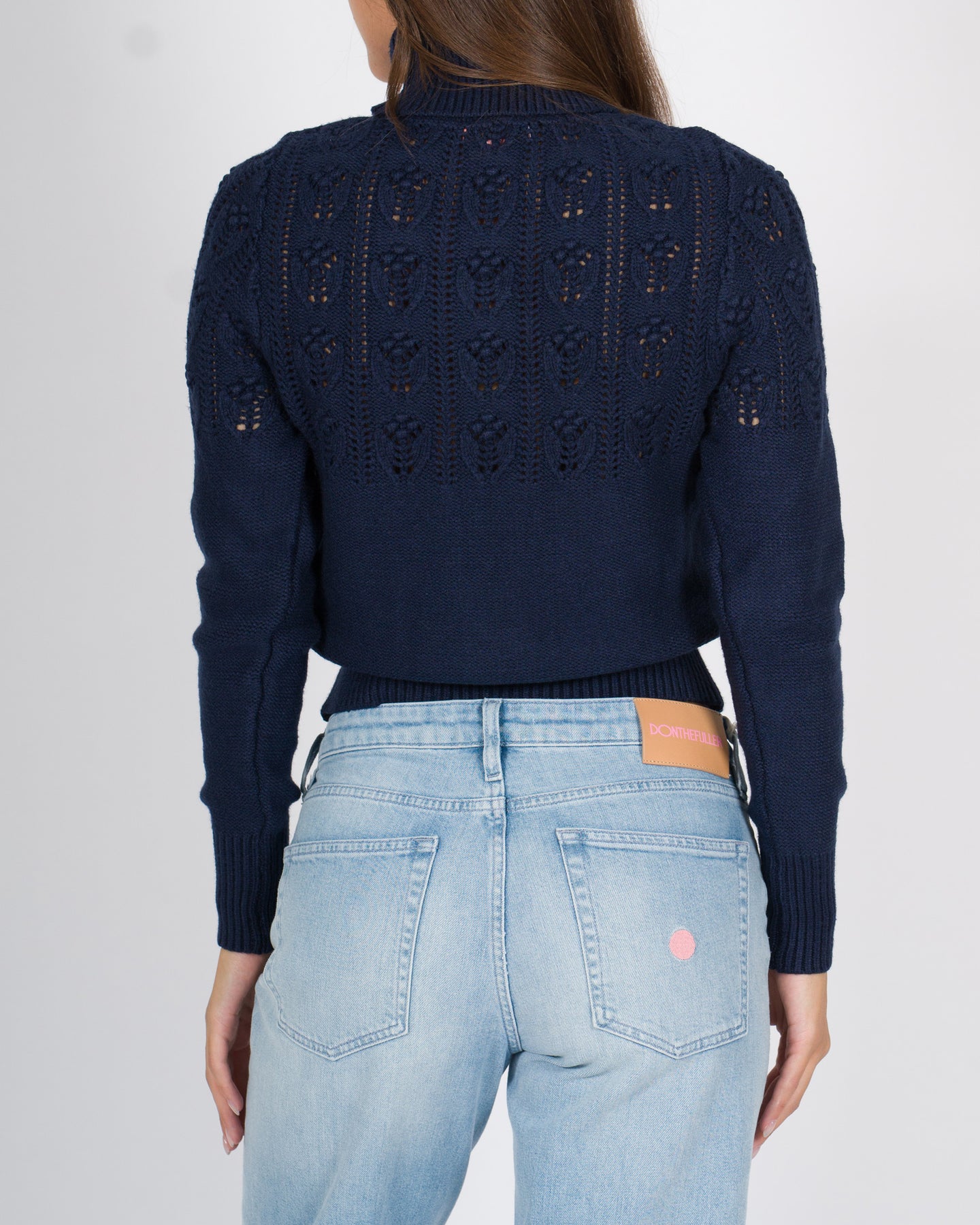 Dal fascino sofisticato e femminile, questo pullover collo alto unisce comfort e stile grazie a una lavorazione traforata che decora con discrezione il davanti, le spalle e la parte posteriore del capo.Realizzata in morbida viscosa avvolgente, è rifinita con bordature a costine su collo, polsini e fondo, per una mavestibilità definita e una maggiore stabilità delle forme.Dettagli tecnici:Maniche lunghe con polsini a costeFondo con bordatura a coste Vestibilità regolare Tessuto: viscosaColore: bluLa modella indossa la taglia S/M ed è alta 1.70.
