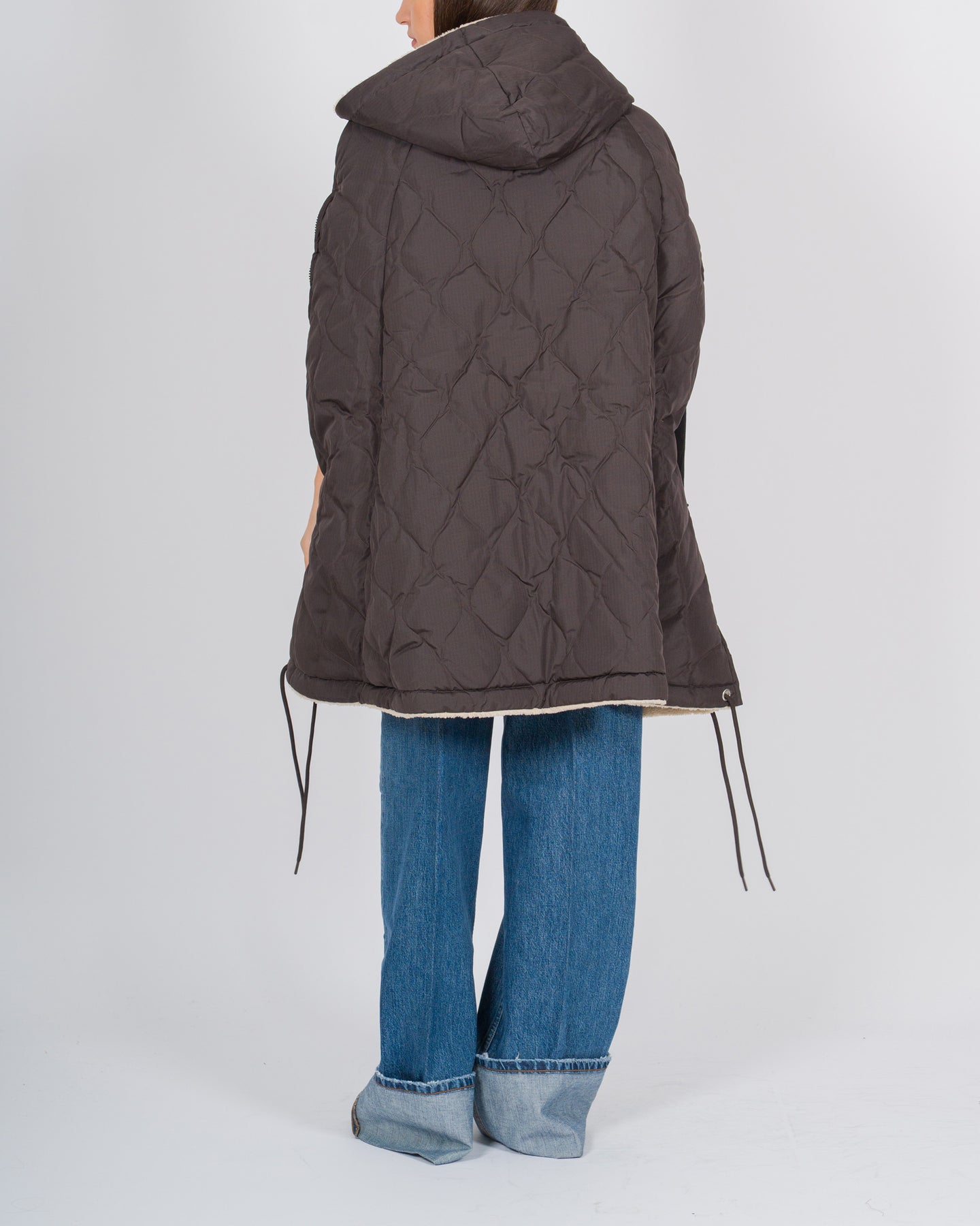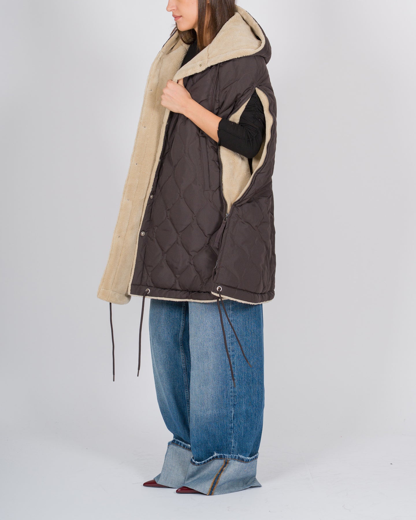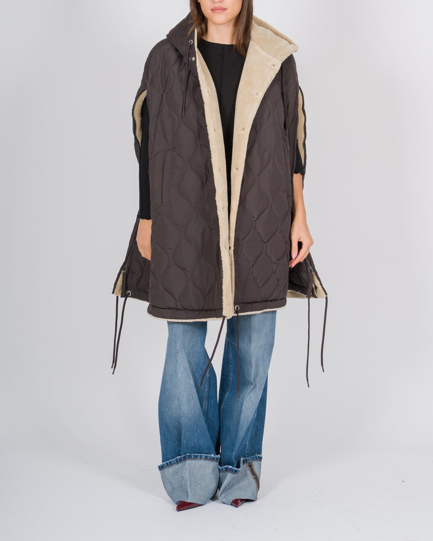La mantella trapuntata reversibile firmata Taion combina funzionalità, comfort e stile contemporaneo.Realizzata con tecnologia high-tech Taion, il capo offre un design senza maniche, ideale per stratificazioni leggere e versatili durante la stagione fredda.Il lato esterno presenta un tessuto tecnico trapuntato, mentre l'interno è foderato in morbido orsetto panna, per una sensazione calda e avvolgente a contatto con la pelle.Il cappuccio con stringhe regolabili permette di adattare la vestibilità alle esigenze climatiche, mentre il taglio ampio e il design a mantella garantiscono libertà di movimento e un look contemporaneo e urbano.La reversibilità consente di cambiare facilmente l'estetica del capo: un lato tecnico e minimal, l'altro soffice e cozy, perfetto per affrontare i mesi più freddi con stile.Un capo Made in Corea, sinonimo di qualità, innovazione.