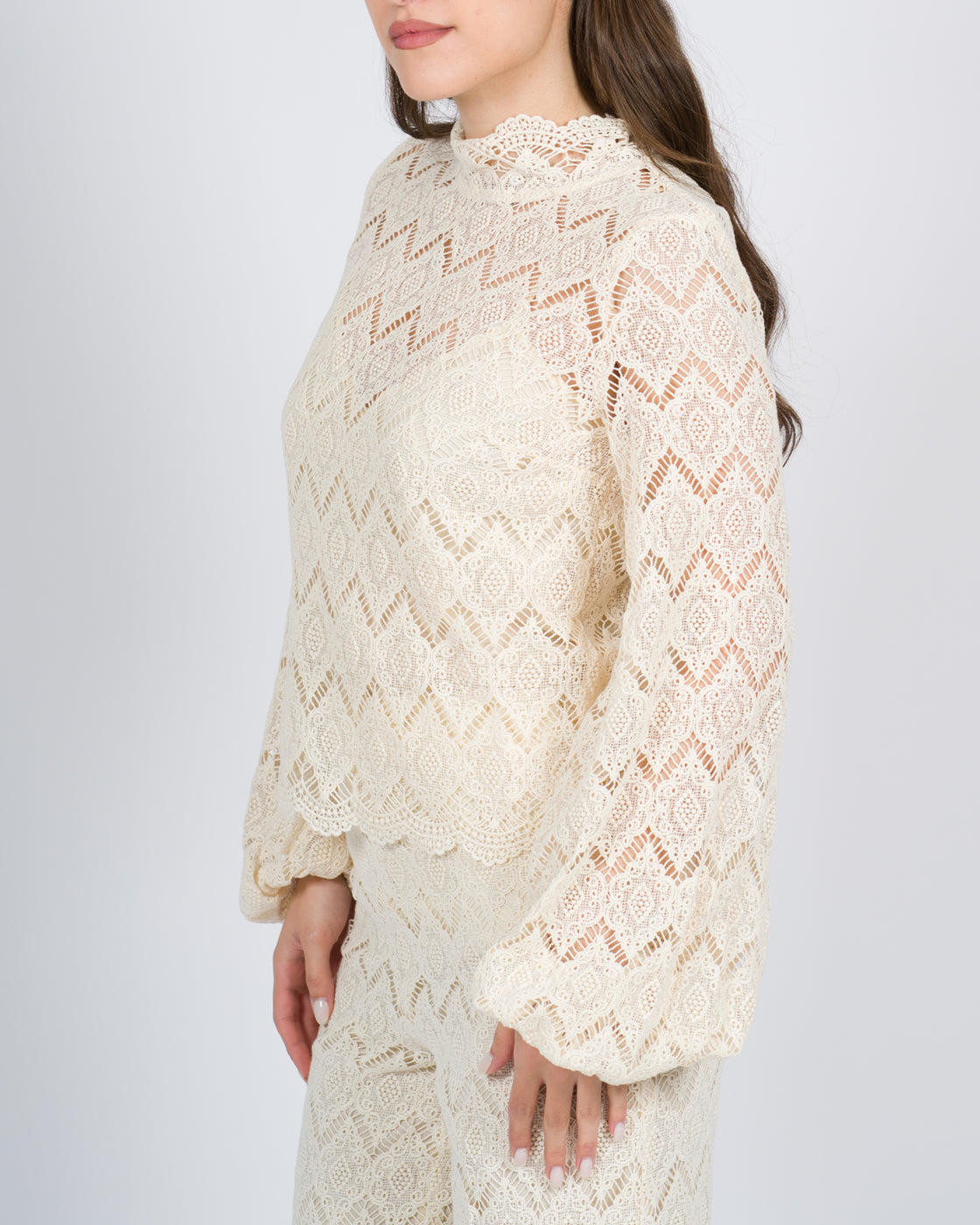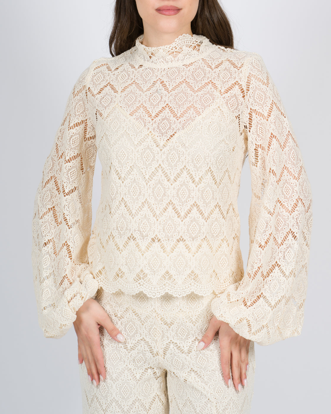 Blusa in pizzo macramè con disegno geometrico e maniche a sbuffo. Ha collo alla coreana e fondo smerlato, maniche lunghe ampie con elastico ai polsi, apertura a goccia con bottoni e placchetta logo Oval T sul retro, top rimovibile in mussola di cotone abbinato, linea dritta.