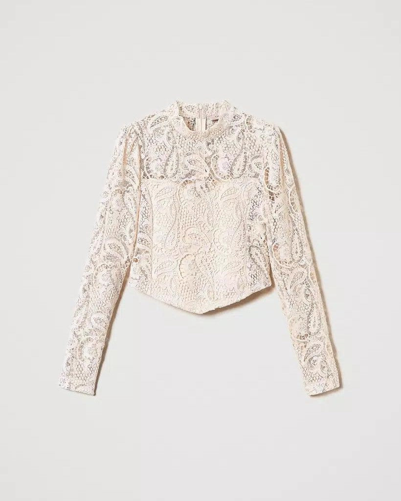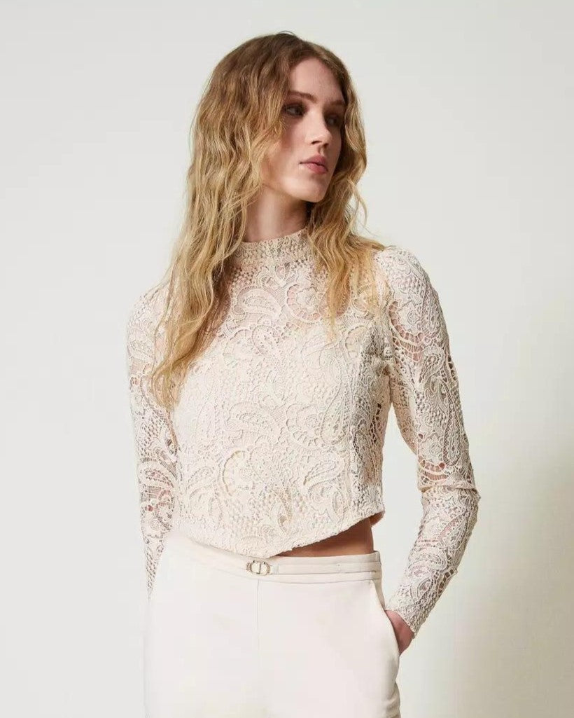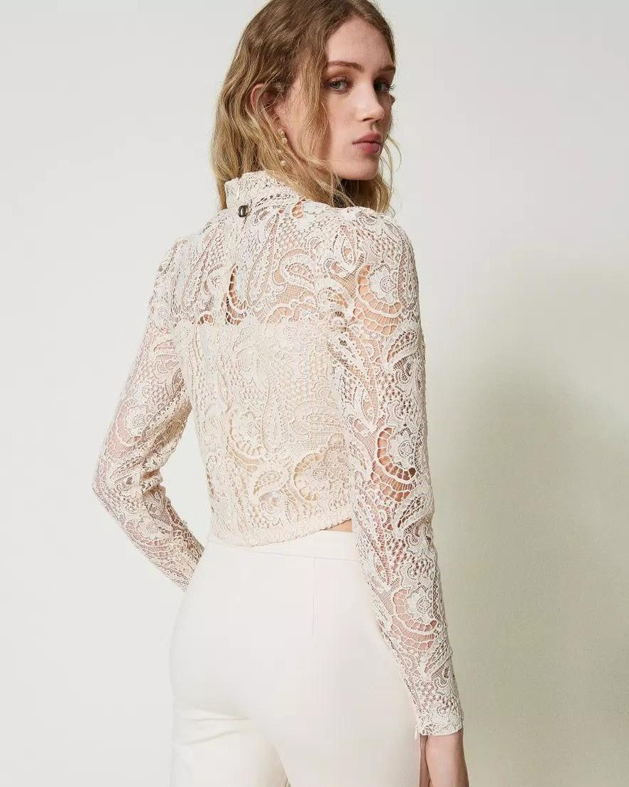 Blusa cropped in pizzo macramè con collo alla coreana. Ha maniche lunghe a guanto arricciate ai giri, fondo asimmetrico più corto ai fianchi, fodera in crêpe de Chine sagomata con carré in trasparenza, chiusura sul retro con bottoni, placchetta logo Oval T dietro, linea fitted. Perfetta per party e cerimonie.