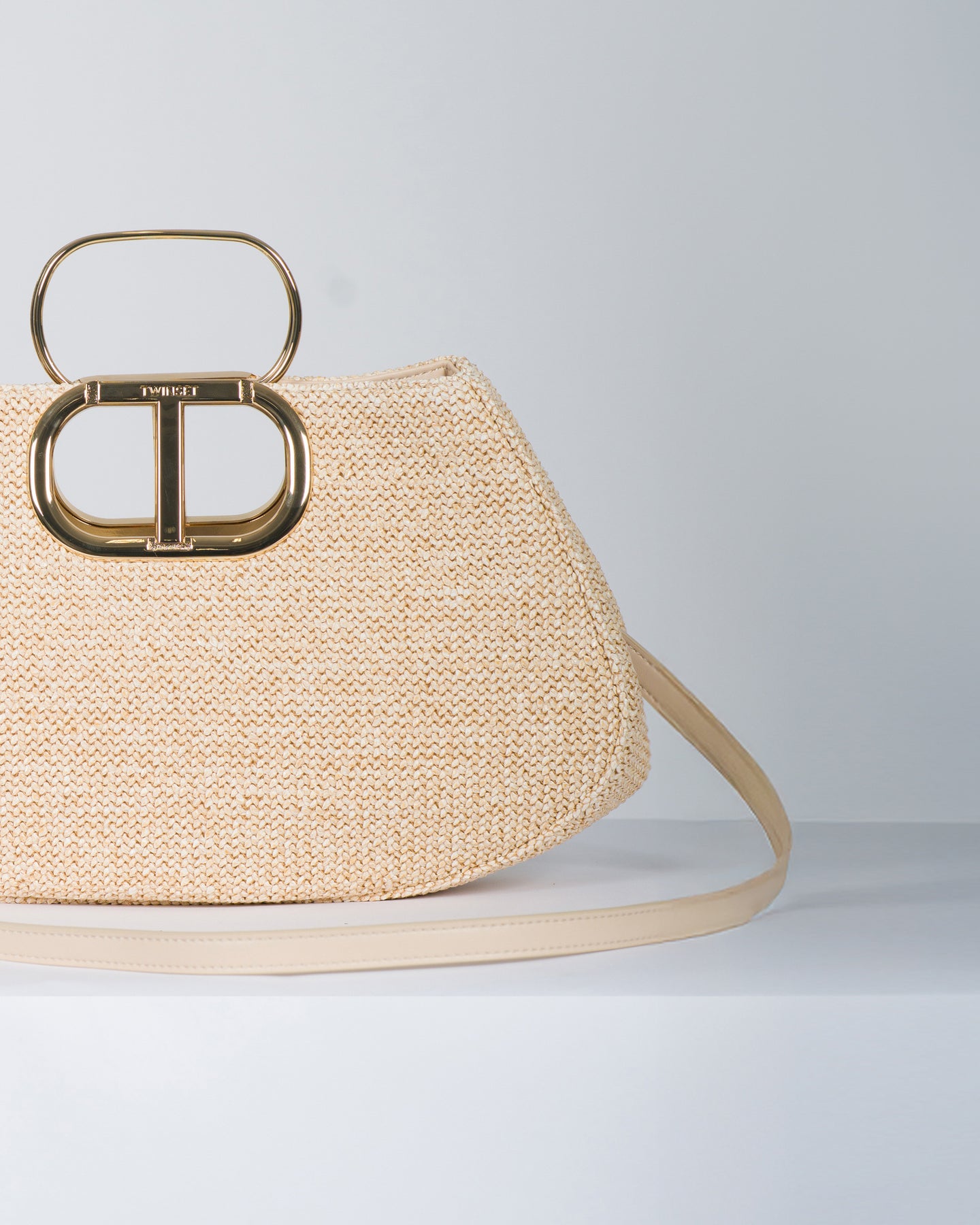 Borsa a tracolla 'Lila' morbida effetto paglia intrecciata a telaio con manico Oval T in metallo. Ha chiusura con magnete, tracolla regolabile e rimovibile, accessori in galvanica color oro, foderata. All'interno del logo sono presenti due anelli che si possono ruotare verso l'interno ed utilizzare come ulteriori manici.-Ampiezza 34 cm, altezza 21 cm, profondità 9 cm. -Ampiezza manici 5,5 cm. -Lunghezza tracolla 53 cm100% polipropilenica. Fodera: 100% poliestere. -Materiale 2: 100% poliuretanica