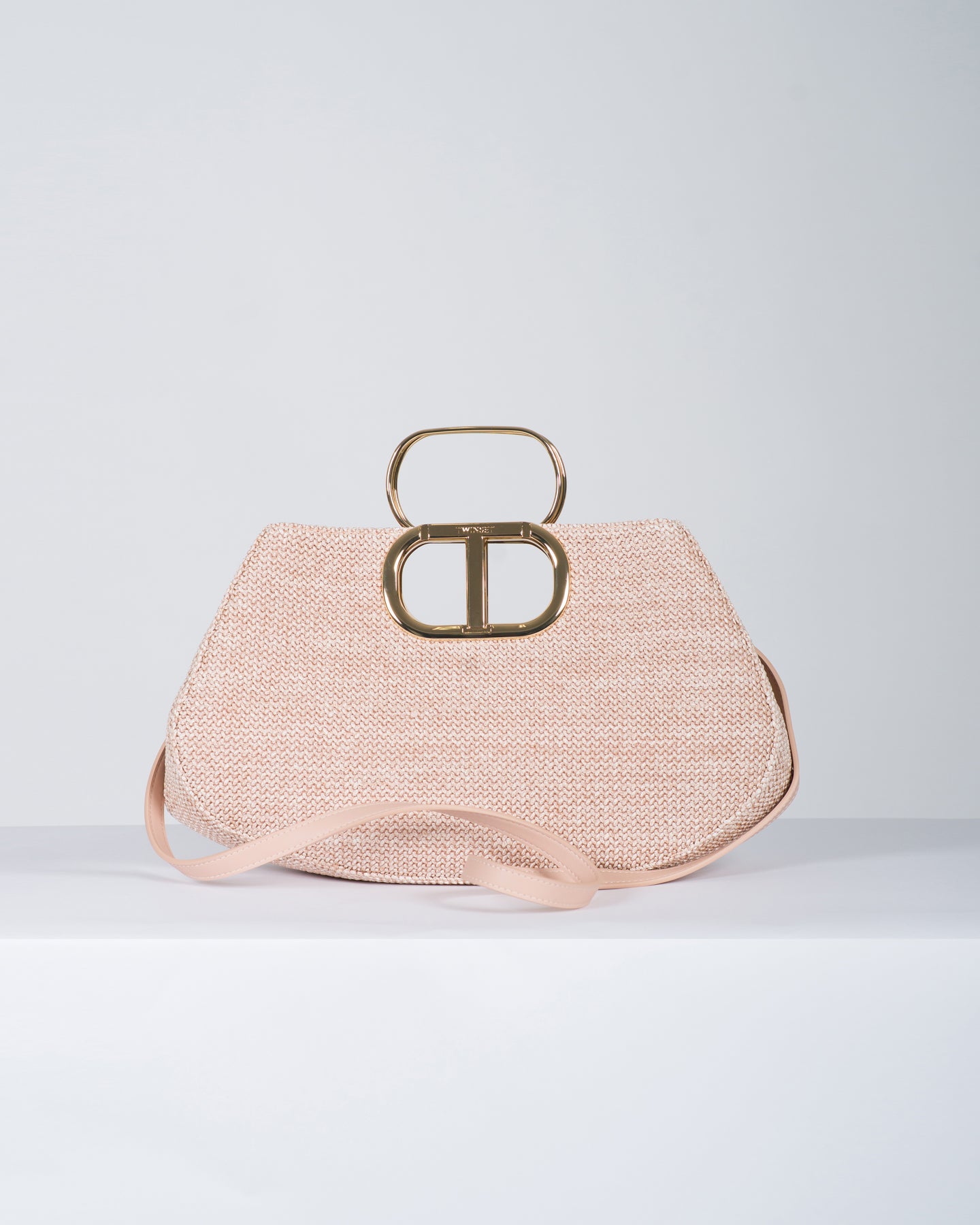 Borsa a tracolla 'Lila' morbida effetto paglia intrecciata a telaio con manico Oval T in metallo. Ha chiusura con magnete, tracolla regolabile e rimovibile, accessori in galvanica color oro, foderata. All'interno del logo sono presenti due anelli che si possono ruotare verso l'interno ed utilizzare come ulteriori manici.-Ampiezza 34 cm, altezza 21 cm, profondità 9 cm. -Ampiezza manici 5,5 cm. -Lunghezza tracolla 53 cm100% polipropilenica. Fodera: 100% poliestere. -Materiale 2: 100% poliuretanica