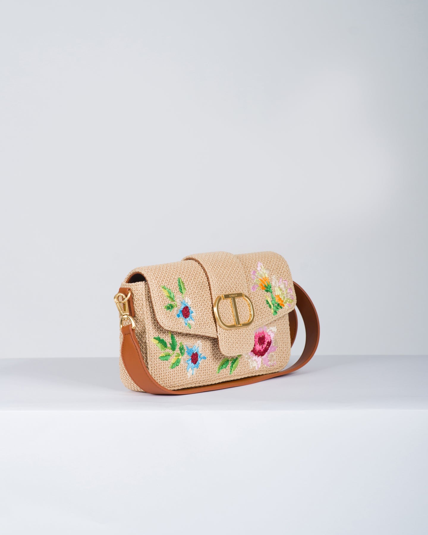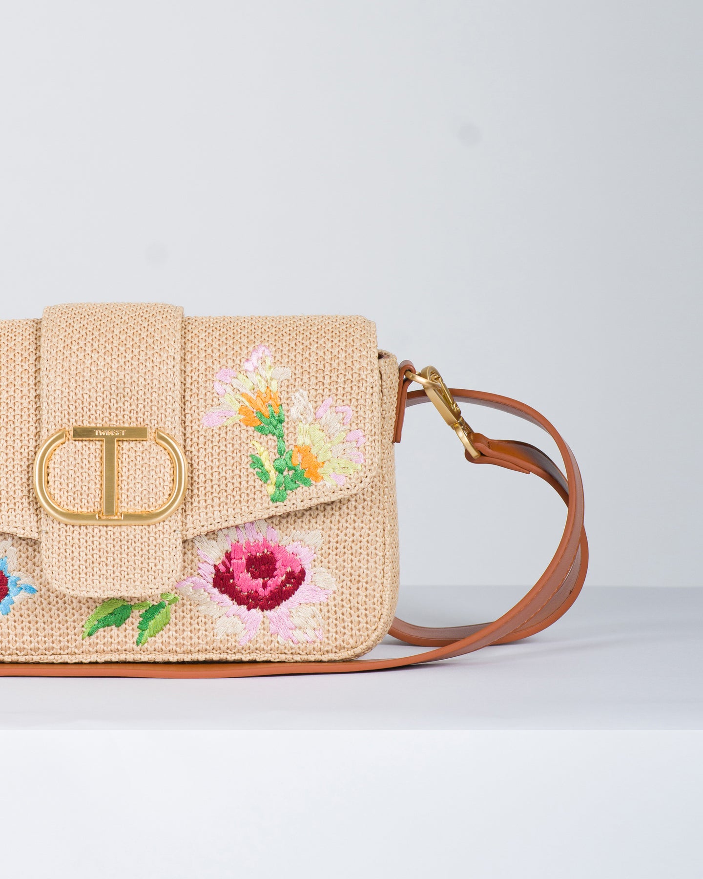 Borsa 'Amie' in tessuto di paglia a telaio con ricami floreali e dettagli effetto cuoio naturale. Ha chiusura con patta e magnete, logo Oval T in metallo, manico a spalla e tracolla cross-body entrambi rimovibili, fodera.-Ampiezza 25 cm, altezza 16 cm, profondità 6 cm. -Ampiezza manico 18 cm. Lunghezza catena 45 cm-100% polipropilene. -Fodera: 100% poliestere. -Dettagli: 100% poliuretano. -Ricamo: 100% poliestere