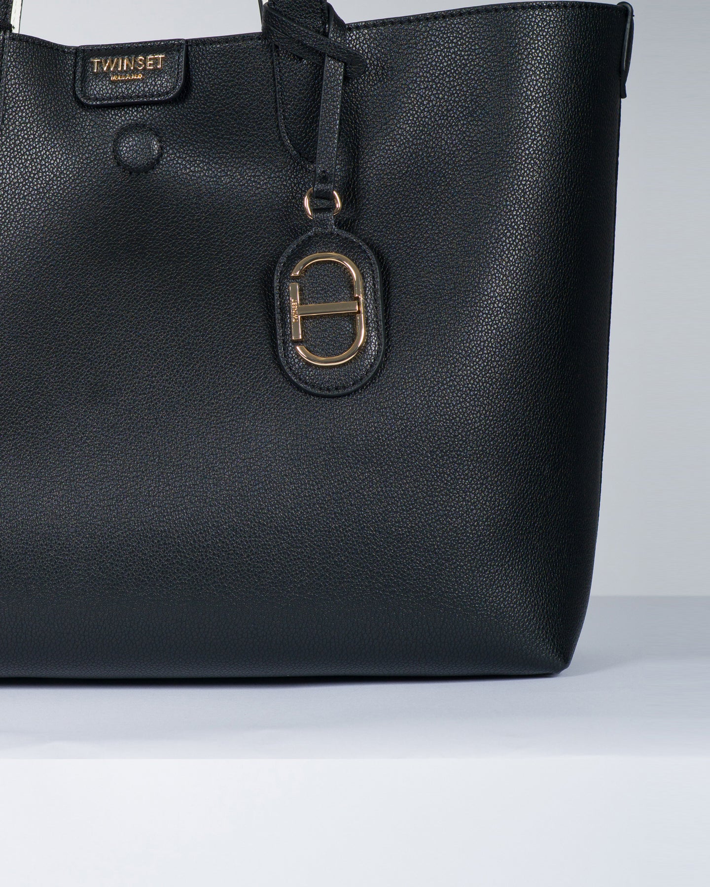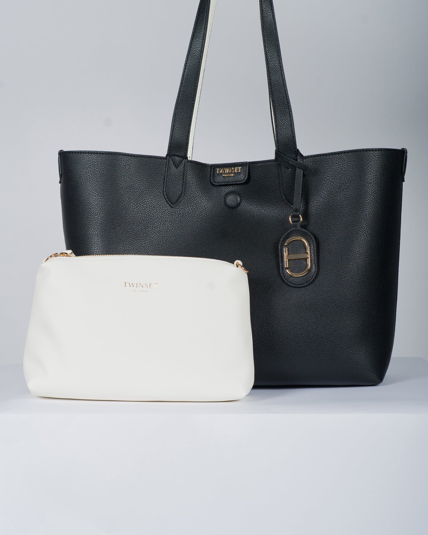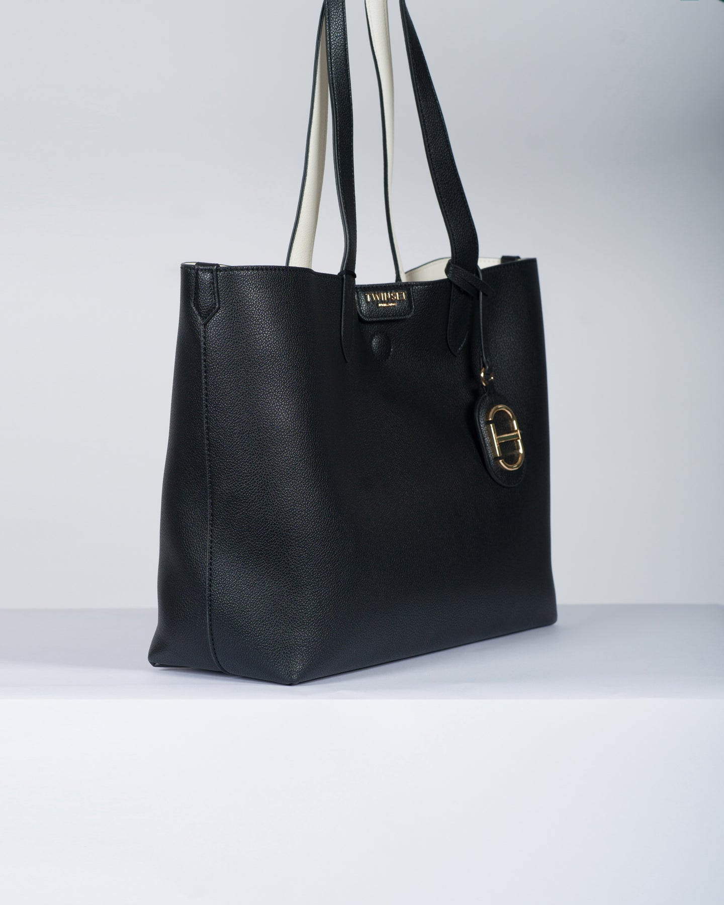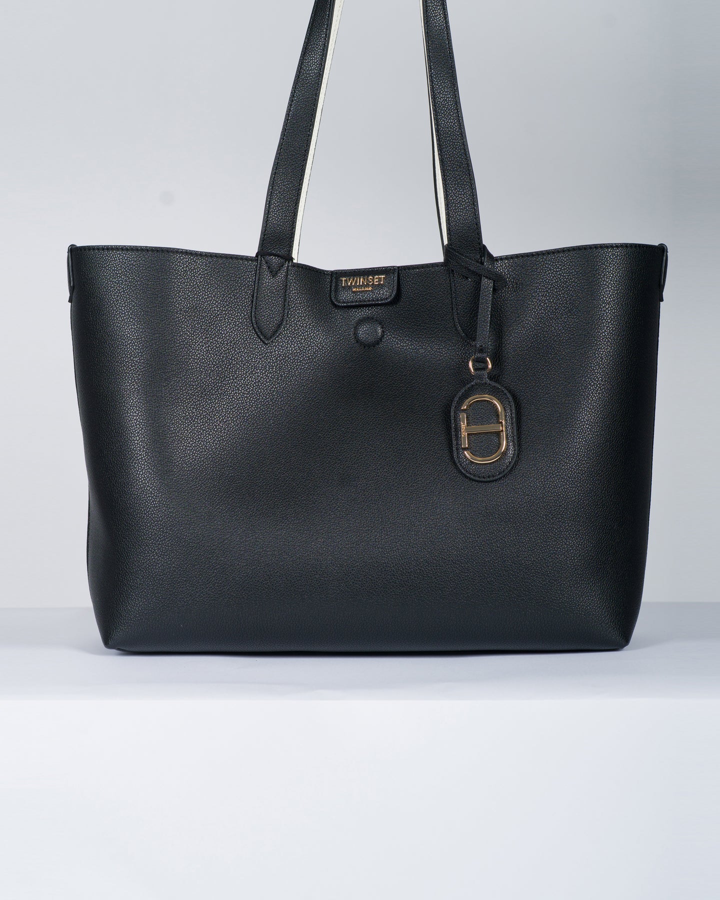 Twinset borsa a mano con chiusura. Realizzata in pelle sintetica.- Patella con chiusura magnetica.- Manici lunghi.- Compatibile con formato A4.- Il modello senza fodera.- Profondità: 12 cm.- Altezza: 28 cm.- Larghezza alla base: 37 cm.