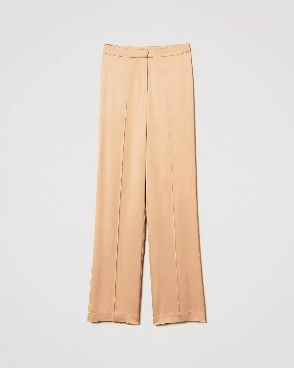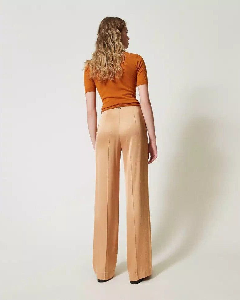 Pantaloni in raso di viscosa stretch d'ispirazione maschile con chiusura nascosta con gancio a uomo e zip, tasche alla francese ai fianchi, piega stirata, linea dritta. Perfetti per party e cerimonie.