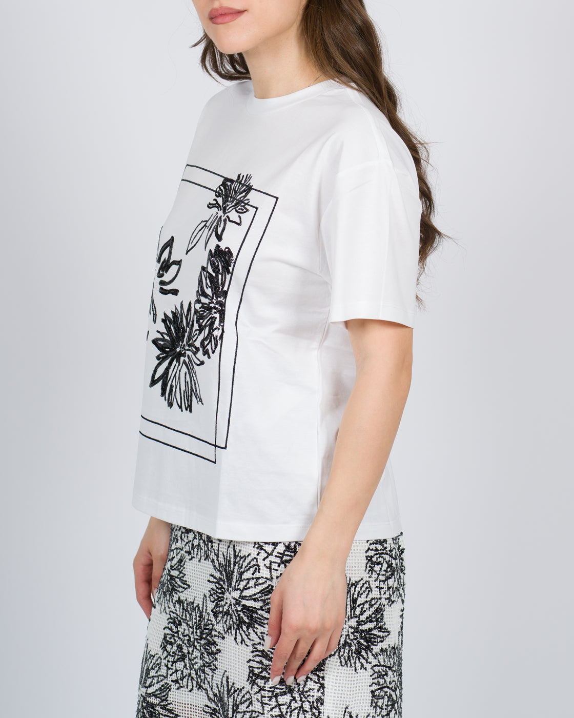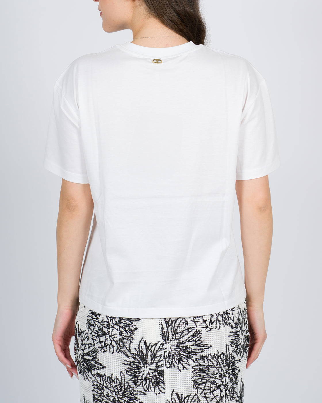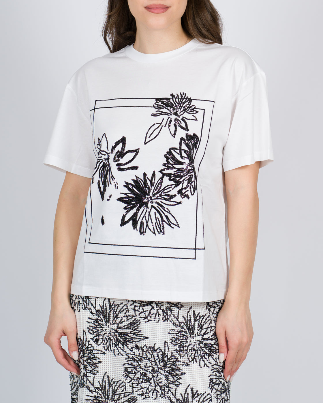 T-shirt in jersey di cotone con il 50% di cotone organico e ricamo piazzato di paillettes a disegno floreale. Ha collo tondo, maniche corte e linea regular. Questo articolo fa parte della selezione 'Archive', ispirata dai capi più iconici e amati delle collezioni Twinset.