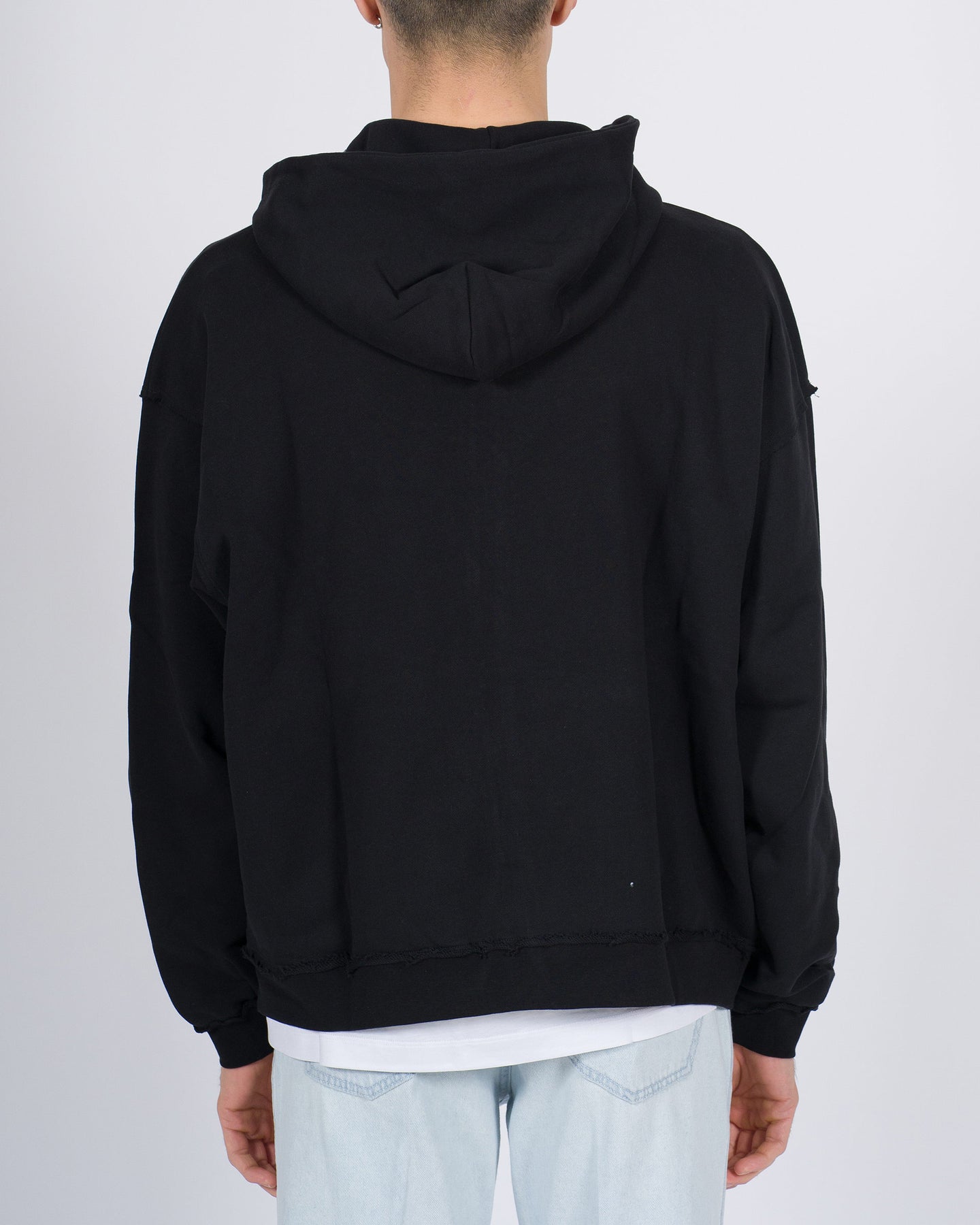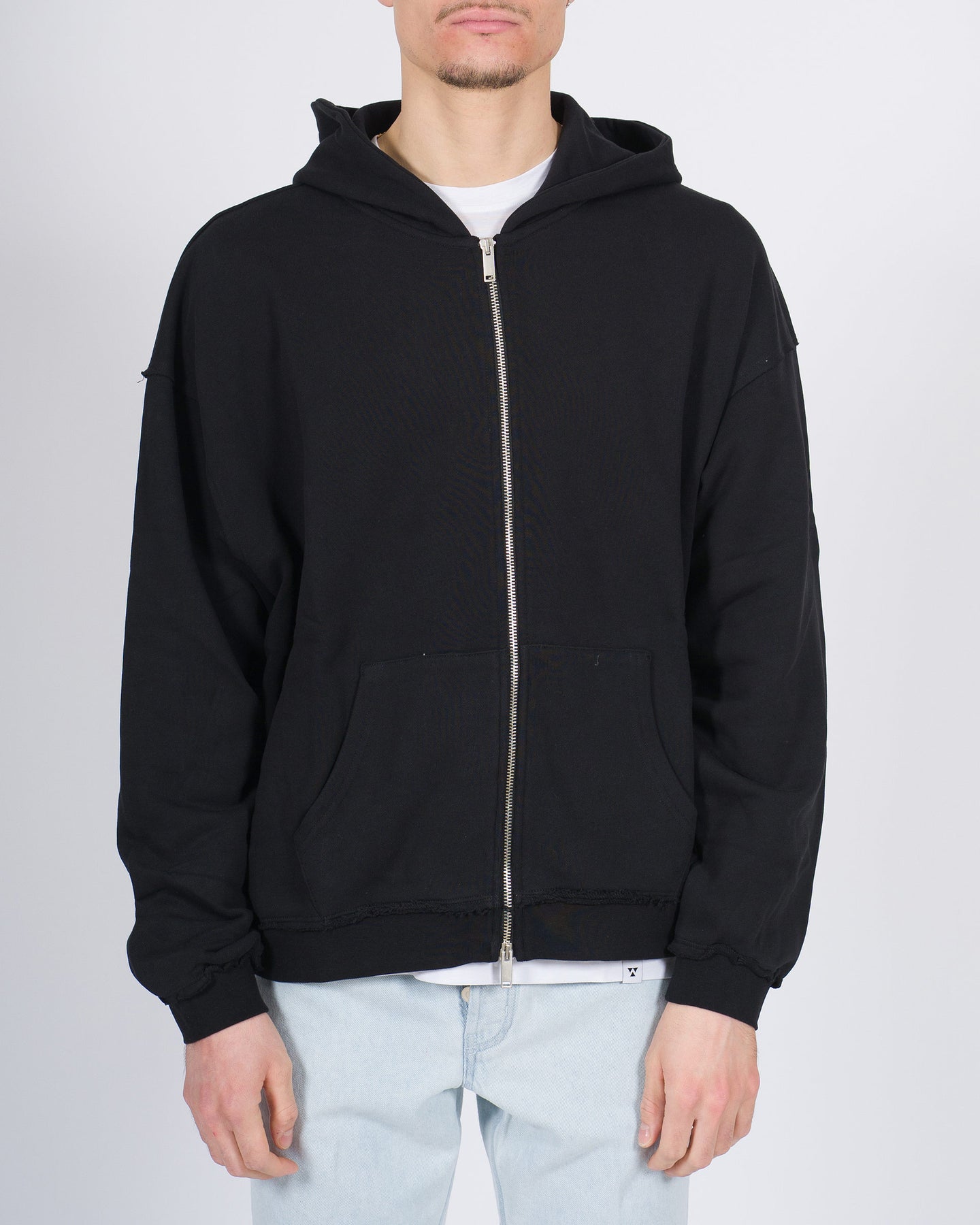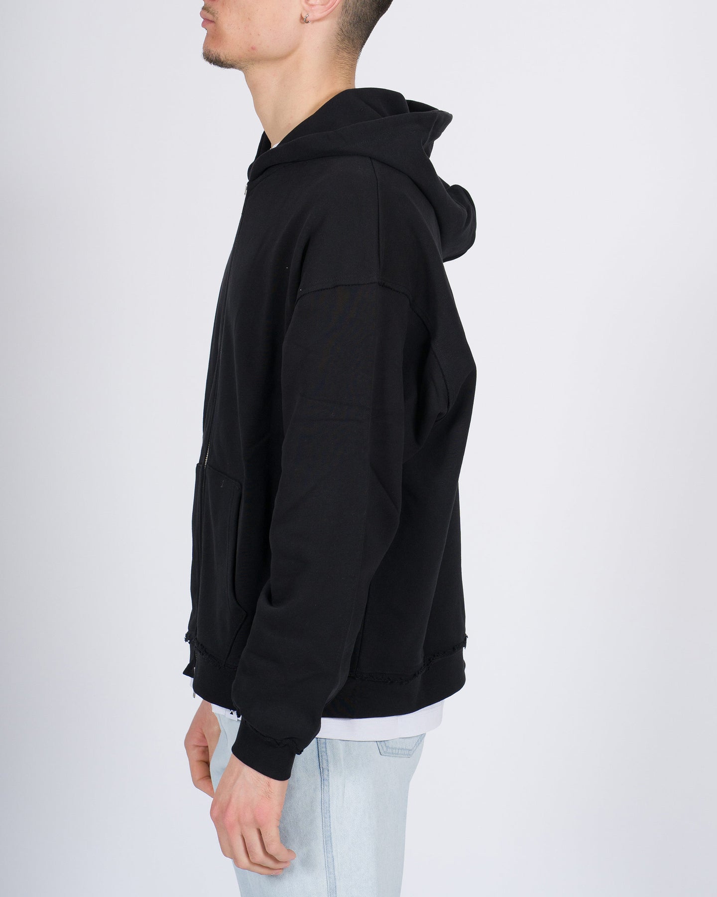 Felpa over in morbido tessuto jersey nero, con cappuccio e chiusura full zip. Vestibilità ampia e confortevole, perfetta per un look casual contemporaneo e versatile, facile da abbinare in ogni outfit quotidiano.