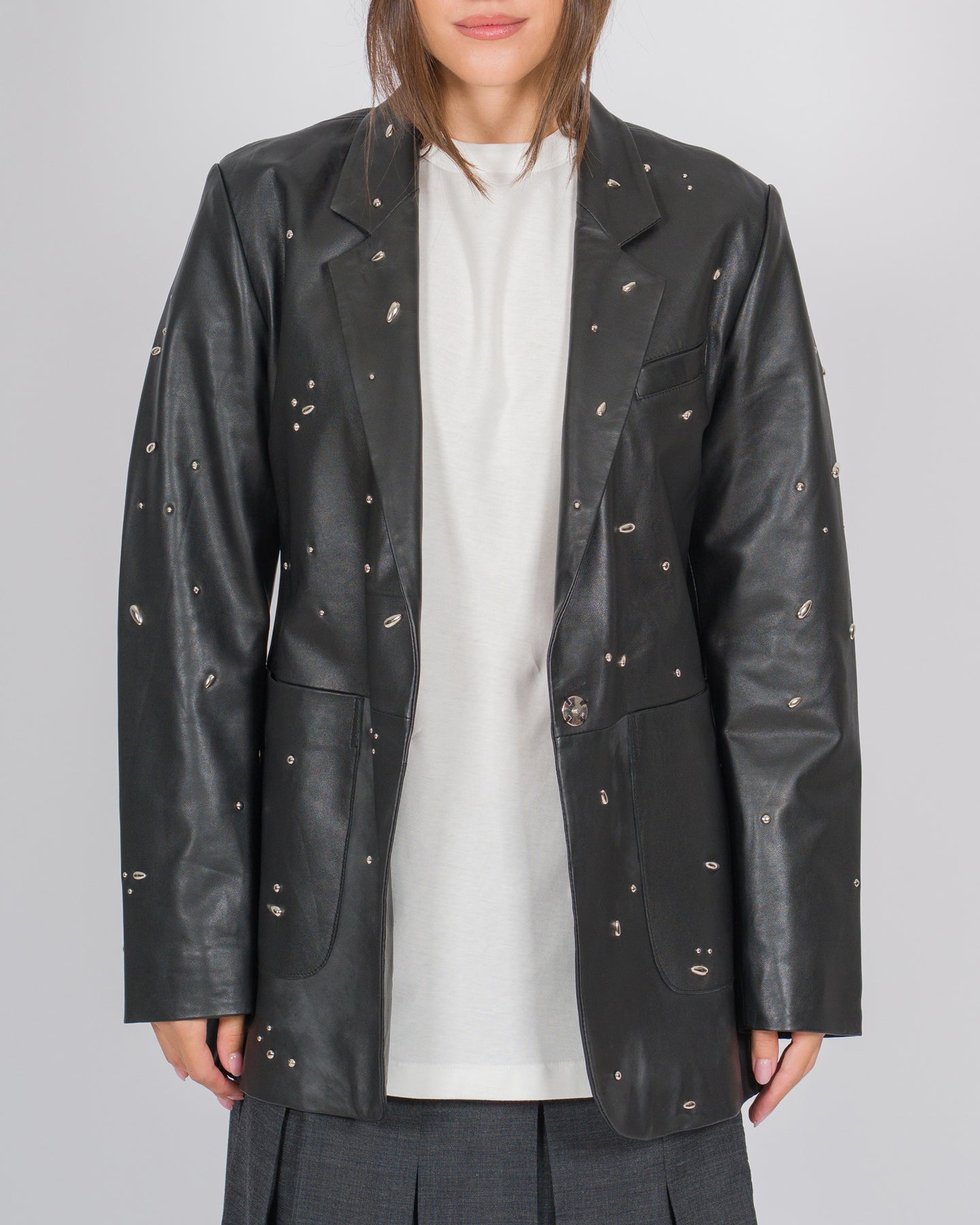 Questo blazer firmato Alysi fonde il carattere deciso della pelle con dettagli contemporanei. Realizzato in pelle nera di qualità, presenta una vestibilità over e tasche a toppa, per un look rilassato e moderno. Le applicazioni decorative aggiungono un tocco distintivo e creativo, rendendo il capo perfetto per outfit urbani e sofisticati. La linea versatile consente di abbinarlo sia a pantaloni sartoriali sia a denim per un effetto più casual-chic.Dettagli prodotto:Colore: neroMateriale: pelleVestibilità overTasche a toppaApplicazioni decorativeLinea moderna e contemporanea