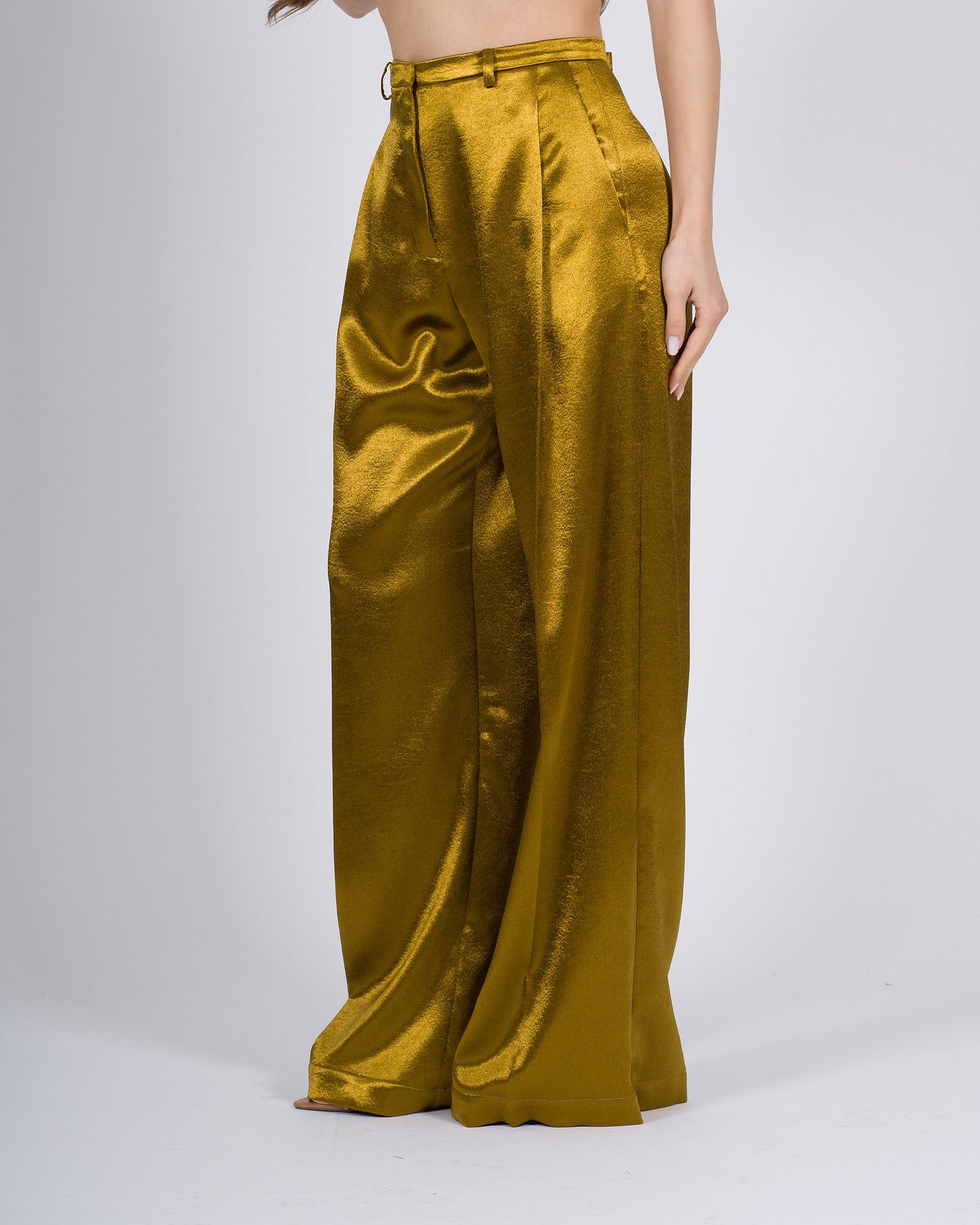 Lusso discreto, riflessi raffinati, design contemporaneo.I pantaloni ALYSI in bronzo lucido esaltano la figura con una linea elegante e una texture luminosa, per un look sofisticato e di grande impatto.