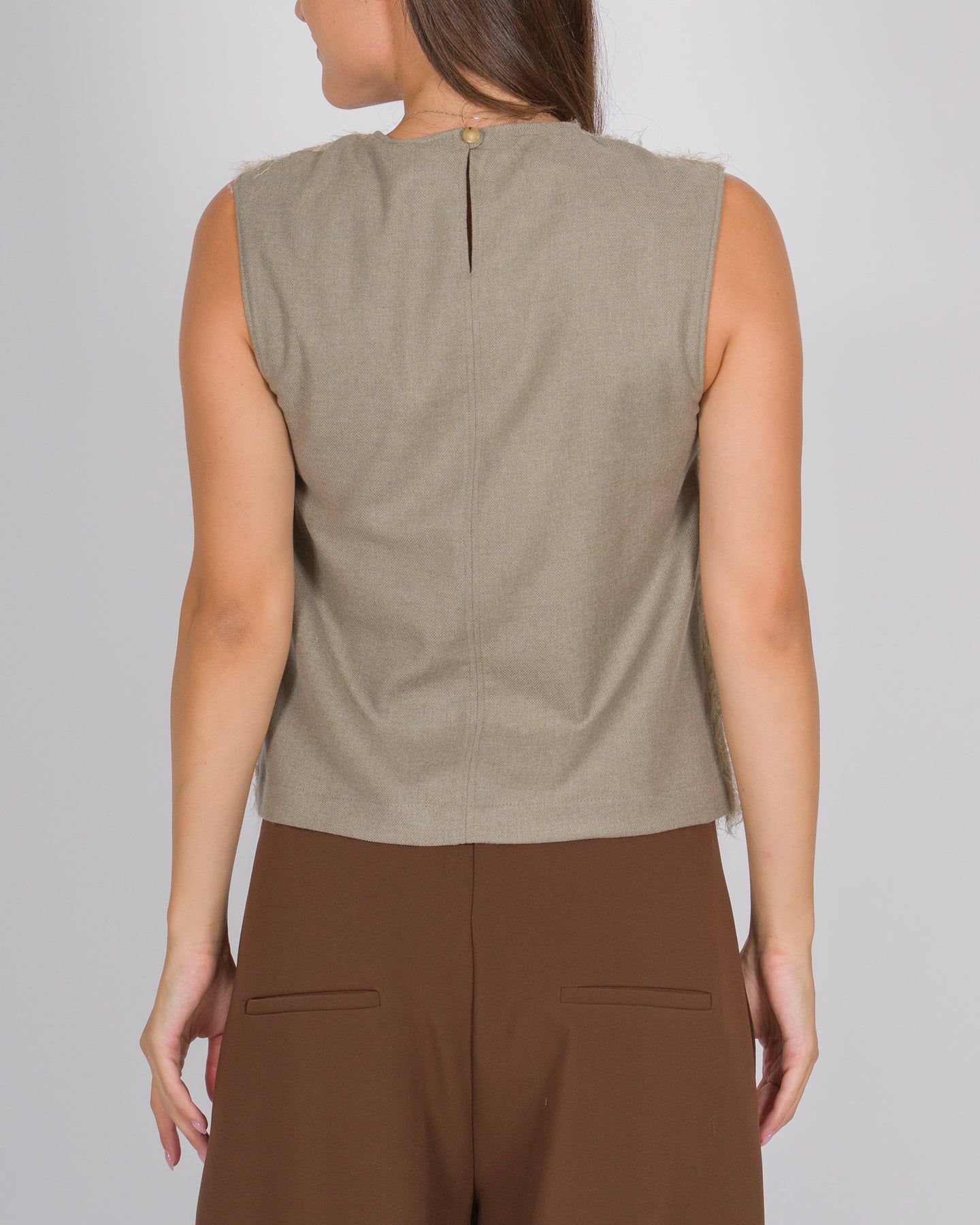Un capo essenziale dal carattere sofisticato, questo top senza maniche di Alysi gioca sui contrasti materici. Il davanti, in una morbida lavorazione a effetto pelo color beige, dona un aspetto soffice e ricercato, mentre il retro è realizzato in tessuto di lana liscia, per un finish elegante e contemporaneo. Il taglio minimal a giro manica e lo scollo rotondo ne esaltano la versatilità, rendendolo perfetto sia come protagonista del look che come elemento da stratificare sotto giacche o capi sartoriali.Dettagli prodotto:Colore: beigeDavanti in effetto peloRetro in tessuto lanaModello senza maniche / giro manicaScollo rotondoLinea essenziale