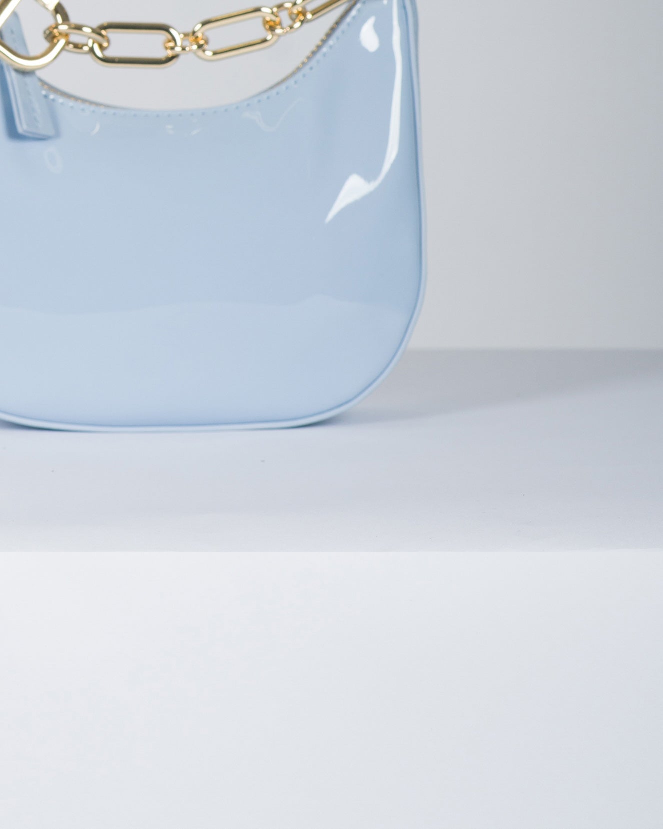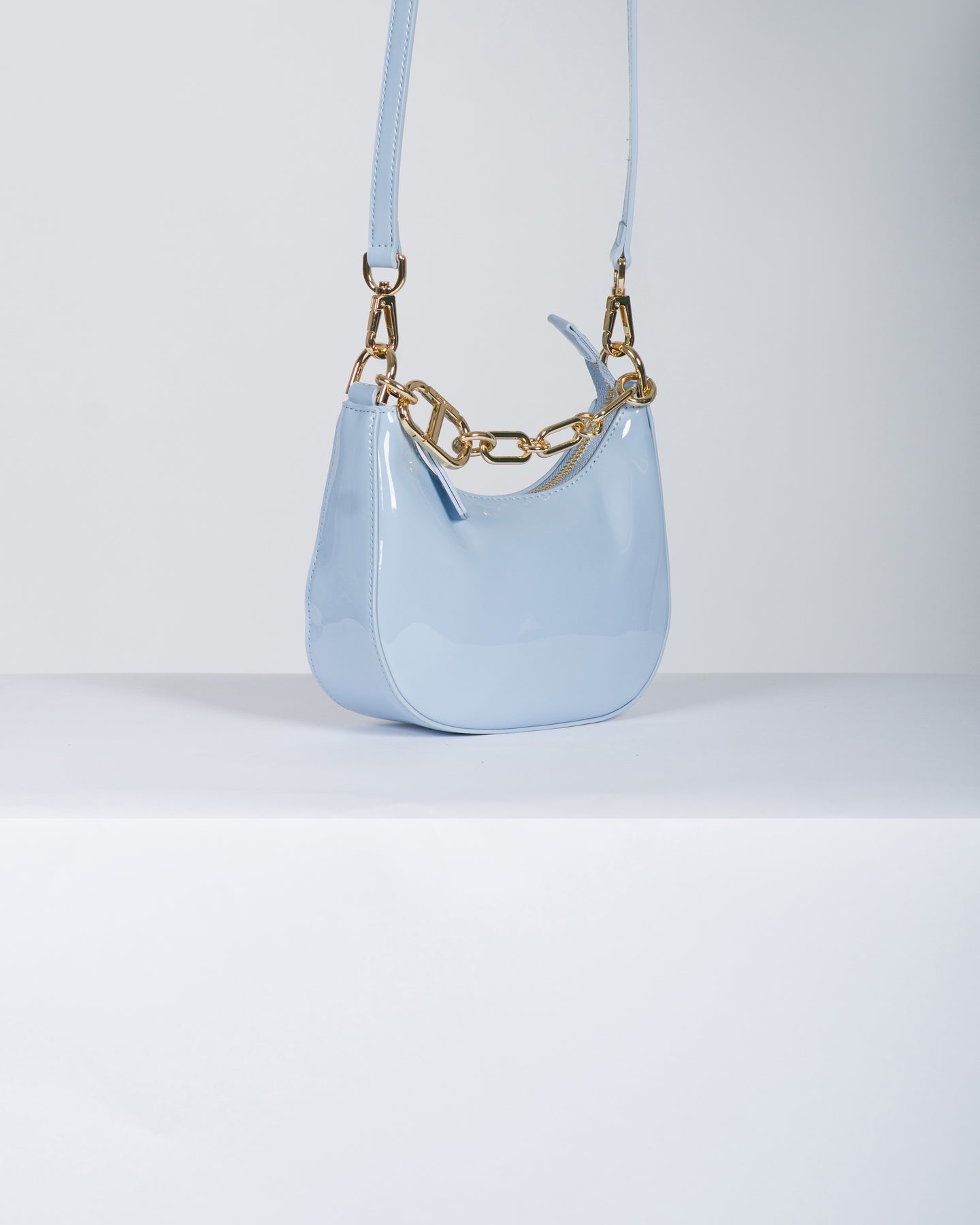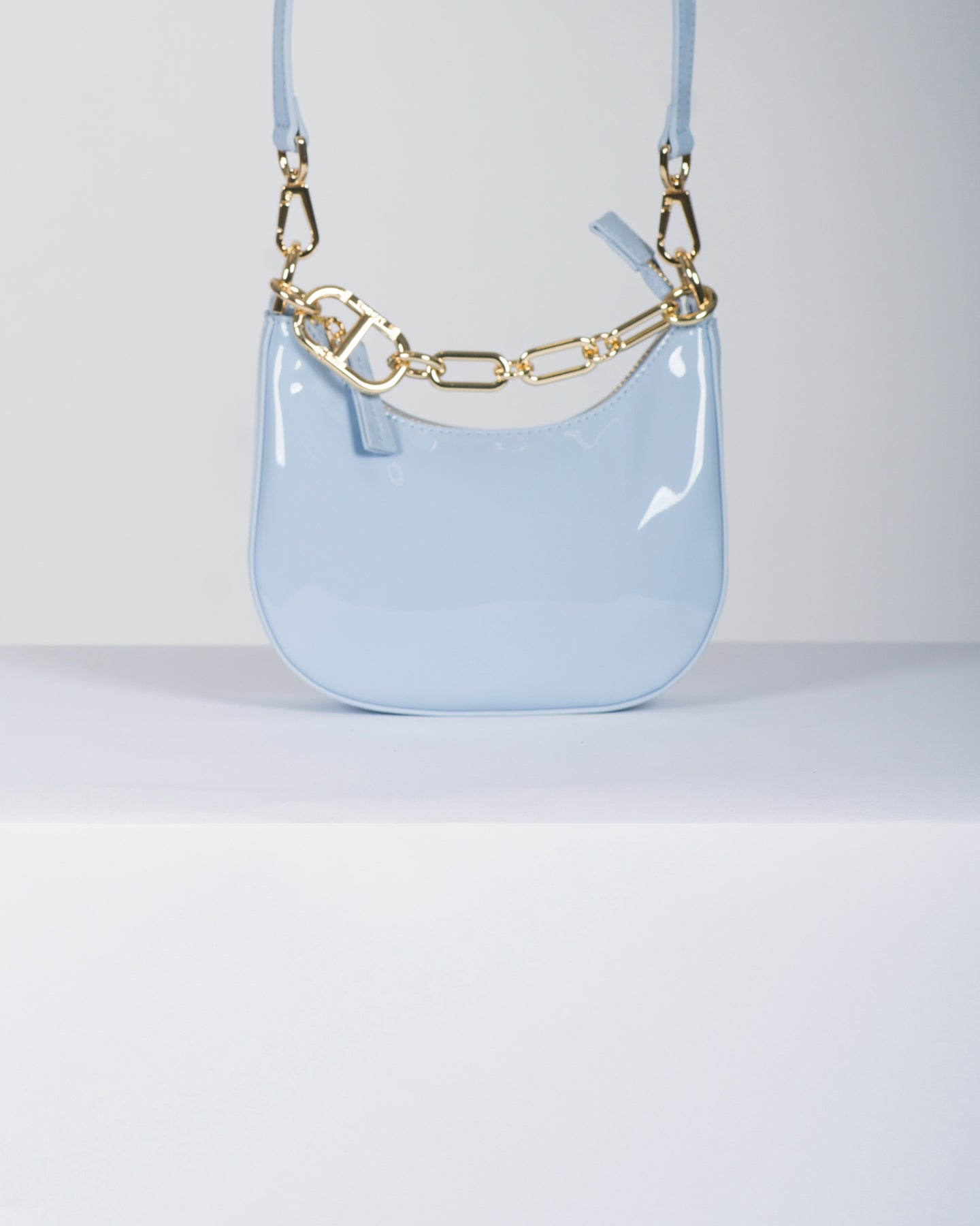 Borsa hobo 'Mini Croissant' effetto vernice con catena e moschettone Oval T in metallo. Ha la chiusura con zip, la tracolla rimovibile cross-body o a spalla, le galvaniche coloro oro, foderata.