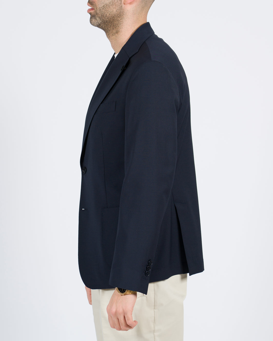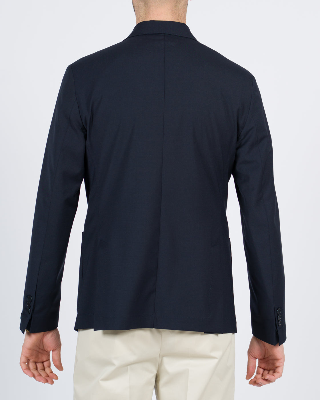 Giacca monopetto due bottoni con revers a specchio e tasche a toppa, tessuto lana vergine.Il modello è alto 1,90 cm e indossa la taglia 52