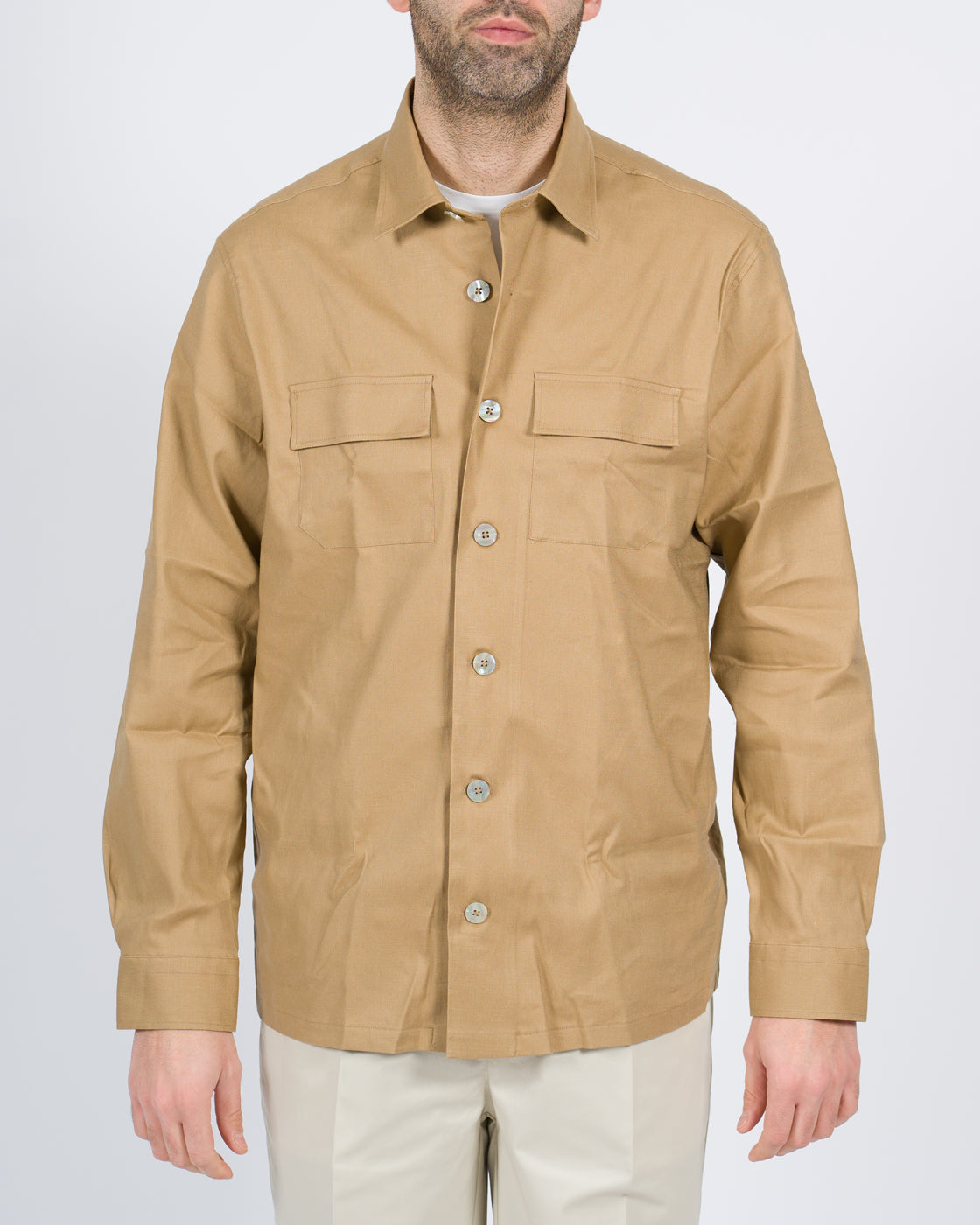 Camicia over tessuto lino e cotone con chiusura bottoni, tasconi anteriorie tasche a filo.Il modello è alto 1,90 cm e indossa la taglia L