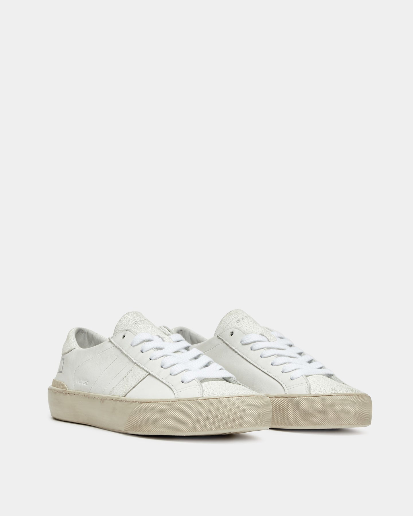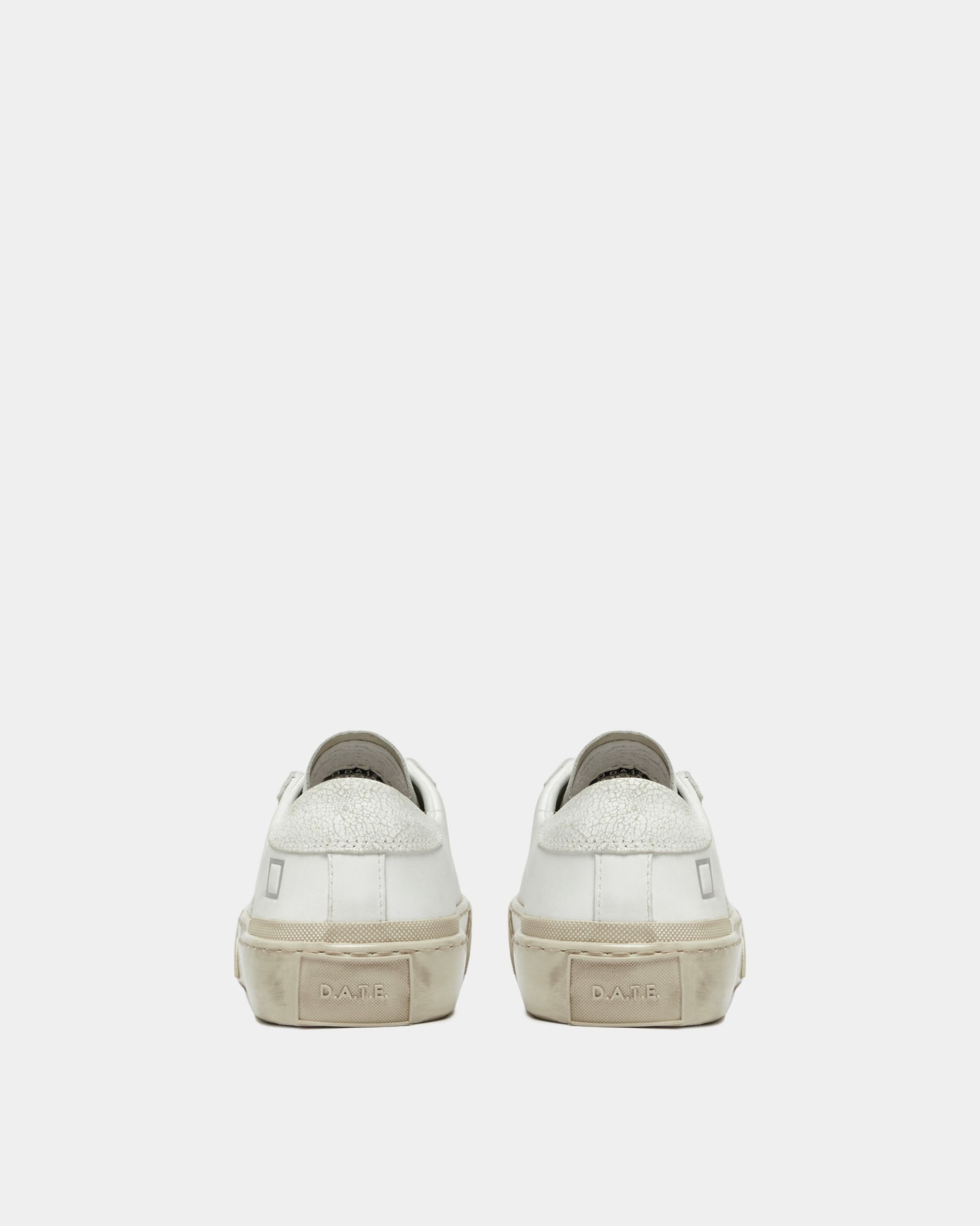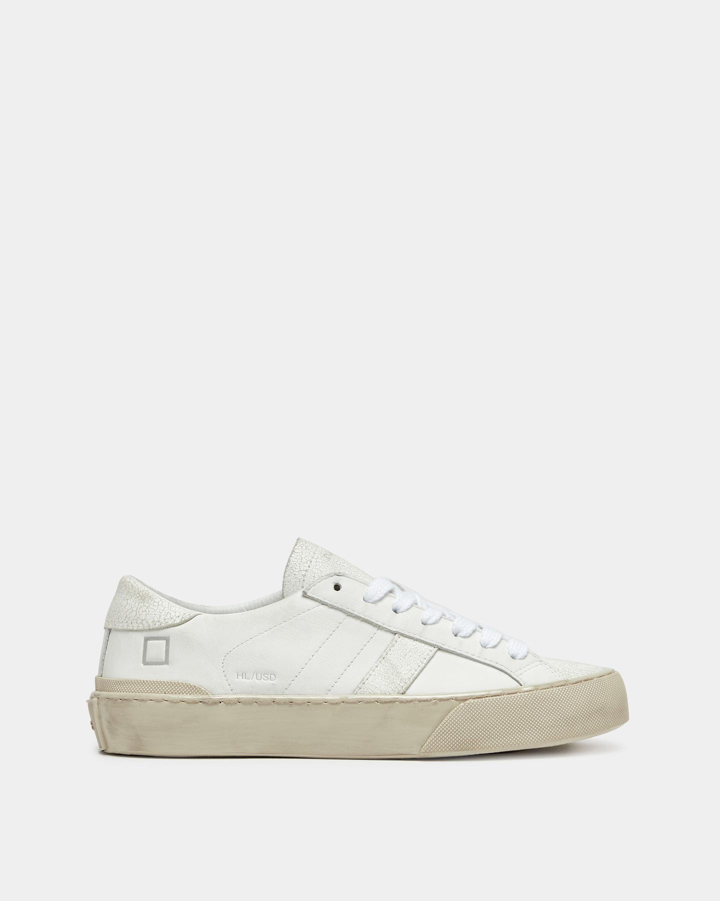 Sneaker bassa in pelle colore bianco con effetto used.-La punta e la linguetta, su cui è impressa la scritta D.A.T.E., sono in pelle craquelé.-I lacci sono in cotone e il logo quadrato e il codice sono impressi lateralmente.-La banda laterale è in pelle bianca effetto craquelé.-Il talloncino posteriore è in pelle bianca effetto craquelé.-Fodera in pelle e spugna di cotone.-Il soletto interno è rialzato di 2.5 cm per un miglior comfort.-La suola in gomma lucida, alta 2.5 cm, è cucita e leggermente sporcata per donare un effetto used.-Patch in gomma logata sulla parte posteriore della suola.-Tutti i materiali selezionati sono Made in Italy.-Vestibilità: REGULAR