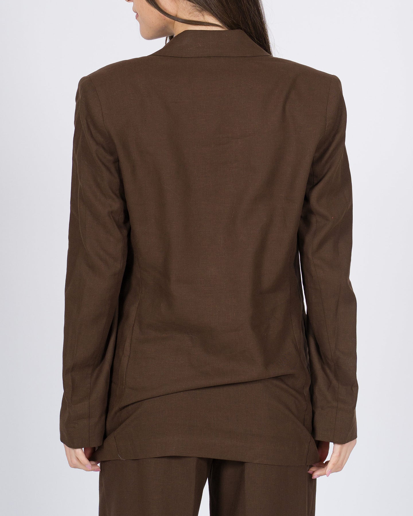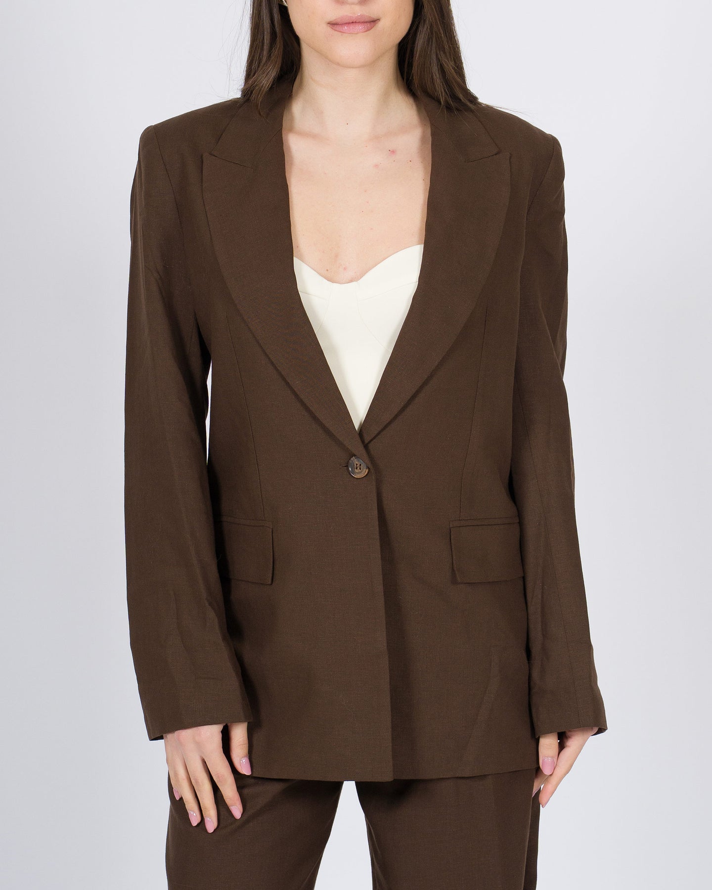 Il blazer monopetto color marrone di Access Fashion è il capo ideale per un look elegante e contemporaneo. Caratterizzato da un raffinato petto a lancia, questo blazer valorizza la silhouette con una linea strutturata e femminile. Le tasche a pattina aggiungono un dettaglio classico e funzionale, mentre il fondo quadrato dona equilibrio e modernità al design.