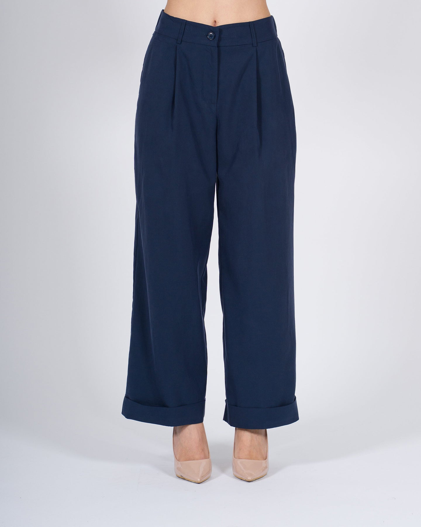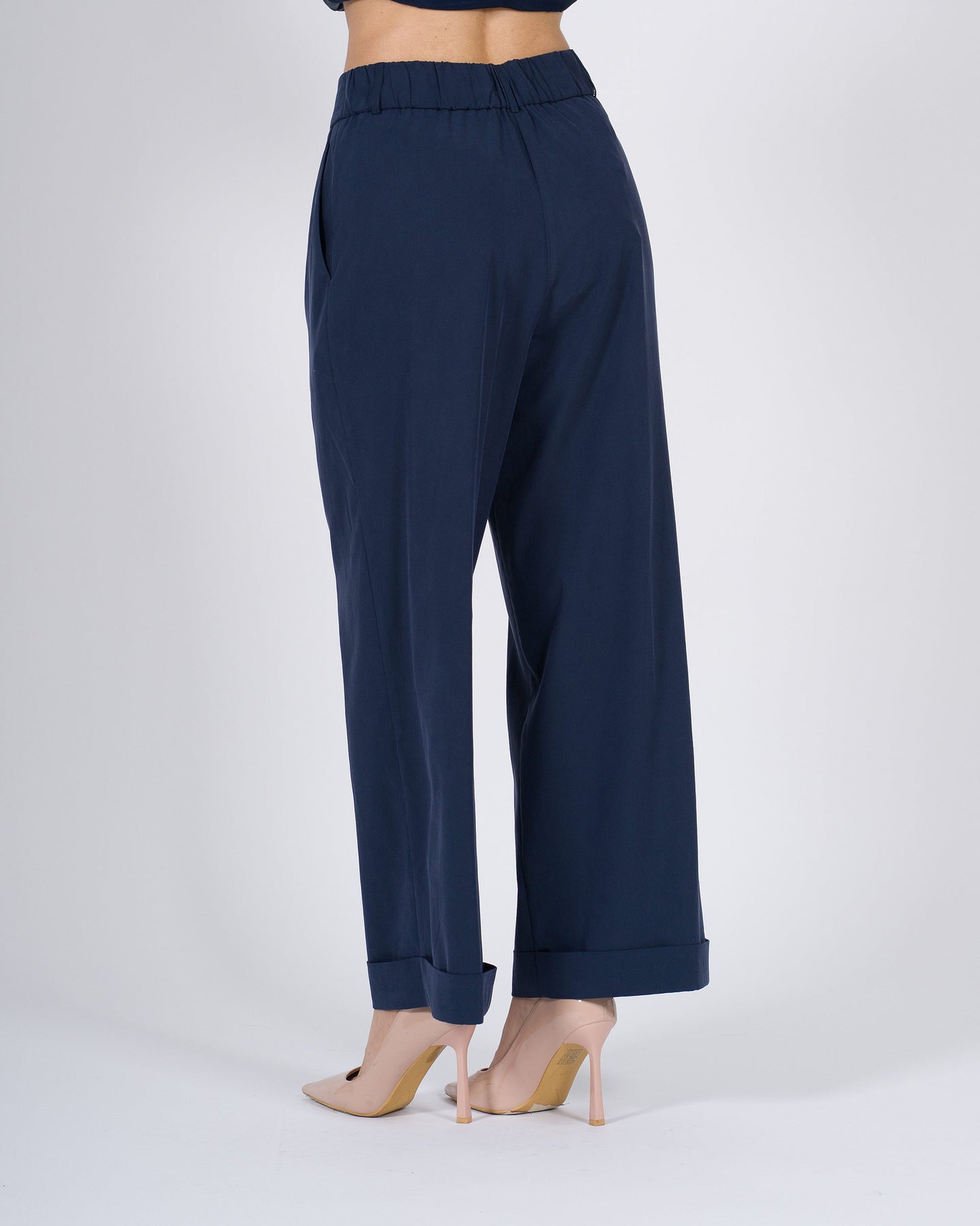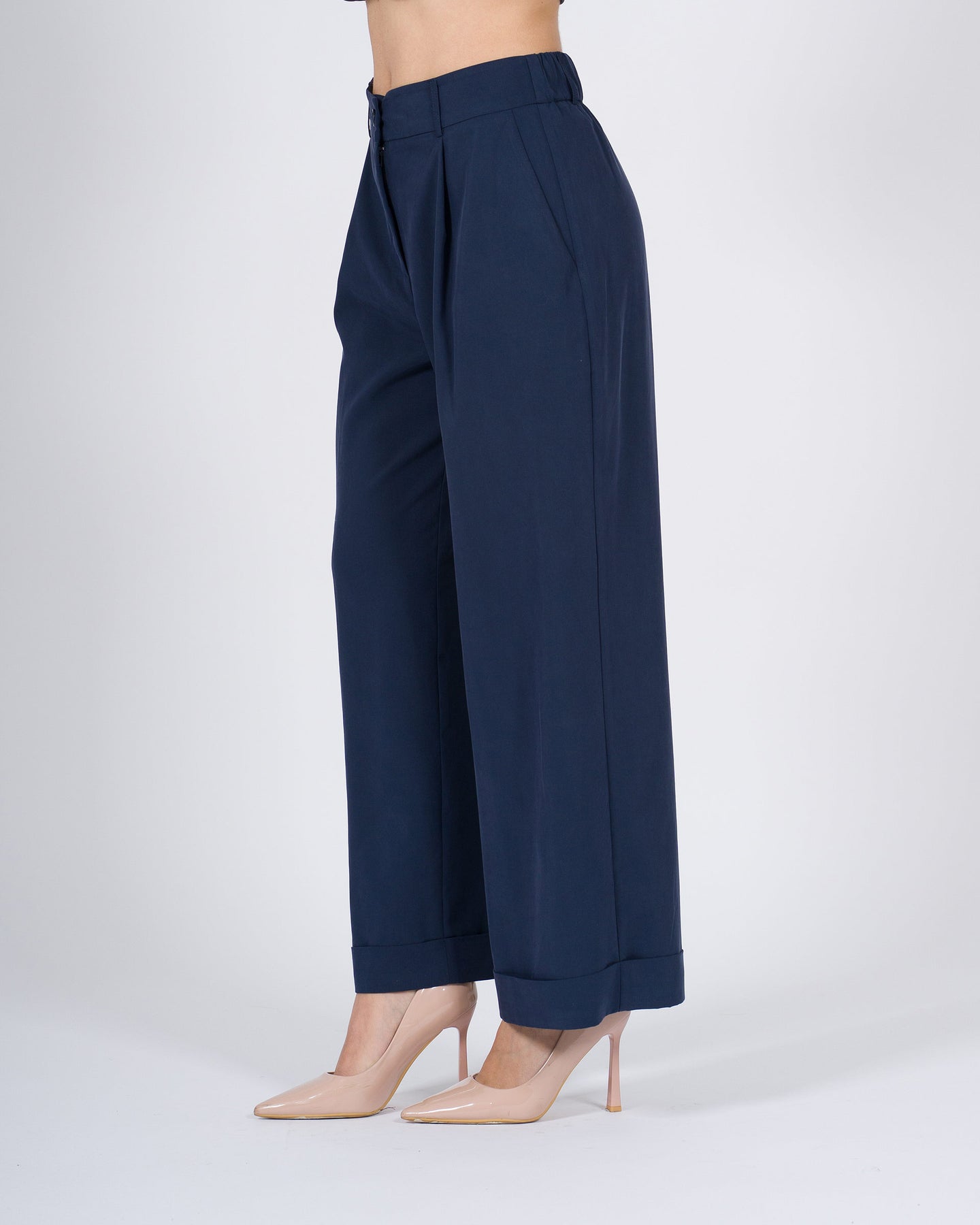 Eleganti pantaloni da donna blu del brand Access Fashion, caratterizzati da un taglio classico con pence che slancia la figura, vita elastica per massimo comfort e risvolto sulle caviglie per un tocco moderno e sofisticato.