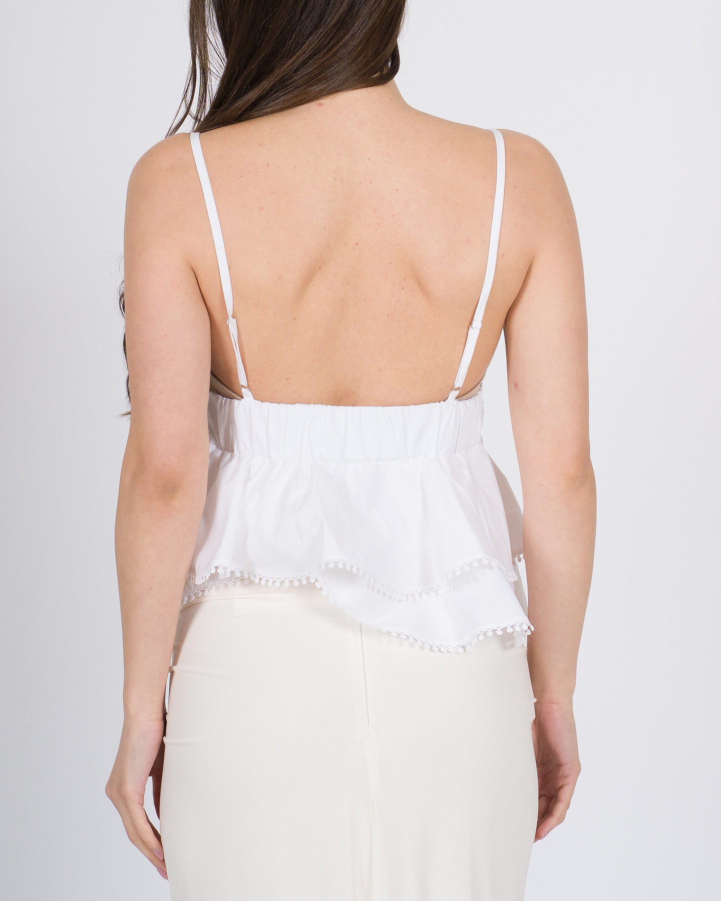 Delicato top da donna bianco del brand Access Fashion, realizzato in cotone leggero e traspirante, perfetto per la stagione primaverile ed estiva. Il modello presenta sottili bretelline e romantiche balze che donano movimento e un tocco femminile al capo.