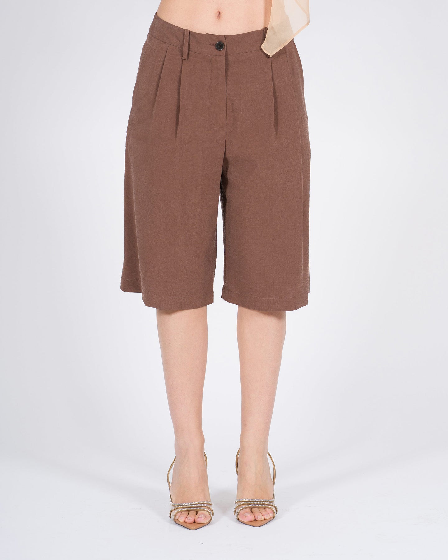 Stile essenziale, linee pulite, eleganza contemporanea.I bermuda ALYSI in cacao combinano una vestibilità comoda a un taglio raffinato, perfetti per un look minimal e sofisticato, ideale per occasioni casual chic.Un capo versatile che unisce comfort e carattere.