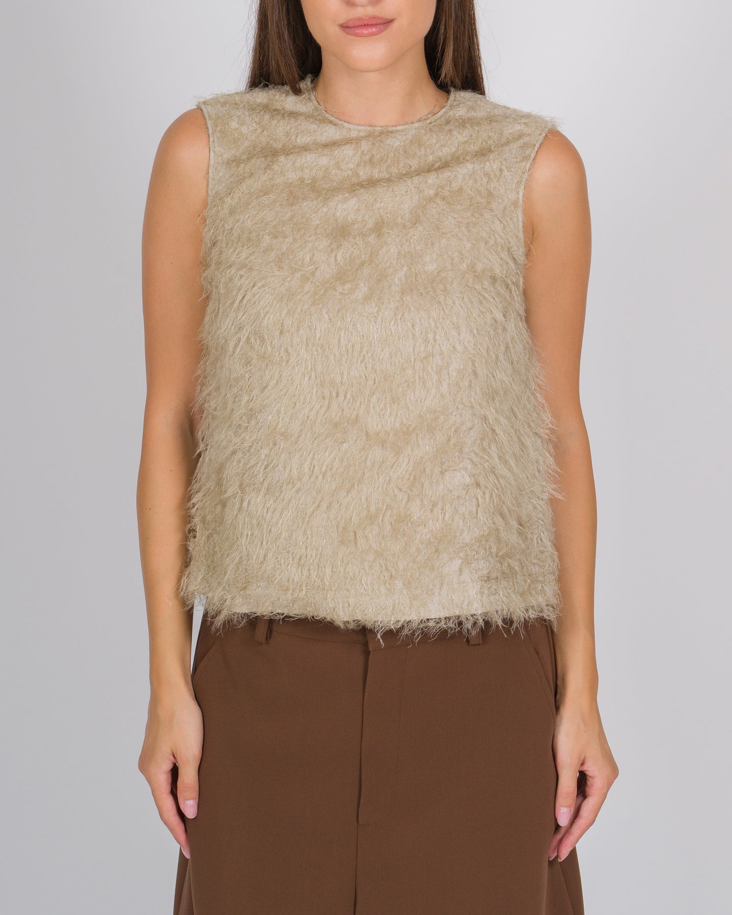 Un capo essenziale dal carattere sofisticato, questo top senza maniche di Alysi gioca sui contrasti materici. Il davanti, in una morbida lavorazione a effetto pelo color beige, dona un aspetto soffice e ricercato, mentre il retro è realizzato in tessuto di lana liscia, per un finish elegante e contemporaneo. Il taglio minimal a giro manica e lo scollo rotondo ne esaltano la versatilità, rendendolo perfetto sia come protagonista del look che come elemento da stratificare sotto giacche o capi sartoriali.Dettagli prodotto:Colore: beigeDavanti in effetto peloRetro in tessuto lanaModello senza maniche / giro manicaScollo rotondoLinea essenziale