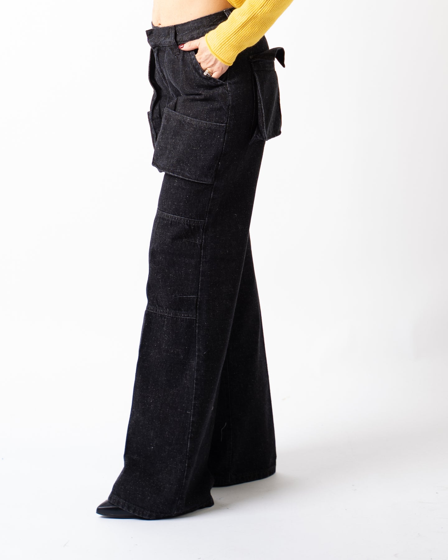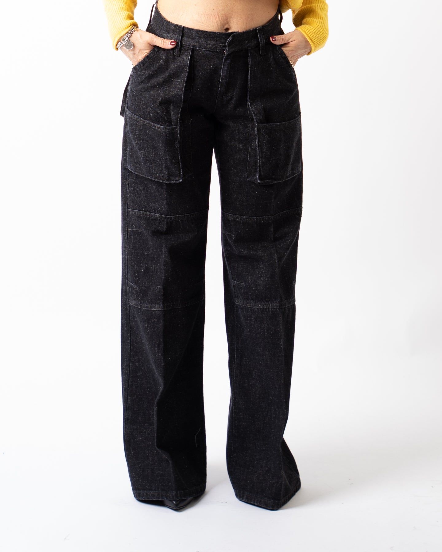 Denim lavaggio scuro, modello cargo, gamba larga, vita alta.