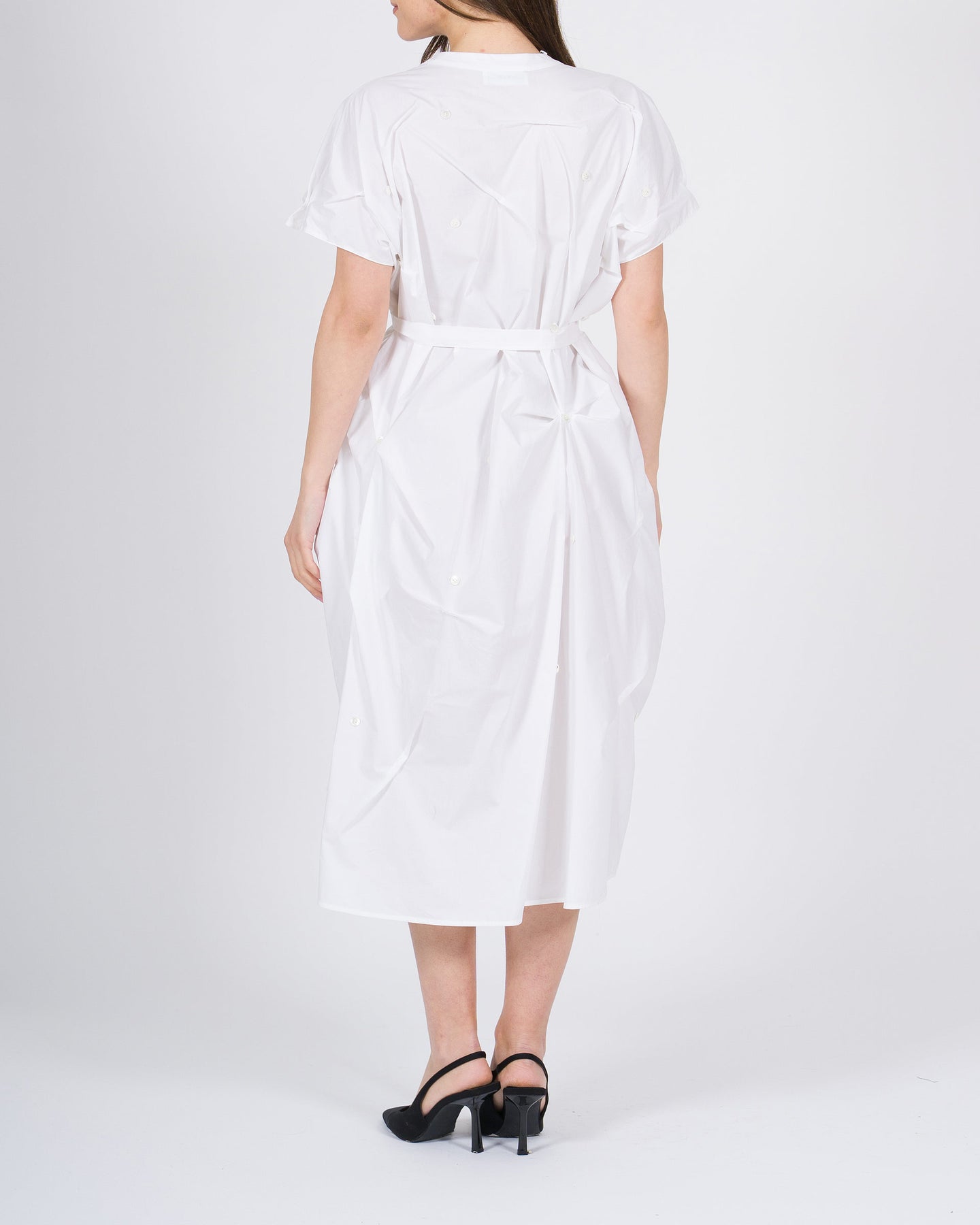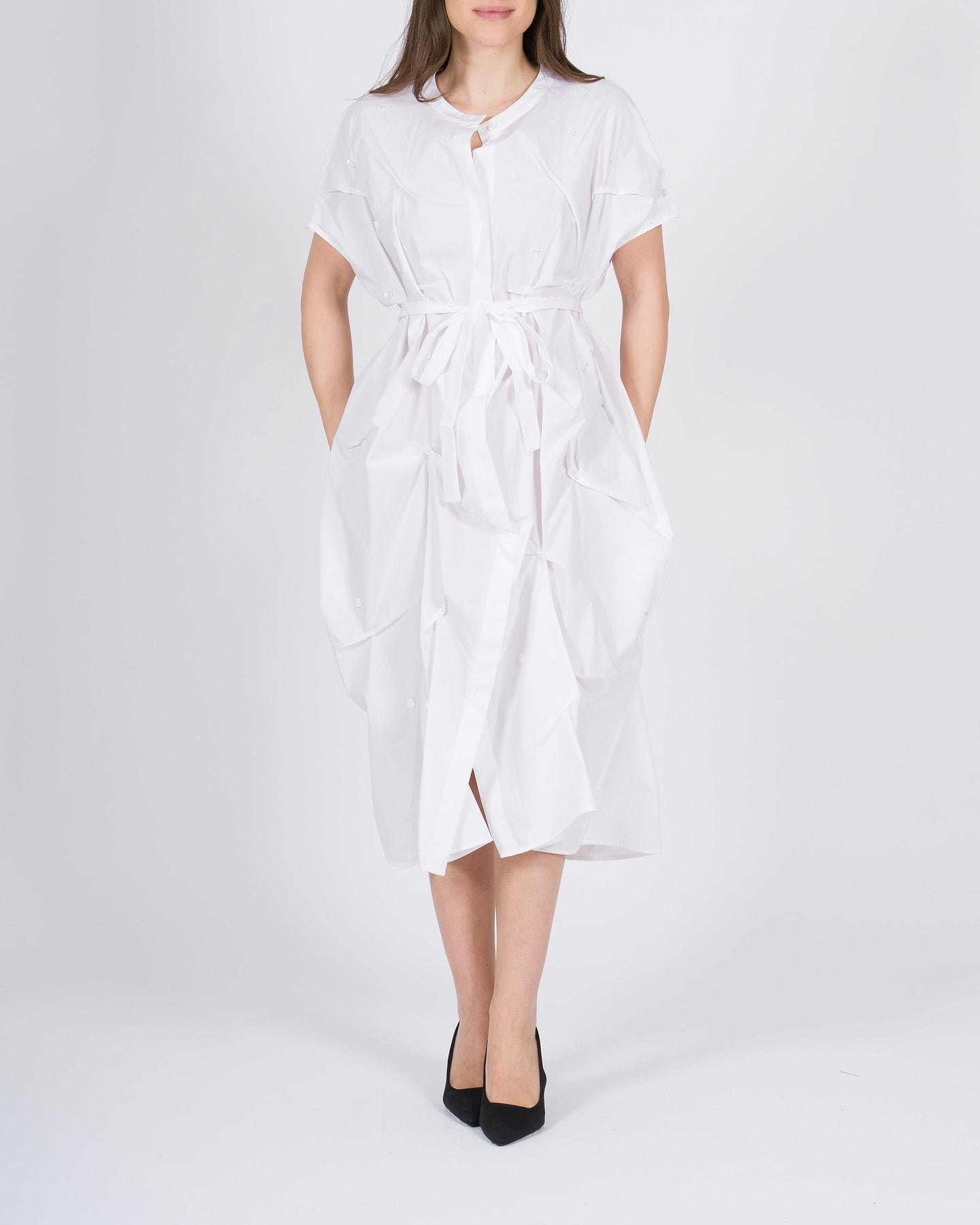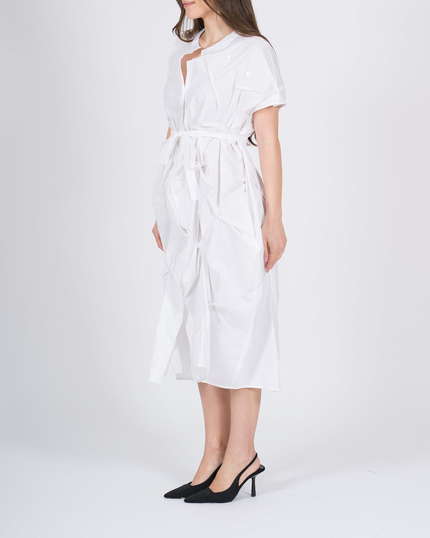 Elegante abito chemisier bianco del brand Meimeij, caratterizzato da un raffinato collo alla pistagna che dona un tocco sofisticato al capo. Il tessuto presenta delicate goffrature, che aggiungono texture e movimento, rendendo l'abito originale e ricercato.Il cinturino in vita valorizza la silhouette e permette di regolare la vestibilità, creando una linea femminile ed elegante. Realizzato in tessuto leggero e confortevole, è perfetto per look eleganti da giorno, ufficio o occasioni speciali.