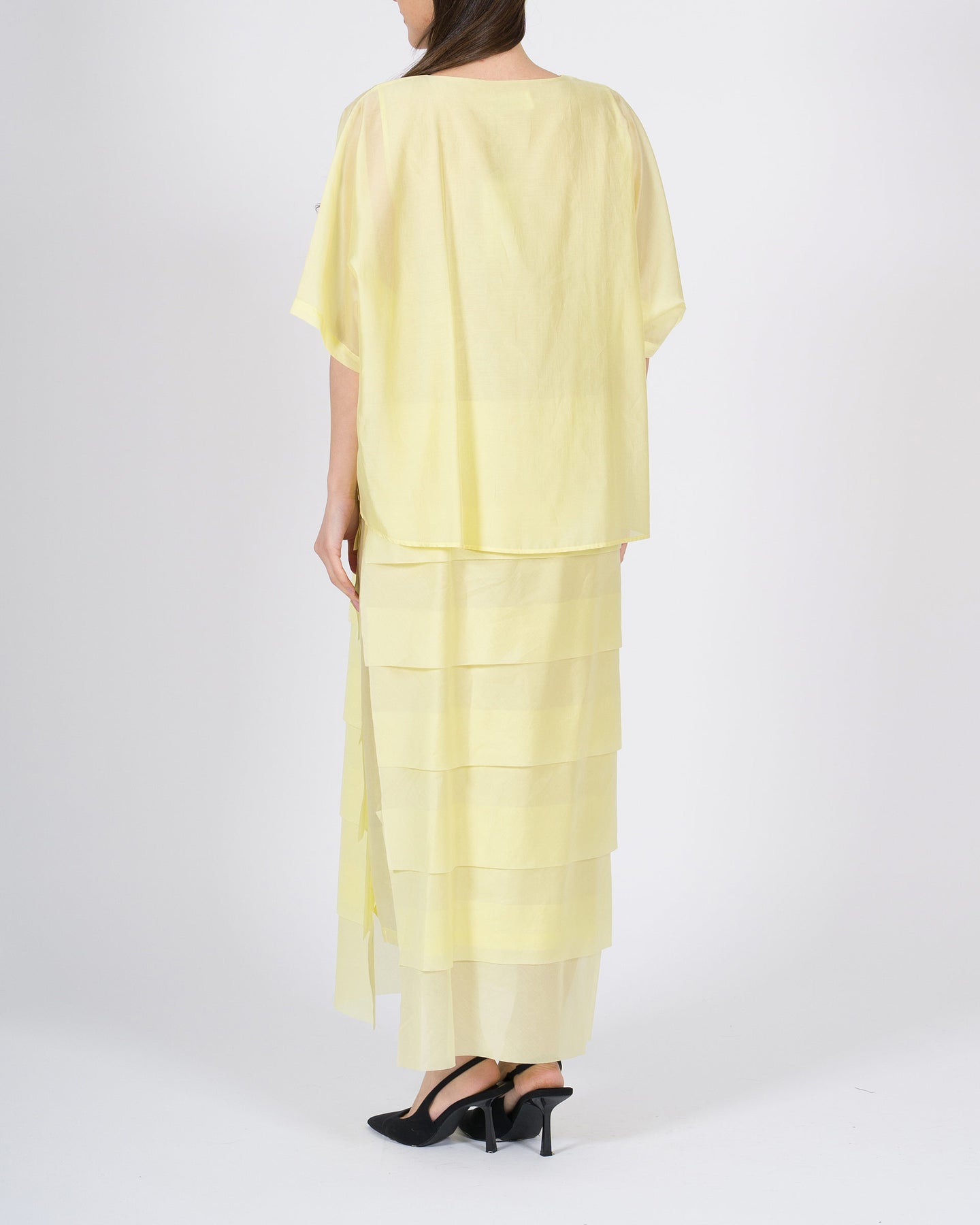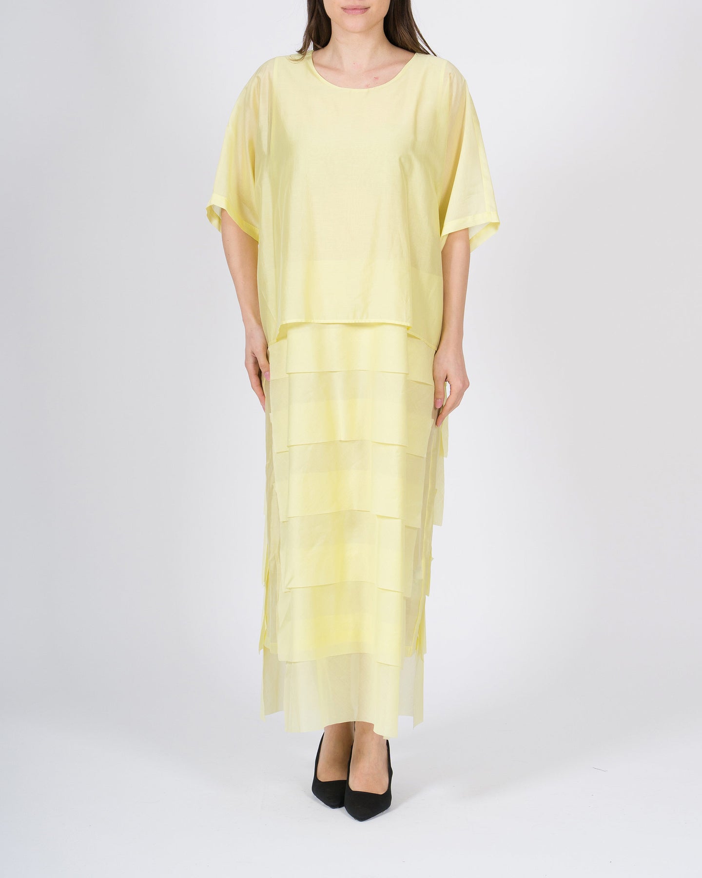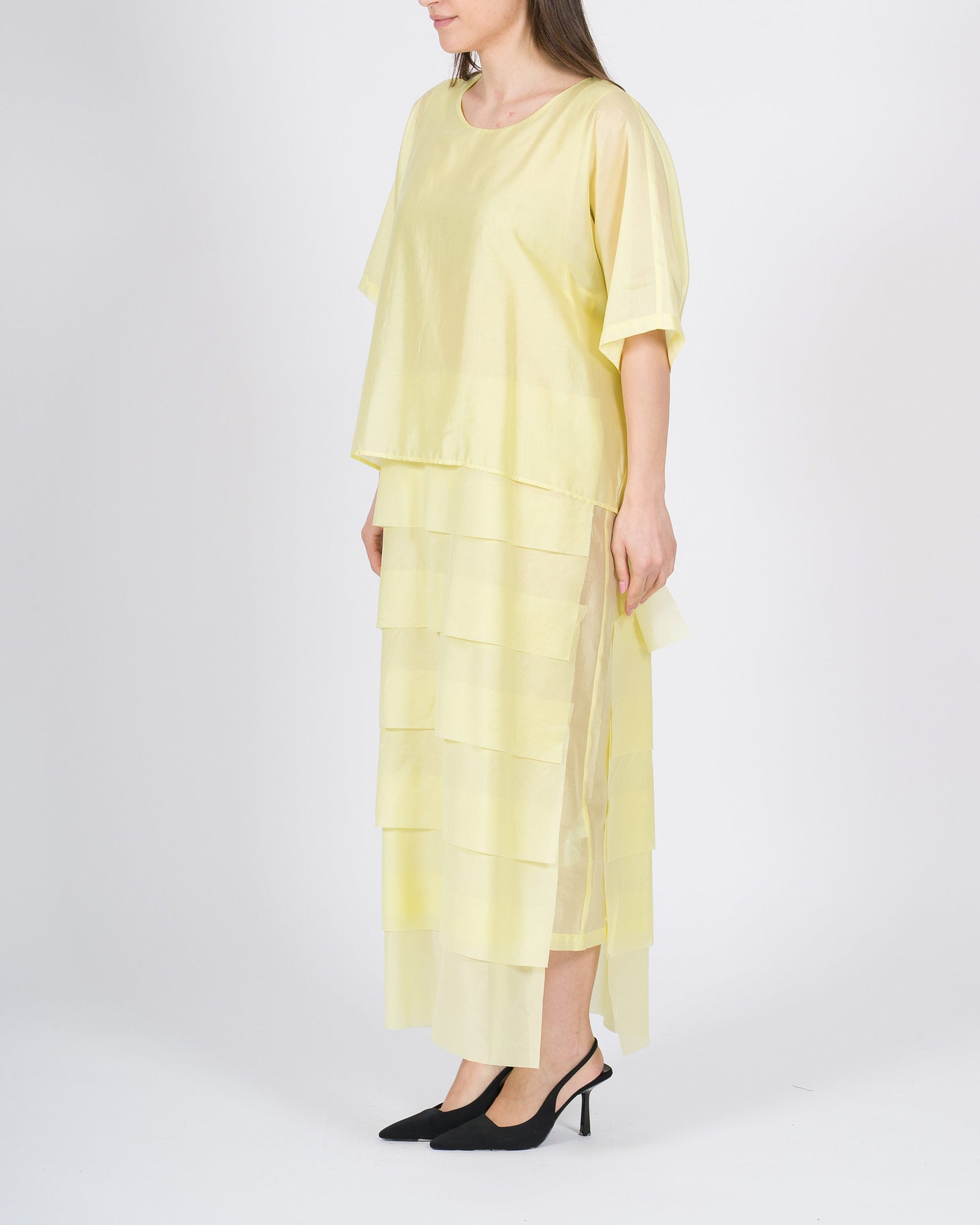 Delicato abito da donna lime del brand Meimeij, realizzato in mussola di cotone leggero e traspirante, ideale per garantire comfort e freschezza durante la stagione calda. Il modello presenta balze morbide lungo il capo, che aggiungono movimento e un tocco femminile, mantenendo una linea dritta che valorizza la silhouette senza aderire eccessivamente.Perfetto per look estivi, giornate all'aperto o occasioni casual chic, facile da abbinare a sandali, ballerine o accessori minimal per un outfit leggero e raffinato.
