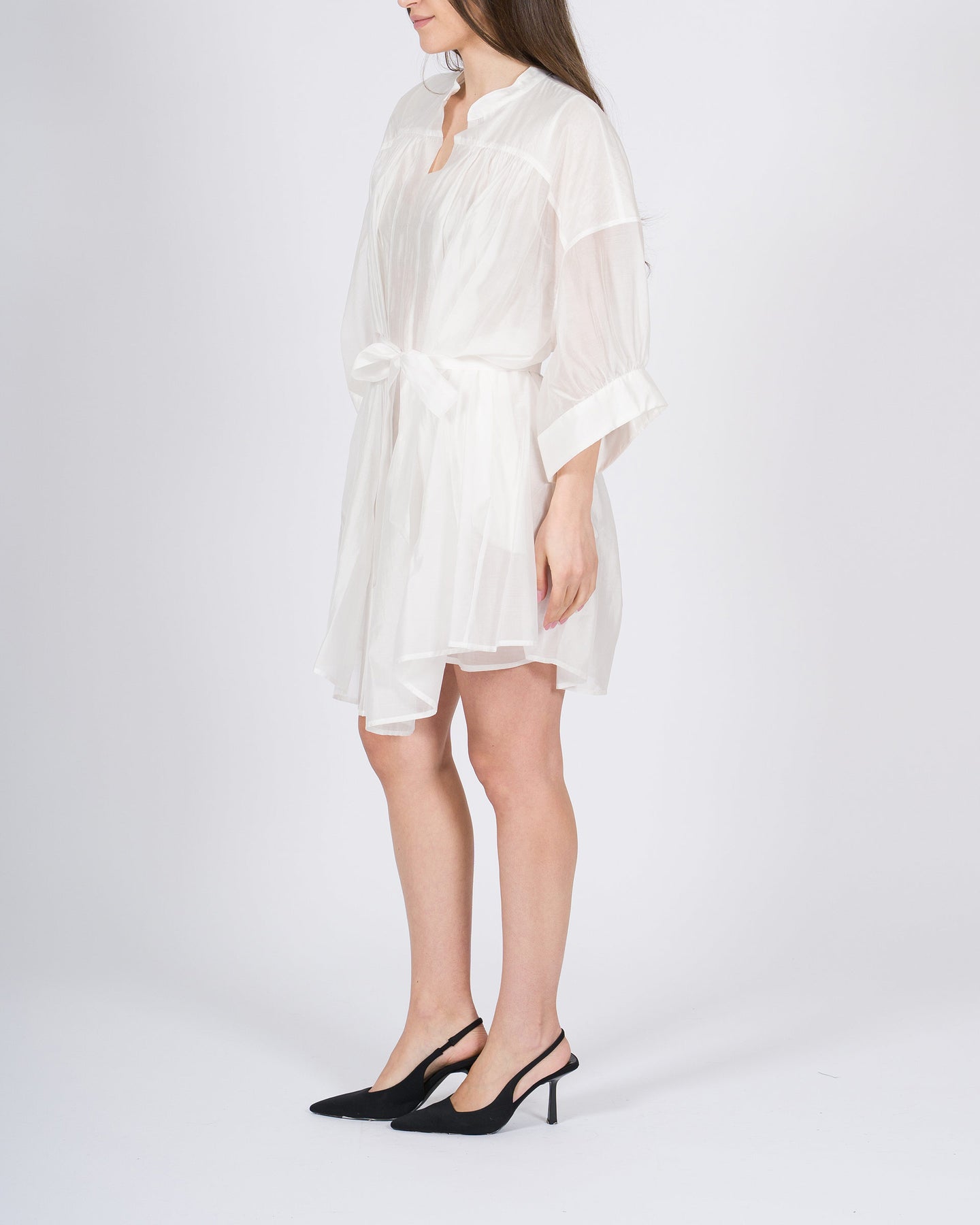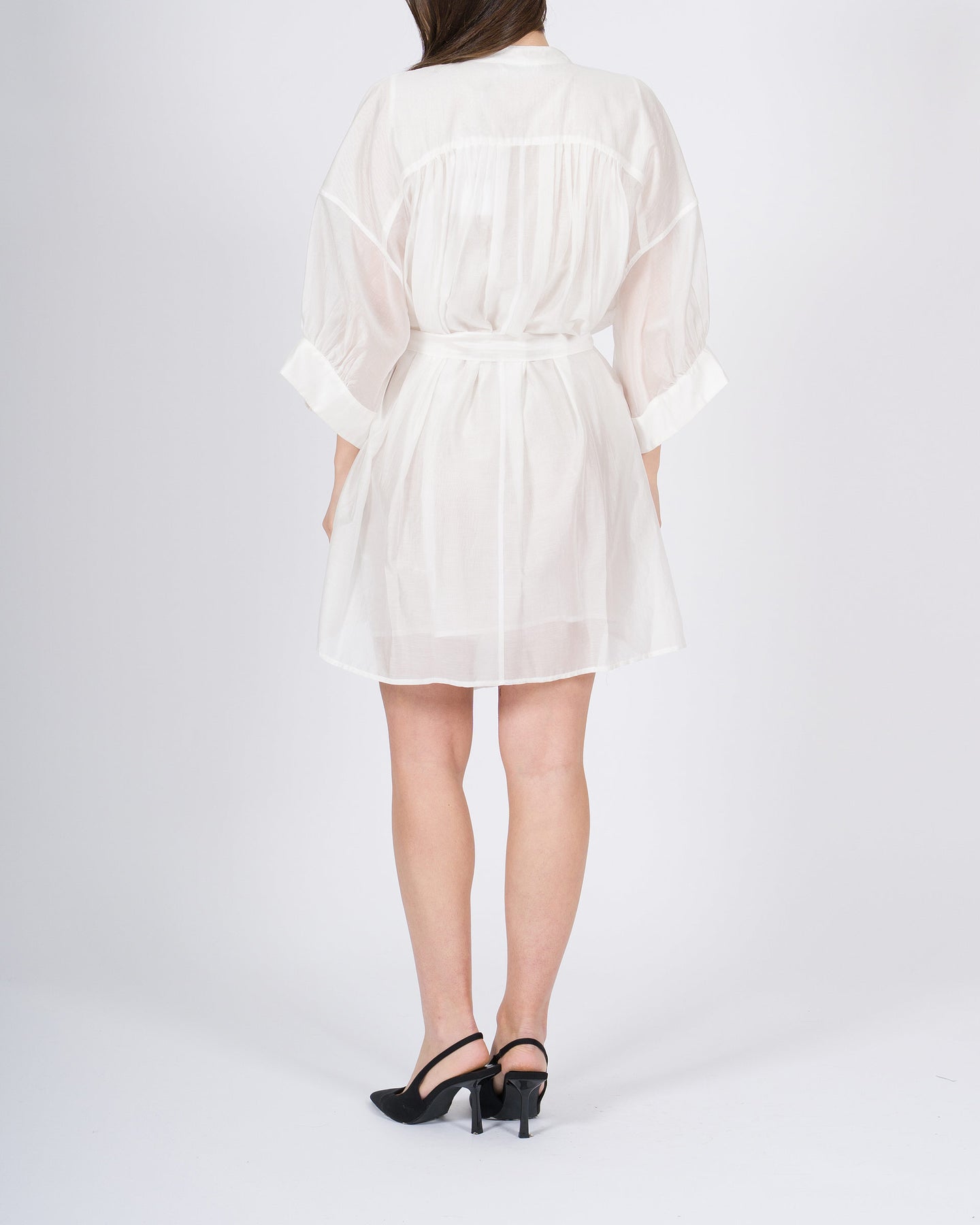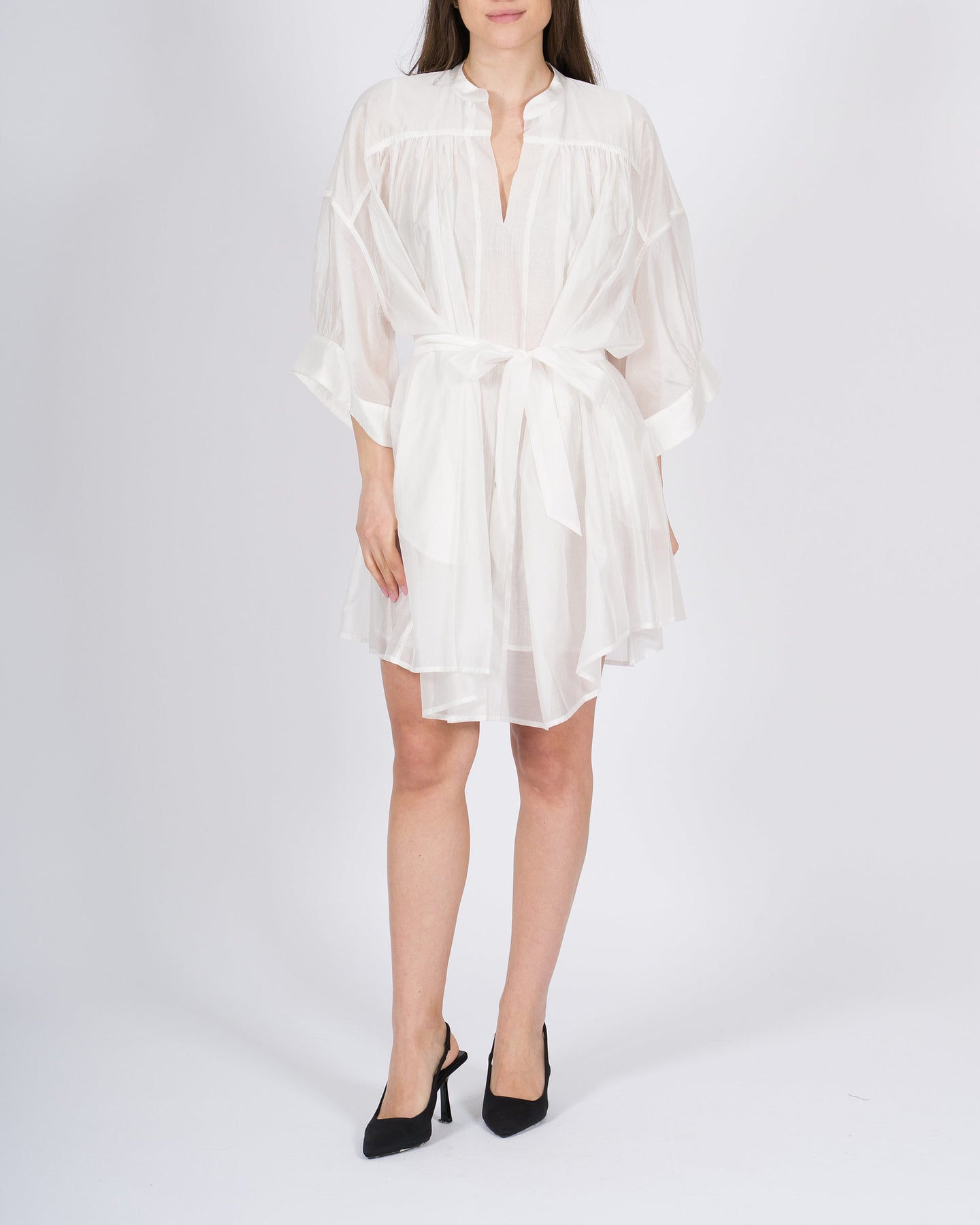 Scopri l'eleganza naturale con questo abito Meimeij in mussola di cotone color bianco. La vestibilità ampia offre massimo comfort, mentre la fusciacca in vita valorizza delicatamente la silhouette. Leggero e traspirante, è perfetto da indossare dal giorno alla sera, per un look sofisticato ma semplice.