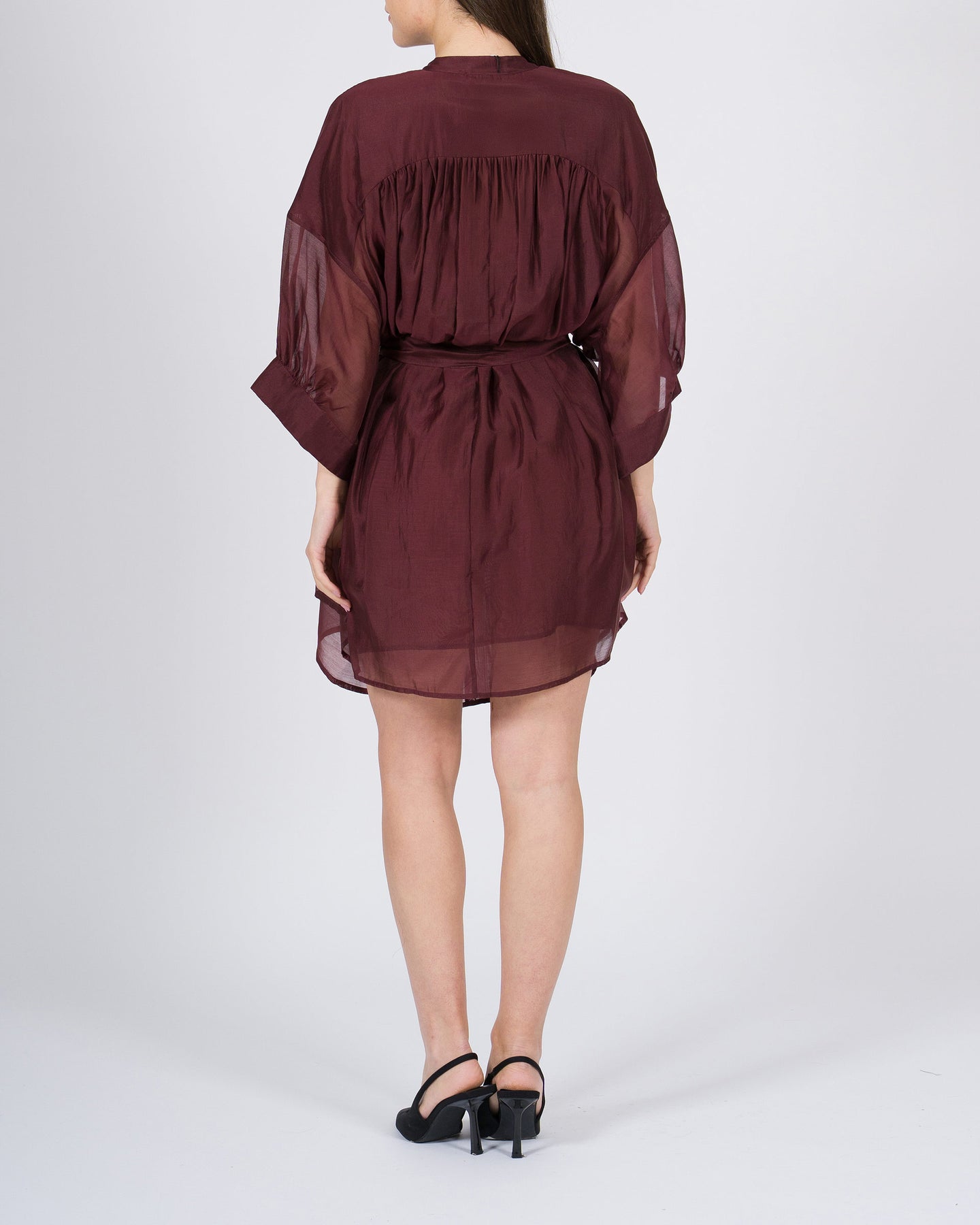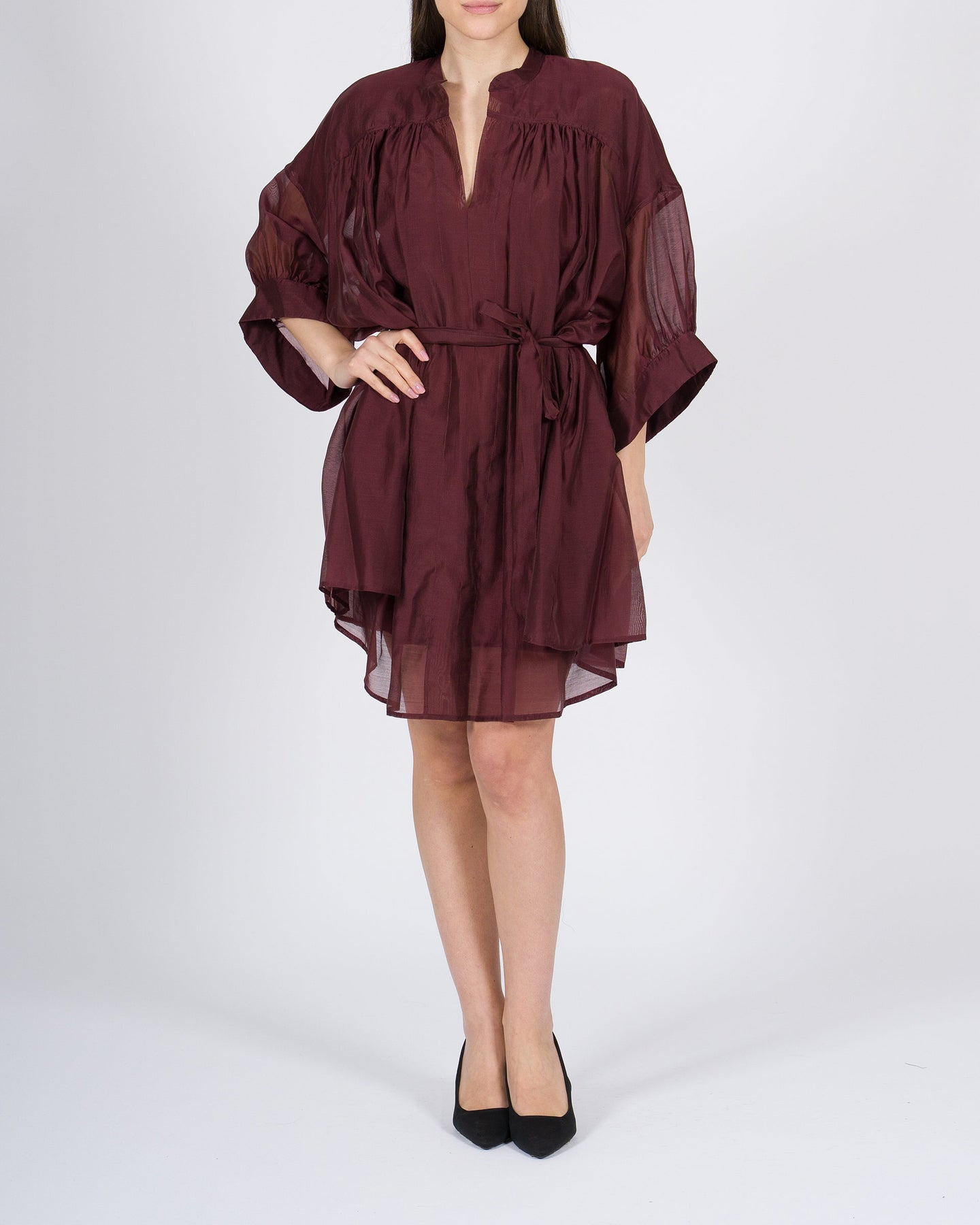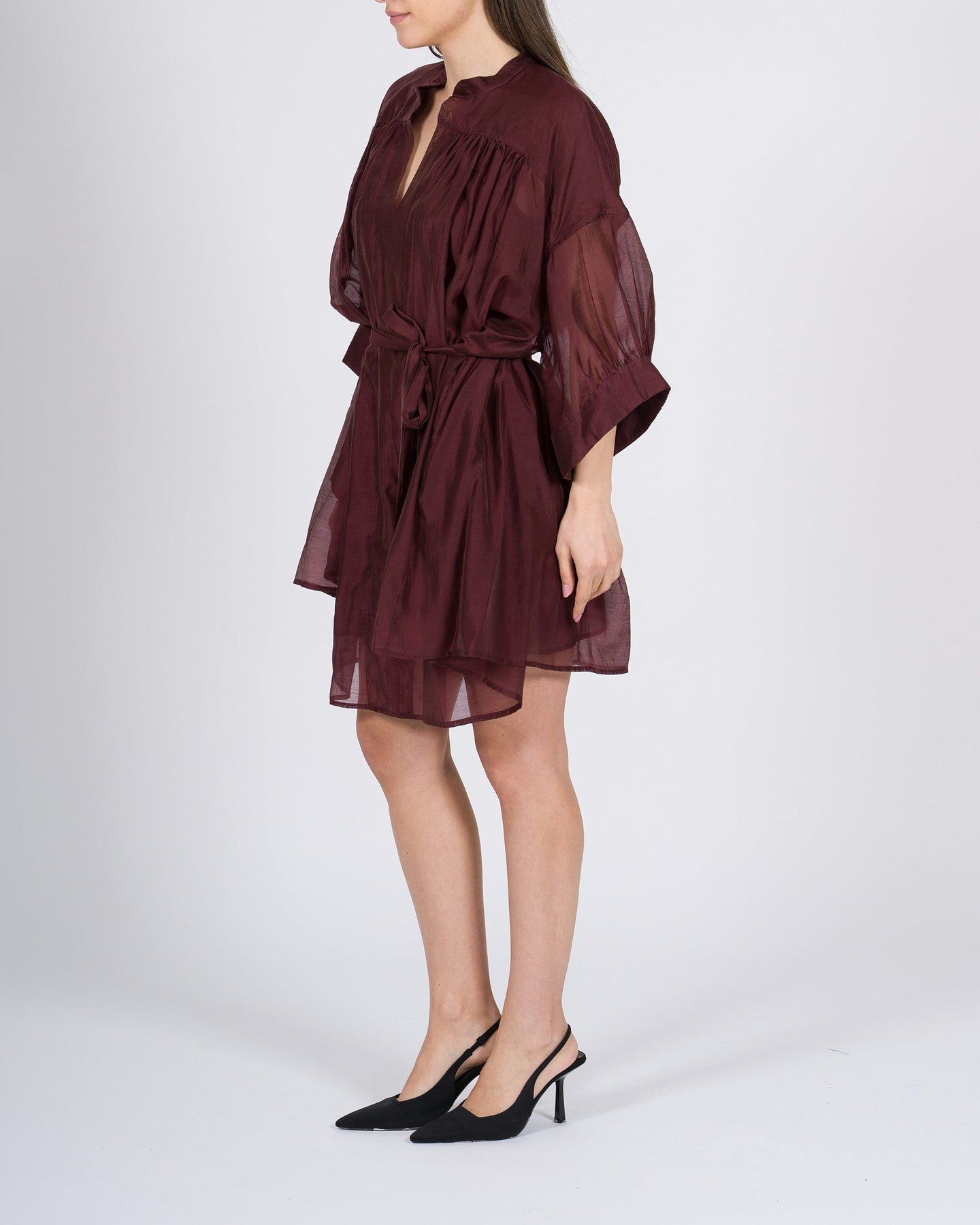 Abito meimeij vino ampio in mussola di cotone con fusciacca in vita