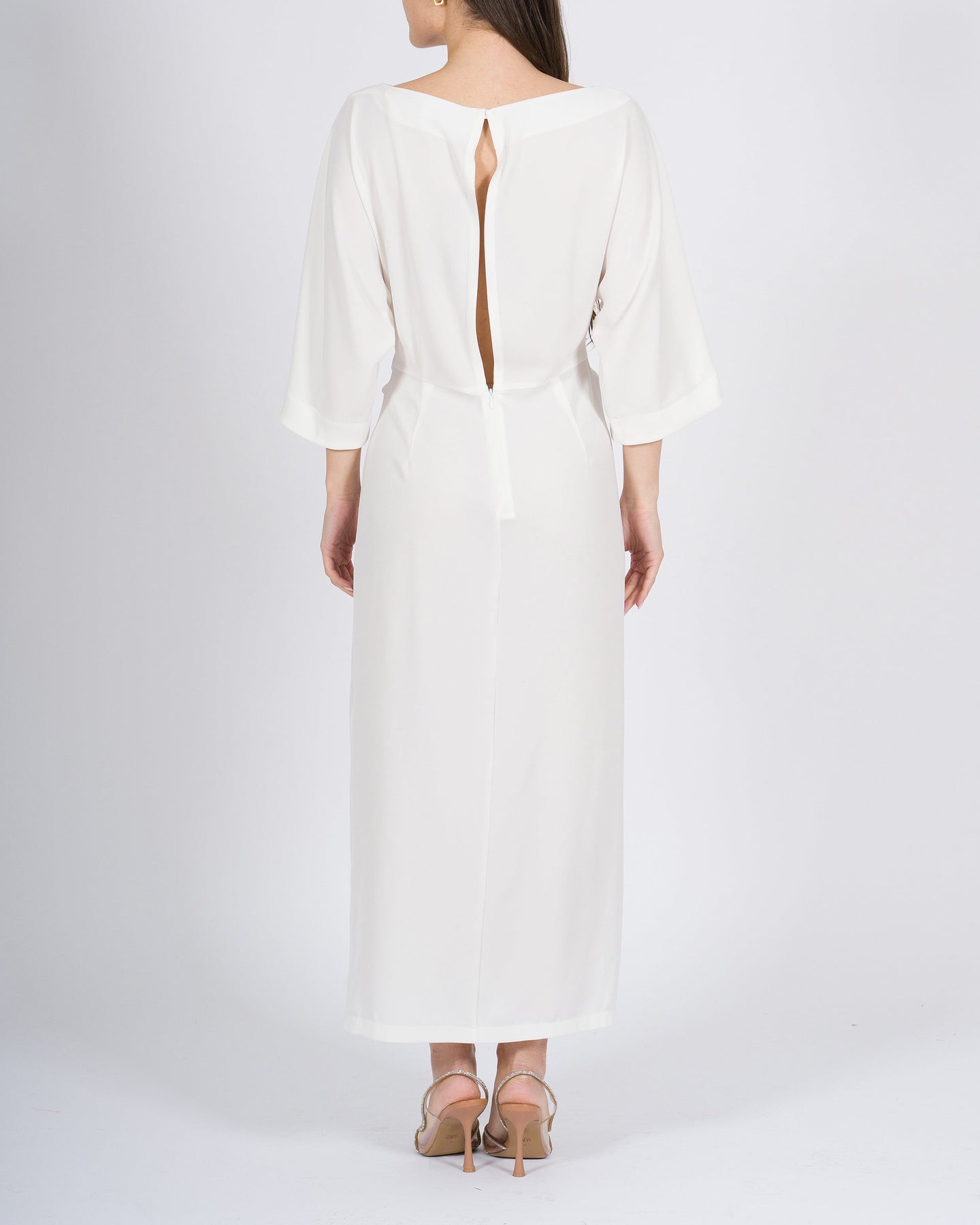 Fluidità elegante, silhouette femminile, stile contemporaneo.L'abito longuette MEIMEJ in georgette con drappeggio in vita valorizza la figura con morbidezza, combinando linee raffinate a dettagli sofisticati per un look minimal e ricercato.Un capo versatile, perfetto per occasioni eleganti o outfit dal carattere sofisticato.