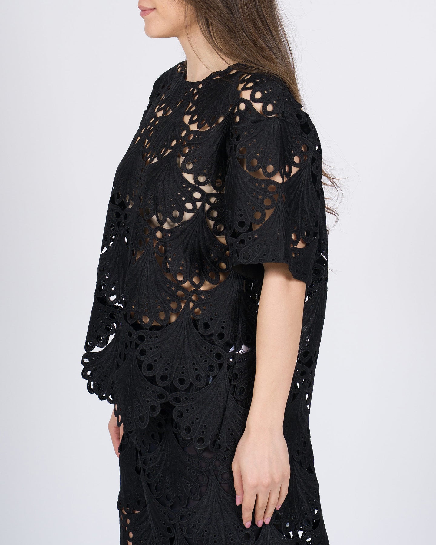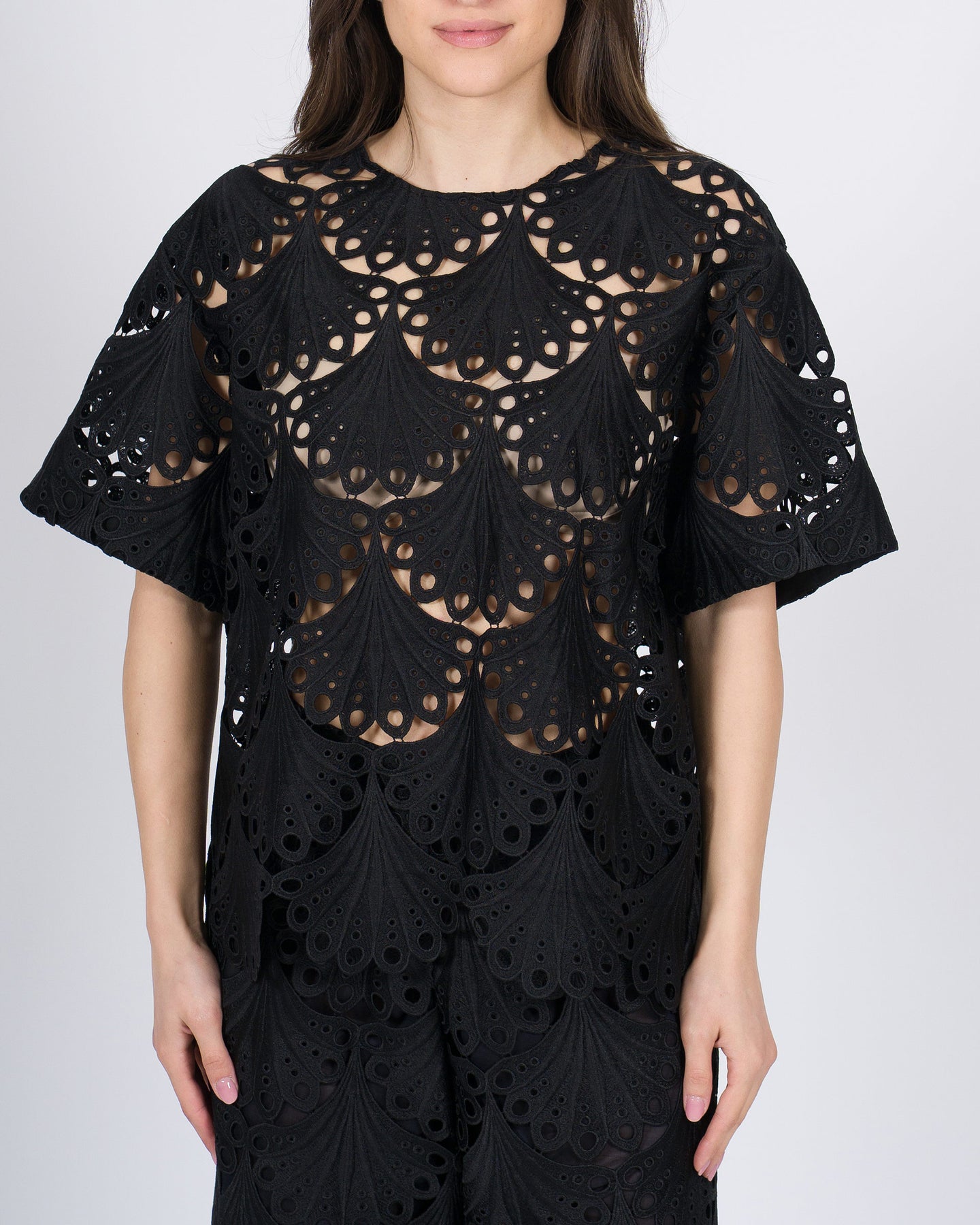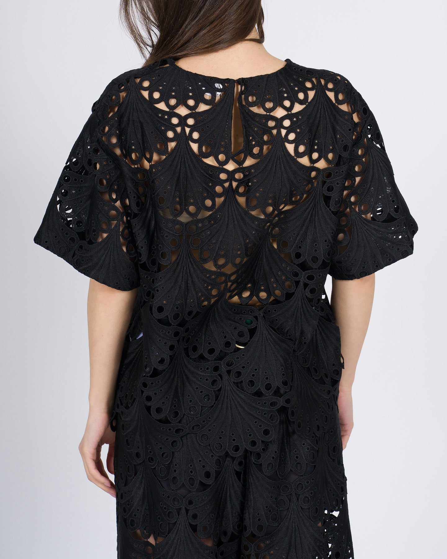 Raffinata blusa da donna nera del brand Meimeij, impreziosita da un elegante traforo a motivo conchiglia che dona al capo un tocco originale e sofisticato. Il design combina semplicità e dettagli ricercati, creando un effetto femminile e moderno.Il tessuto morbido e leggero garantisce comfort e vestibilità fluida, rendendo la blusa perfetta sia per look eleganti sia per outfit casual chic. Facile da abbinare a pantaloni sartoriali, gonne o jeans per uno stile sempre raffinato.