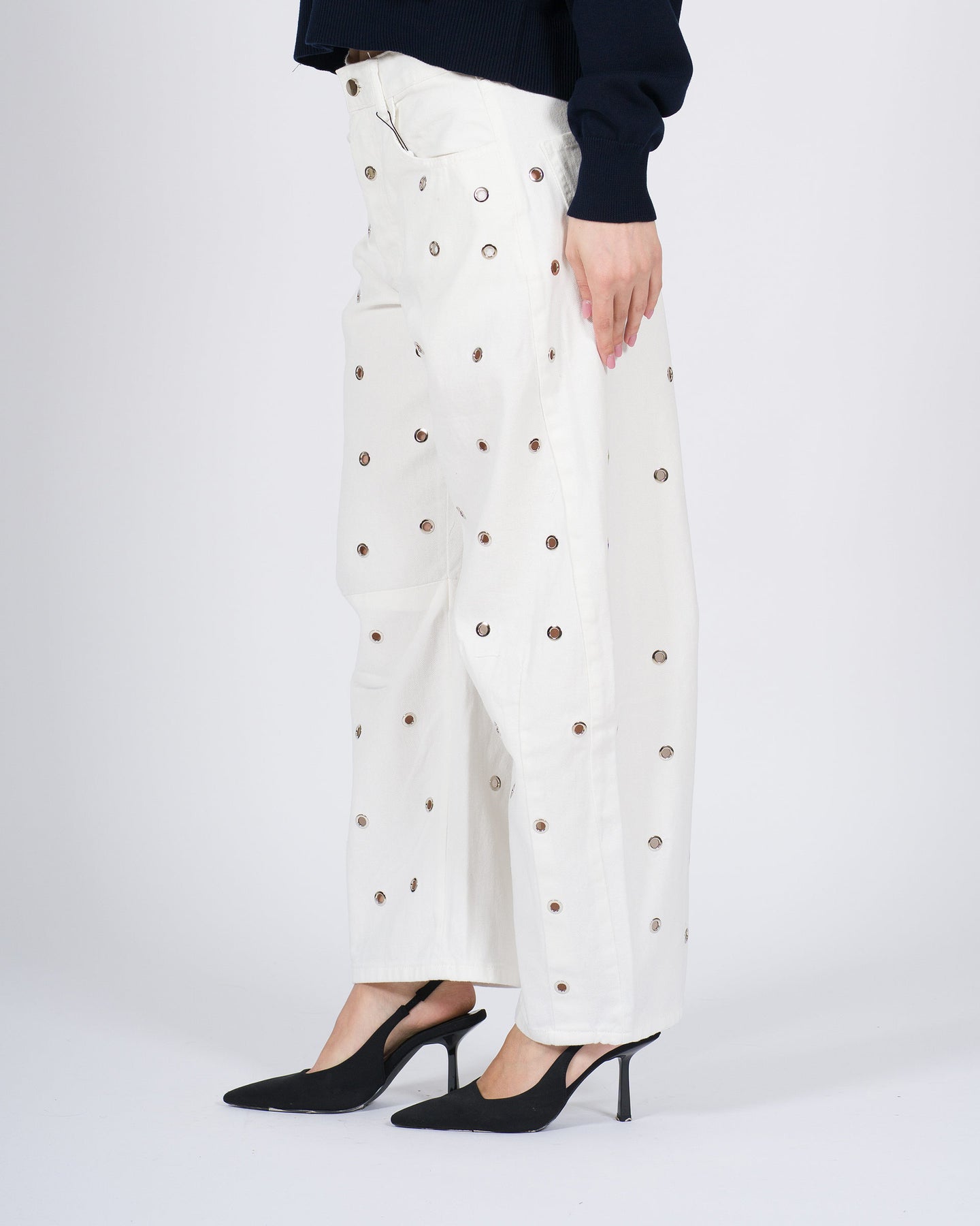 Originale e trendy, questo denim bianco Meimeij modello ballon combina comfort e personalità. La vestibilità ballon garantisce libertà di movimento e un look moderno, mentre le borchie aggiungono un dettaglio rock-chic che valorizza il capo. Perfetto da abbinare a top semplici o camicie per outfit casual, urbani o serali.