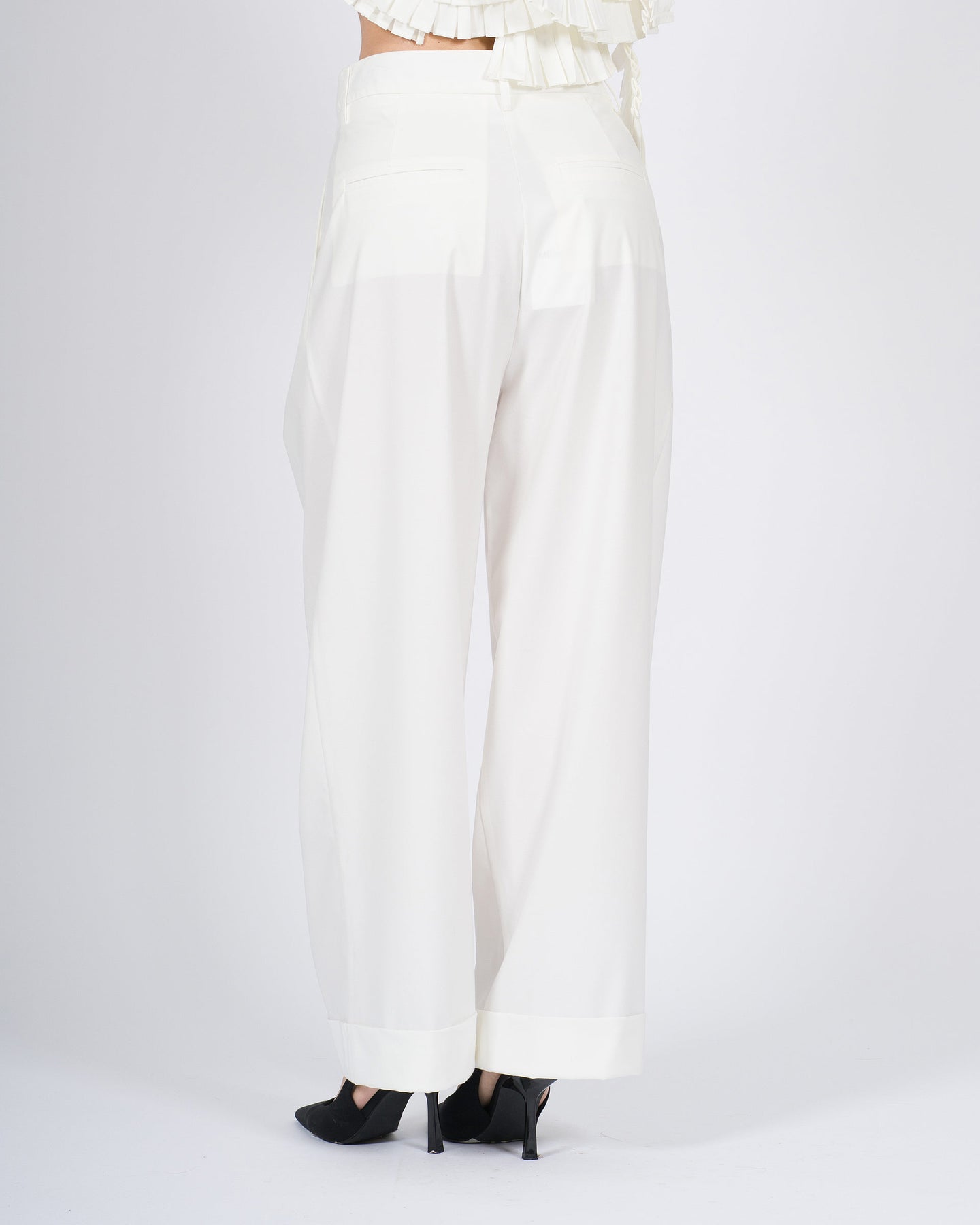 Classico e sofisticato, questo pantalone Meimeij in popeline bianco è arricchito da pence che valorizzano la linea e donano eleganza al capo. La vestibilità comoda lo rende perfetto per outfit formali o smart-casual, da abbinare a camicie, bluse o top più informali. Un must-have versatile per il guardaroba femminile.