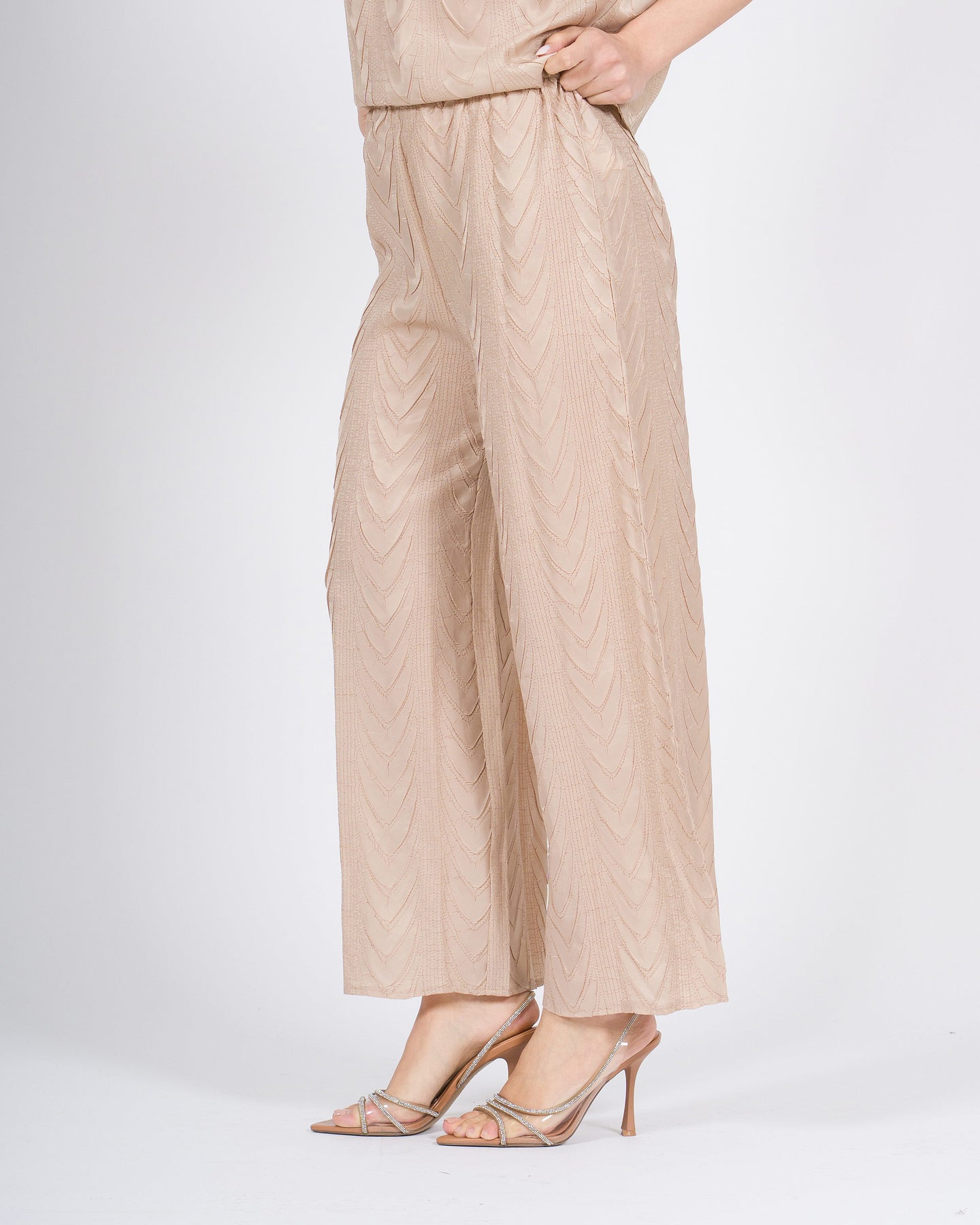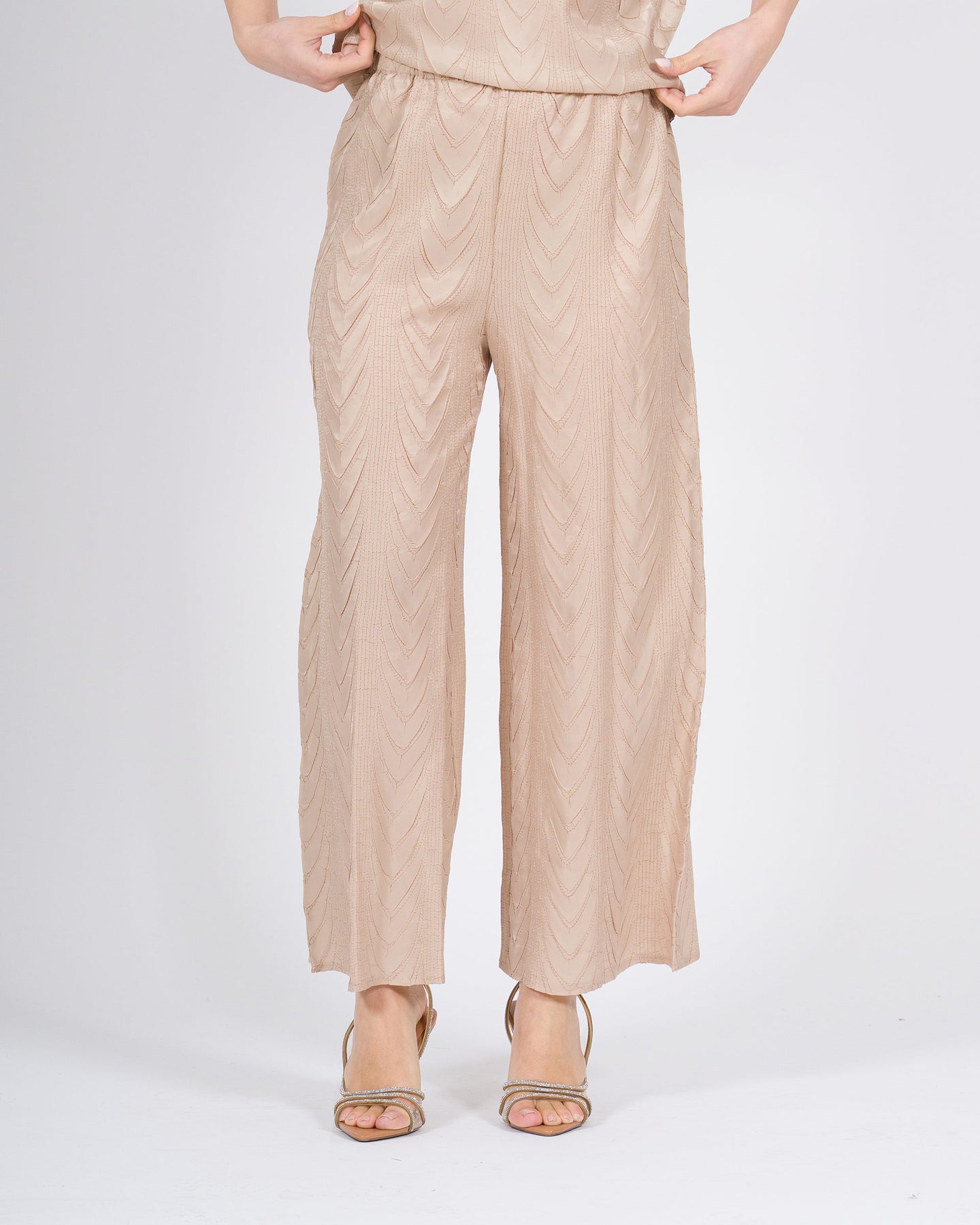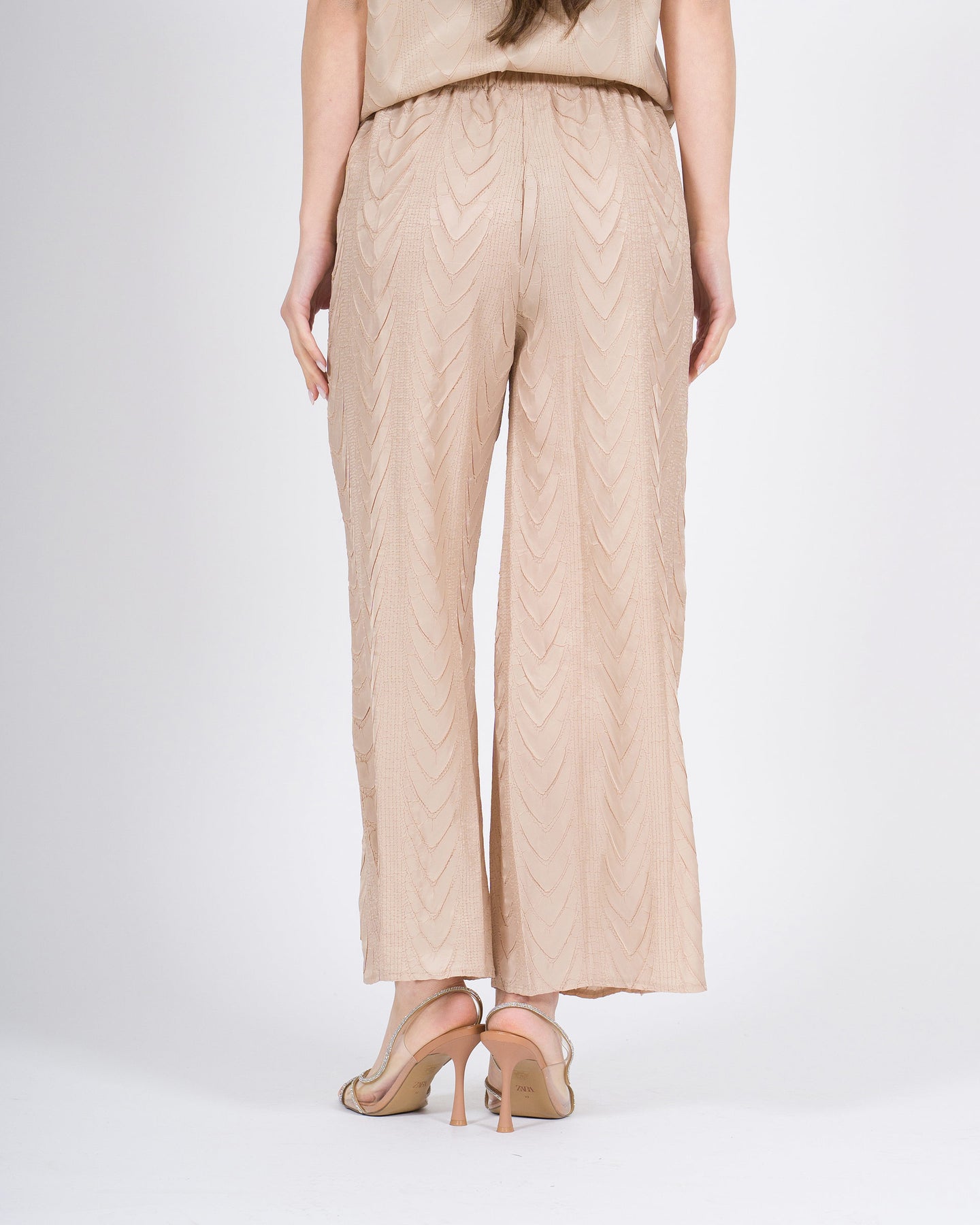 Linee fluide, comfort raffinato, stile contemporaneo.I pantaloni morbidi MEIMEJ con elastico e disegno a treccia avvolgono la silhouette con leggerezza, combinando volumi morbidi e dettagli distintivi per un look minimal e sofisticato.Un capo versatile, perfetto da abbinare a camicie, top o bluse per outfit eleganti e ricercati.