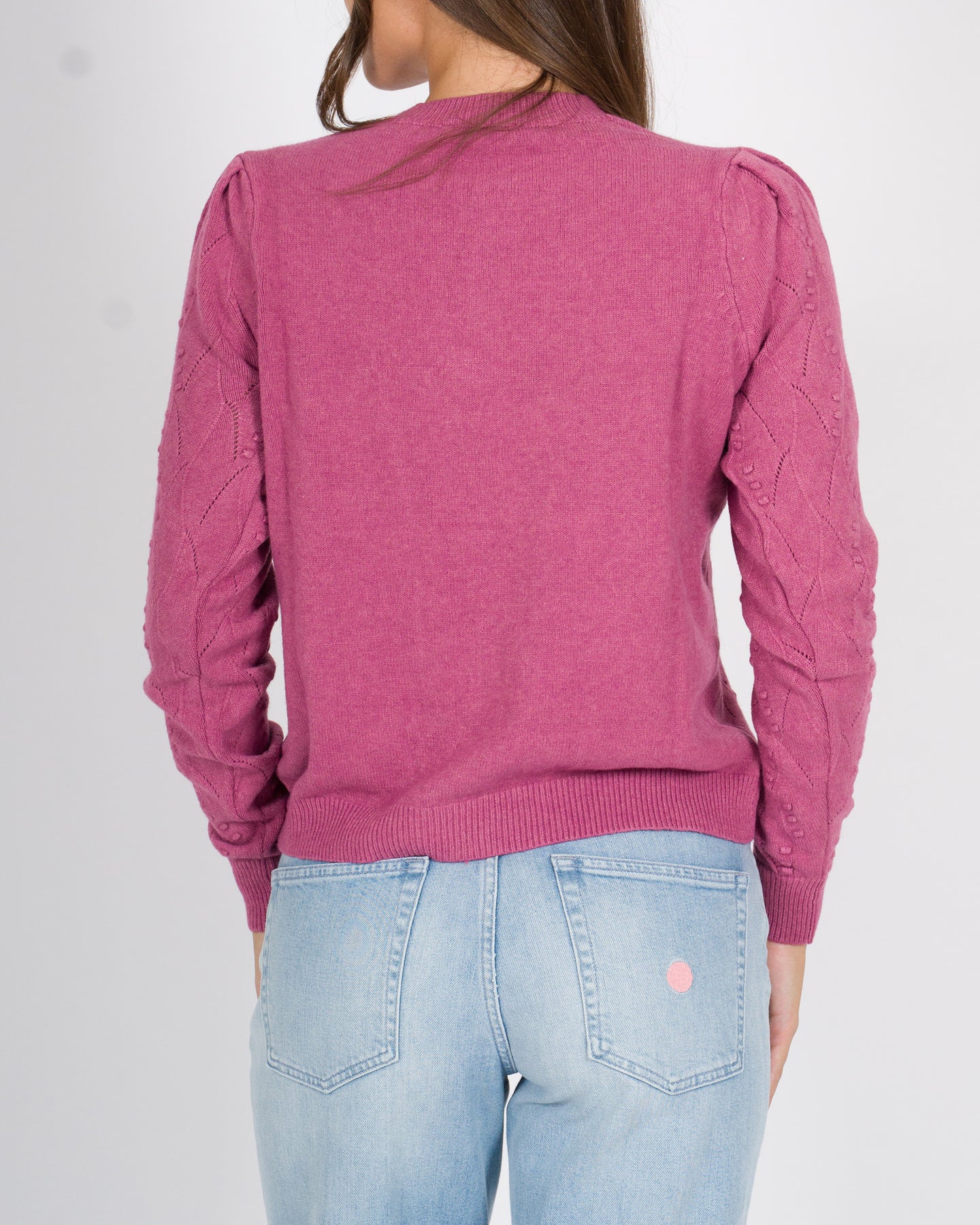 Maglia manica lunga realizzata in morbido tessuto di viscosa, arricchita da una delicata lavorazione a rombi tono su tono, che dona un elegante effetto tridimensionale al capo. Il giro manica a sbuffo aggiunge un tocco femminile e sofisticato, rendendo la maglia ideale sia pe outfit quotidiani che più ricercati.Dettagli tecnici:Tessuto: viscosaLavorazione a rombiManica a sbuffoColore: rosala modella indossa la taglia S/M ed è alta 1.70.