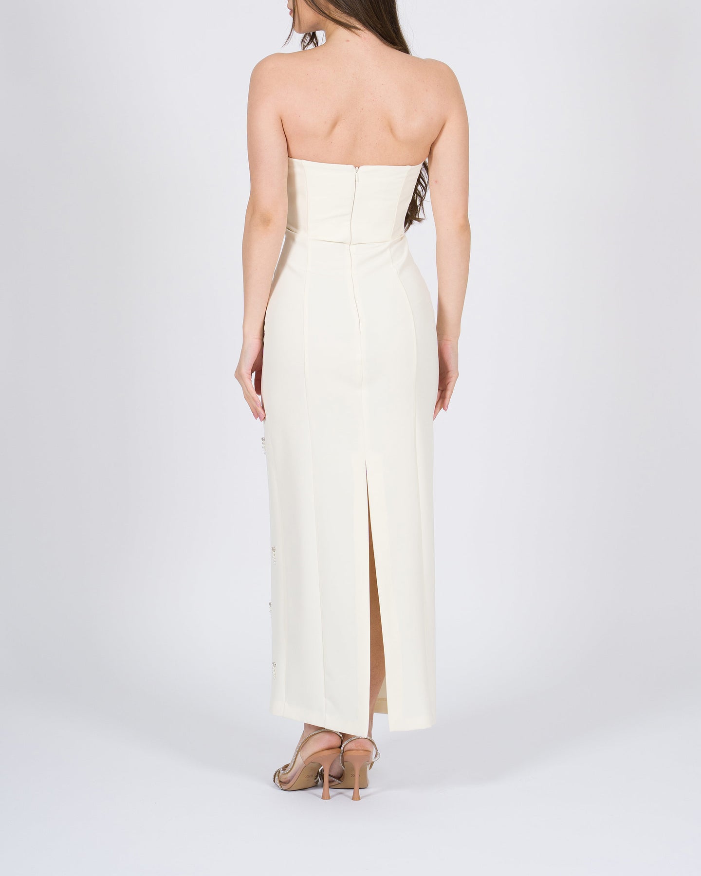 Splendido abito da donna effetto bustier, caratterizzato da un design longuette e impreziosito da perline decorative che aggiungono luminosità e un tocco sofisticato al capo. La linea aderente valorizza la silhouette, mentre il taglio elegante lo rende perfetto per eventi serali, cerimonie o occasioni speciali.