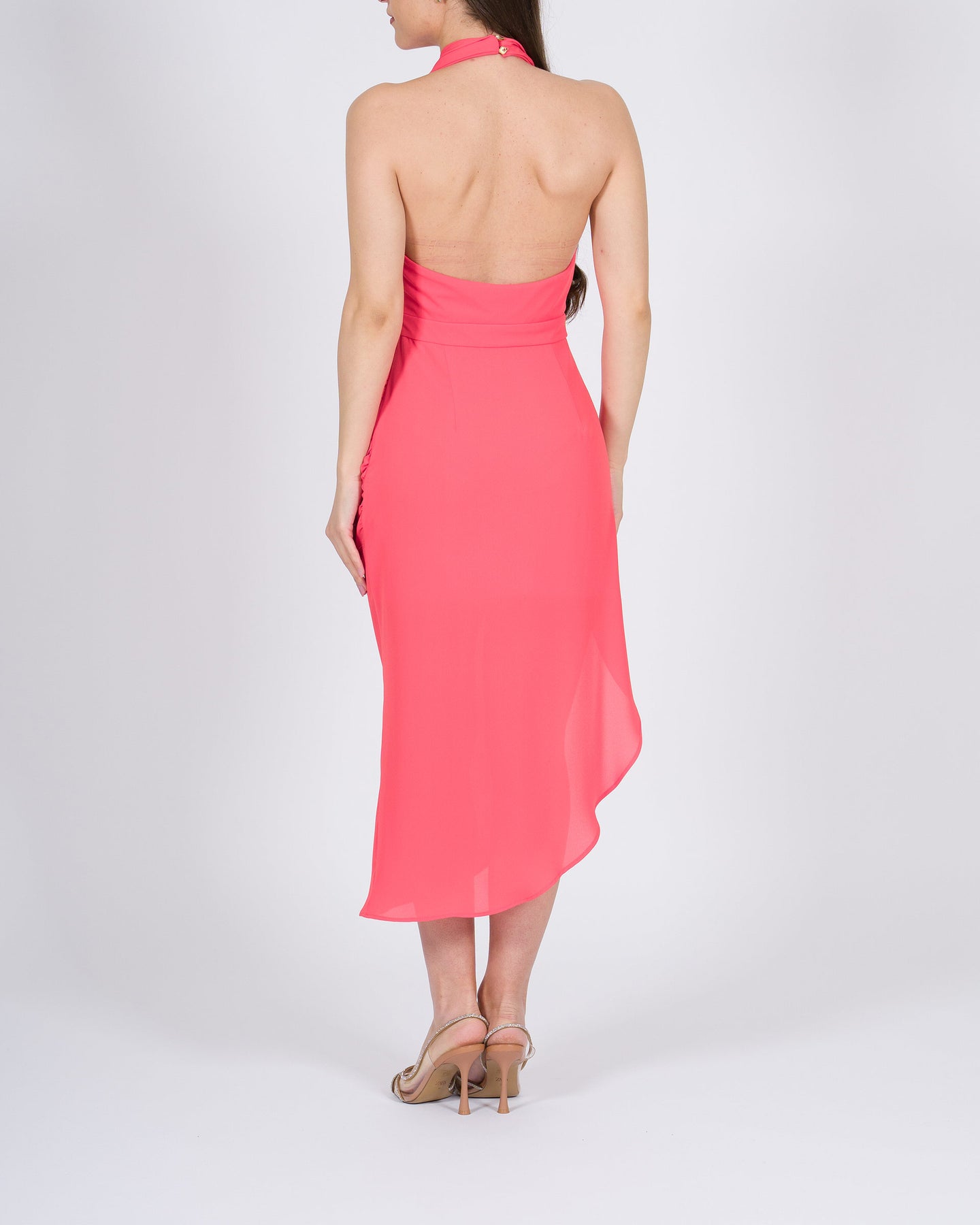 Splendido abito da donna corallo del brand Silence, caratterizzato da un elegante drappeggio e da un taglio asimmetrico sul fondo, che conferisce movimento e stile contemporaneo al capo. Il collo sciallato aggiunge un tocco sofisticato e femminile, valorizzando il décolleté in modo delicato.