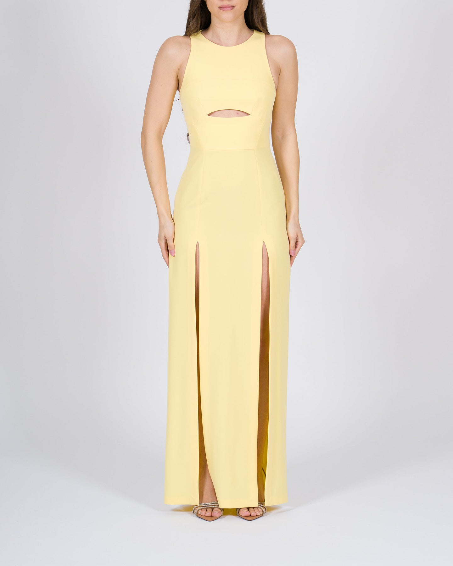 Splendido abito da donna giallo del brand Silence, caratterizzato da spacchi laterali che aggiungono un tocco sensuale e dinamico al capo, valorizzando la silhouette. La linea elegante e fluida lo rende perfetto per serate, eventi o occasioni speciali, garantendo uno stile femminile e raffinato.