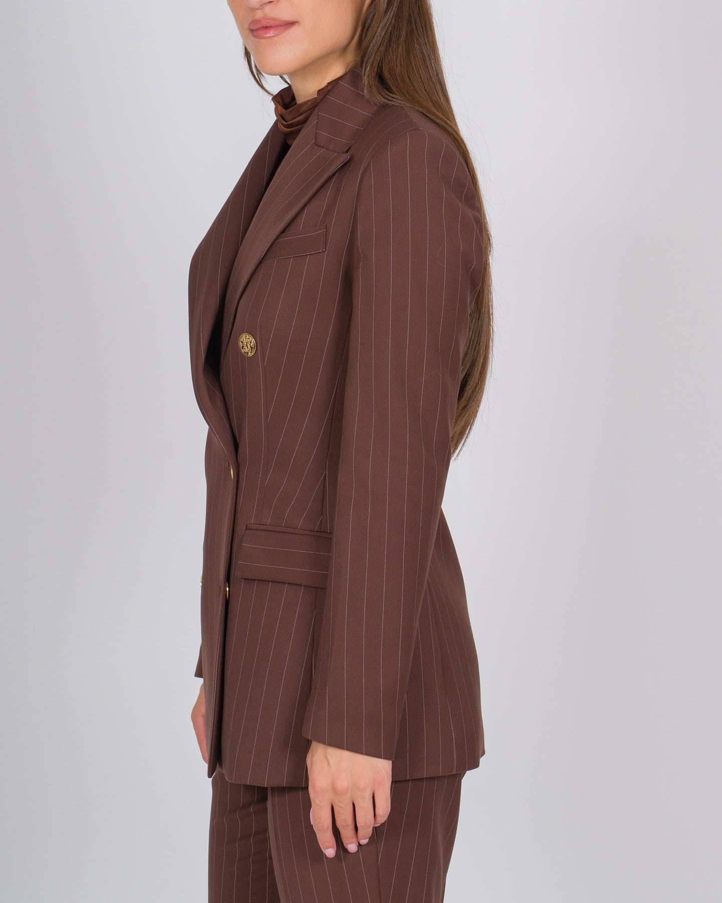 Eleganza sartoriale e contemporaneità si incontrano nel blazer doppio petto di Silence. Realizzato in tessuto gessato marrone, questo capo è caratterizzato da un petto a lancia e da bottoni in oro che aggiungono un dettaglio prezioso e distintivo.La linea strutturata e sofisticata consente di creare un completo coordinato, grazie alla possibilità di abbinare il blazer ai pantaloni dello stesso tessuto, per un look elegante e uniforme, perfetto per occasioni formali o contesti professionali di alto livello.