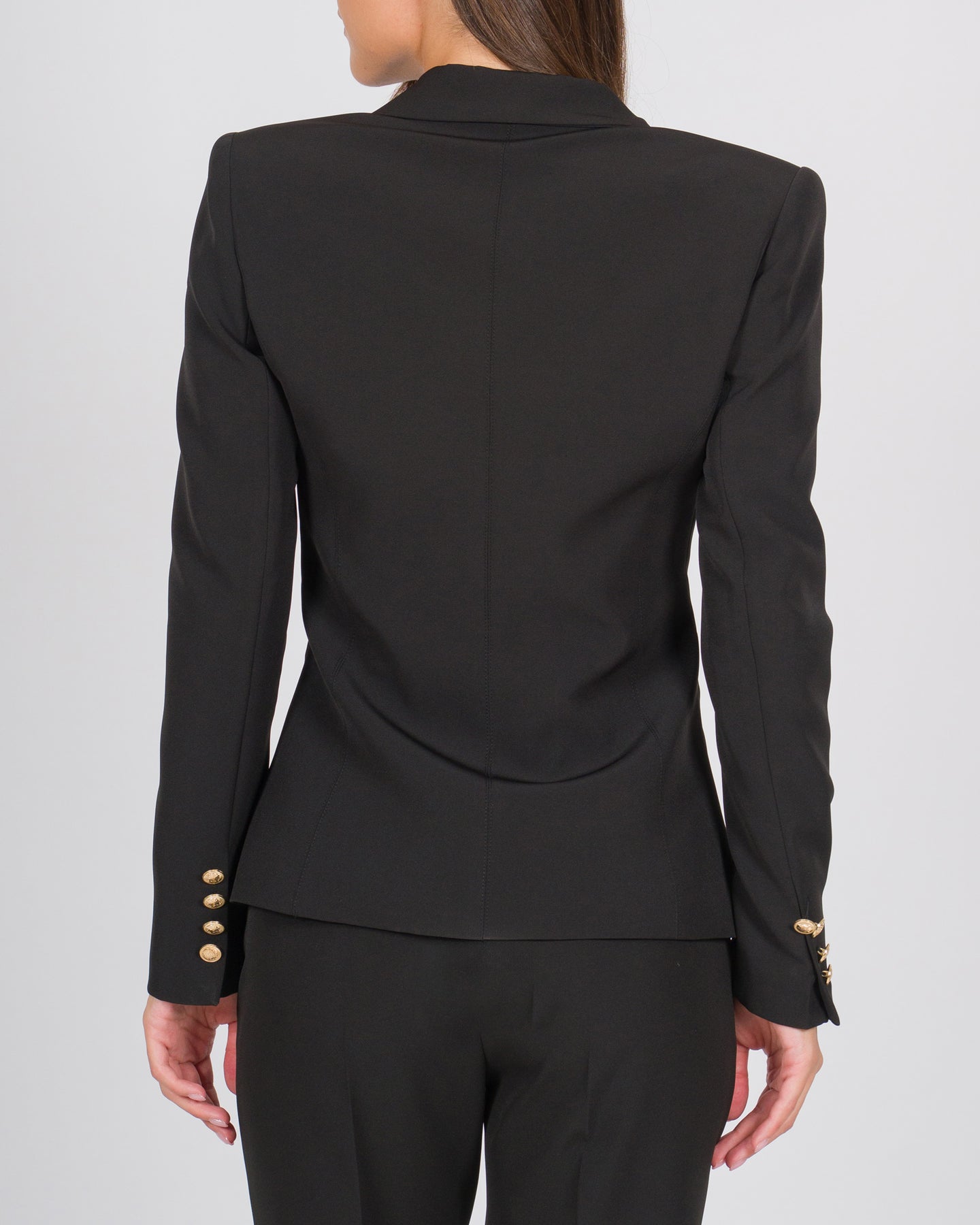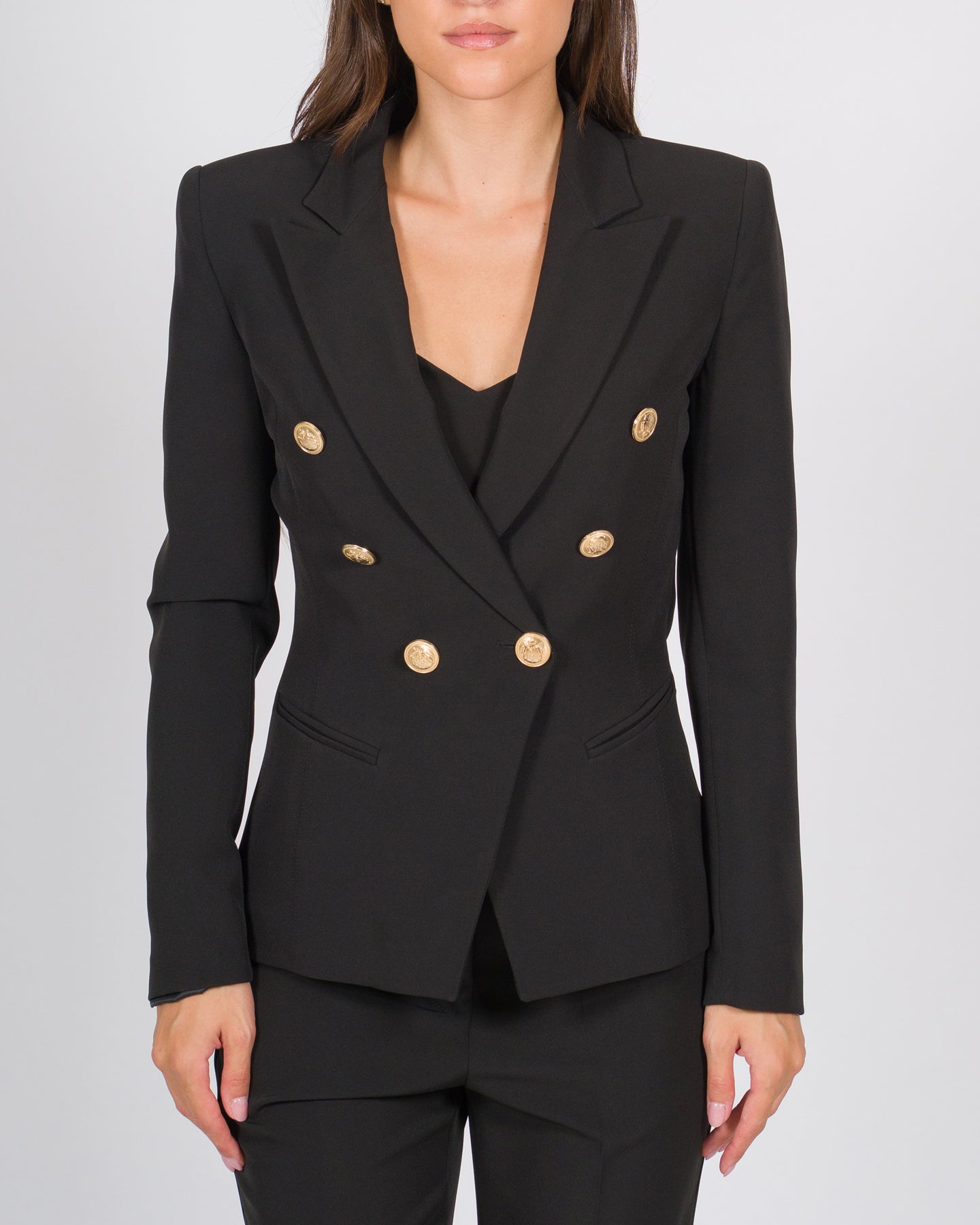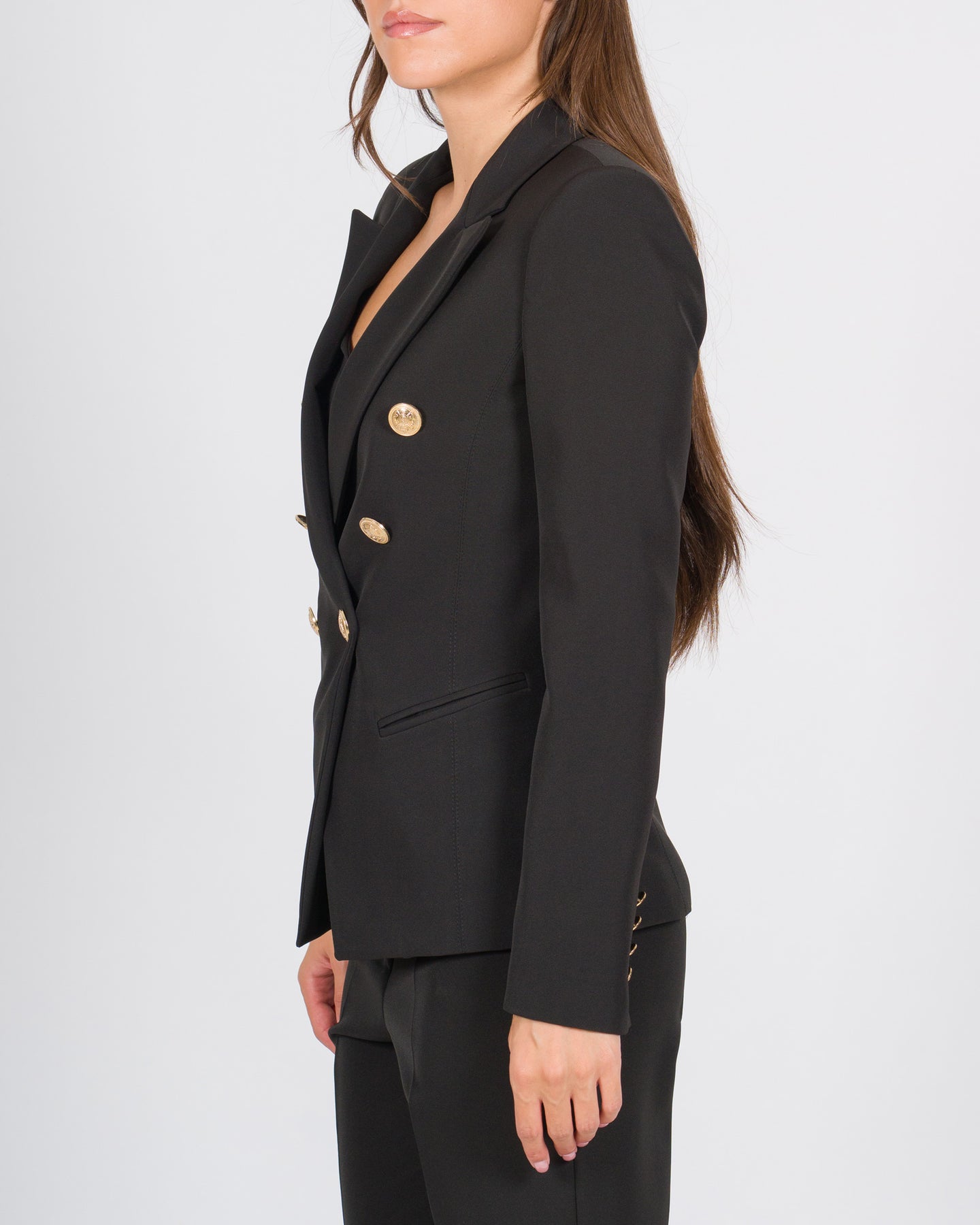 Giacca doppio petto nera in tessuto bistretch, elegante e sofisticata, caratterizzata da revers a lancia che slanciano la linea e donano un tocco sartoriale. Il modello è impreziosito da bottoni oro, dettaglio luminoso e raffinato che arricchisce il design.Dettagli del capo:Doppio petto con chiusura a bottoni oro, per un effetto elegante e di carattereRevers a lancia, dal taglio deciso e contemporaneoLinea strutturata ma confortevole, grazie al tessuto bistretch che segue i movimentiColore neroPossibilità di abbinarla al pantalone coordinato, per completare un tailleur moderno e sofisticatoPerfetta per creare look business, eleganti o serali, da indossare sia singolarmente che come completo.
