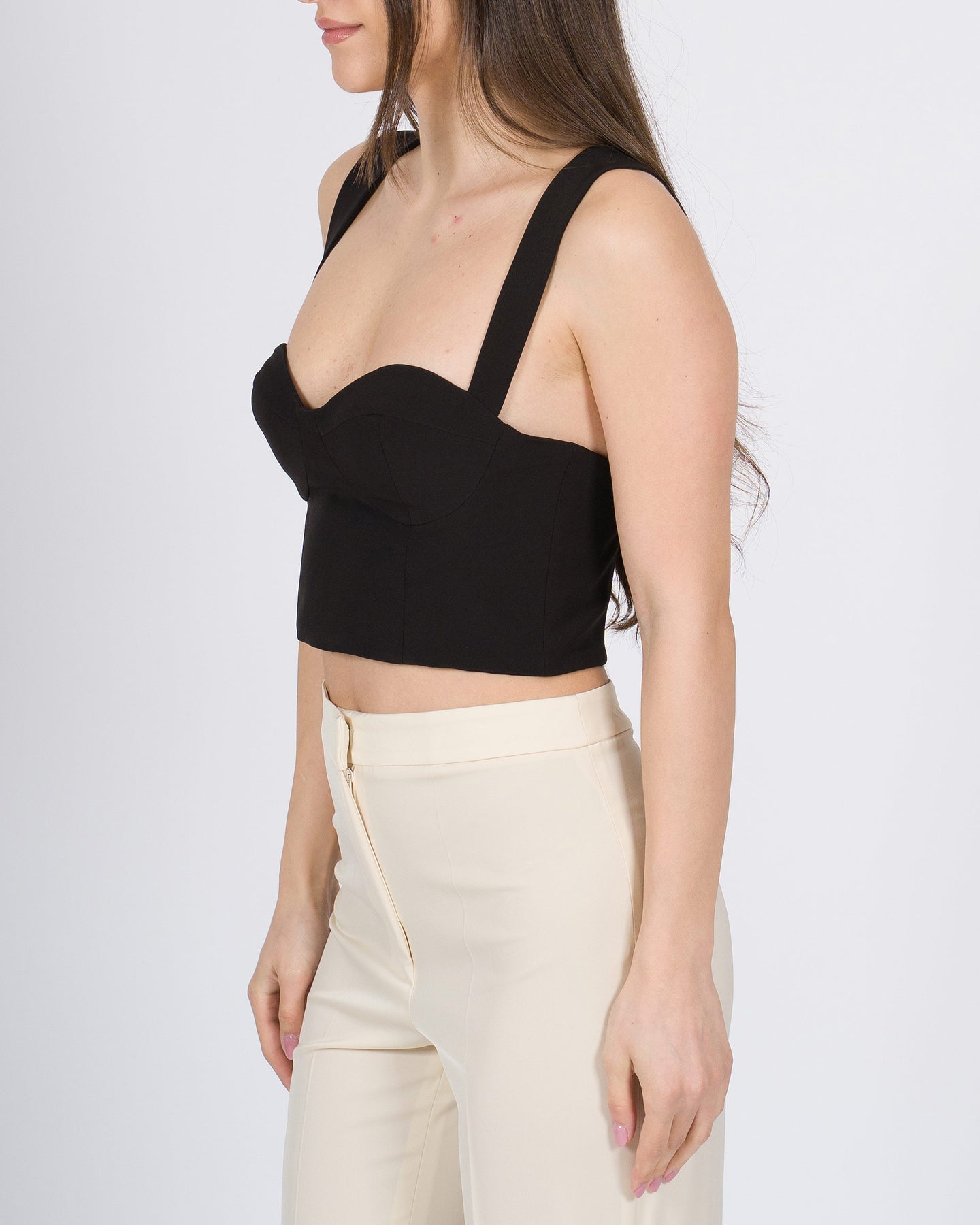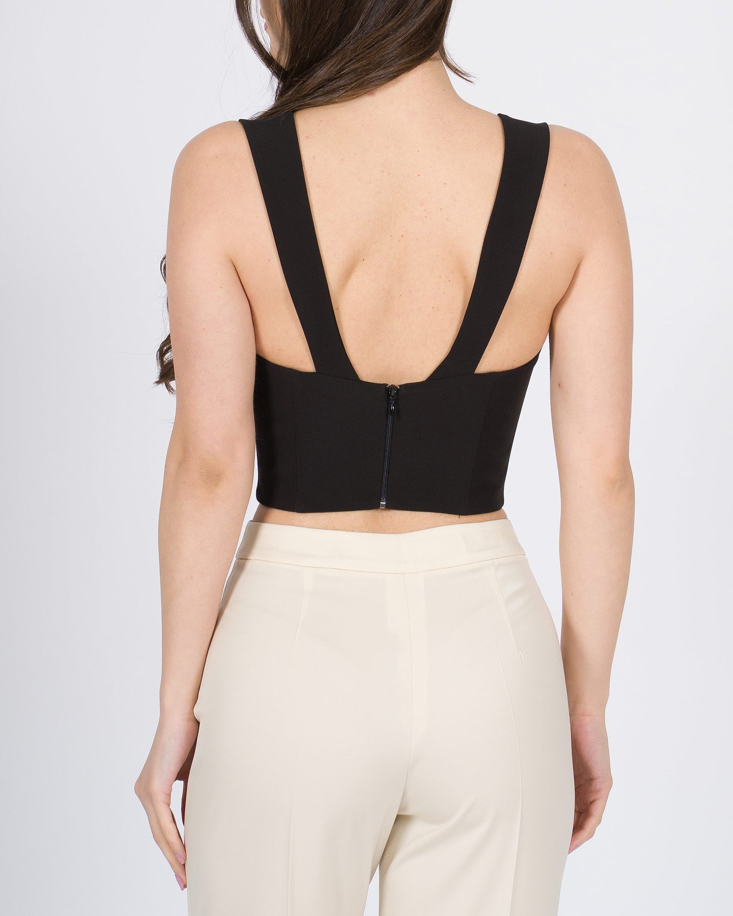 Raffinato top da donna nero del brand Silence, caratterizzato da coppe interne che offrono sostegno e valorizzano il décolleté. Il design essenziale e aderente lo rende versatile, perfetto da indossare sia da solo per un look sofisticato, sia abbinato a giacche, blazer o gonne per outfit più eleganti.