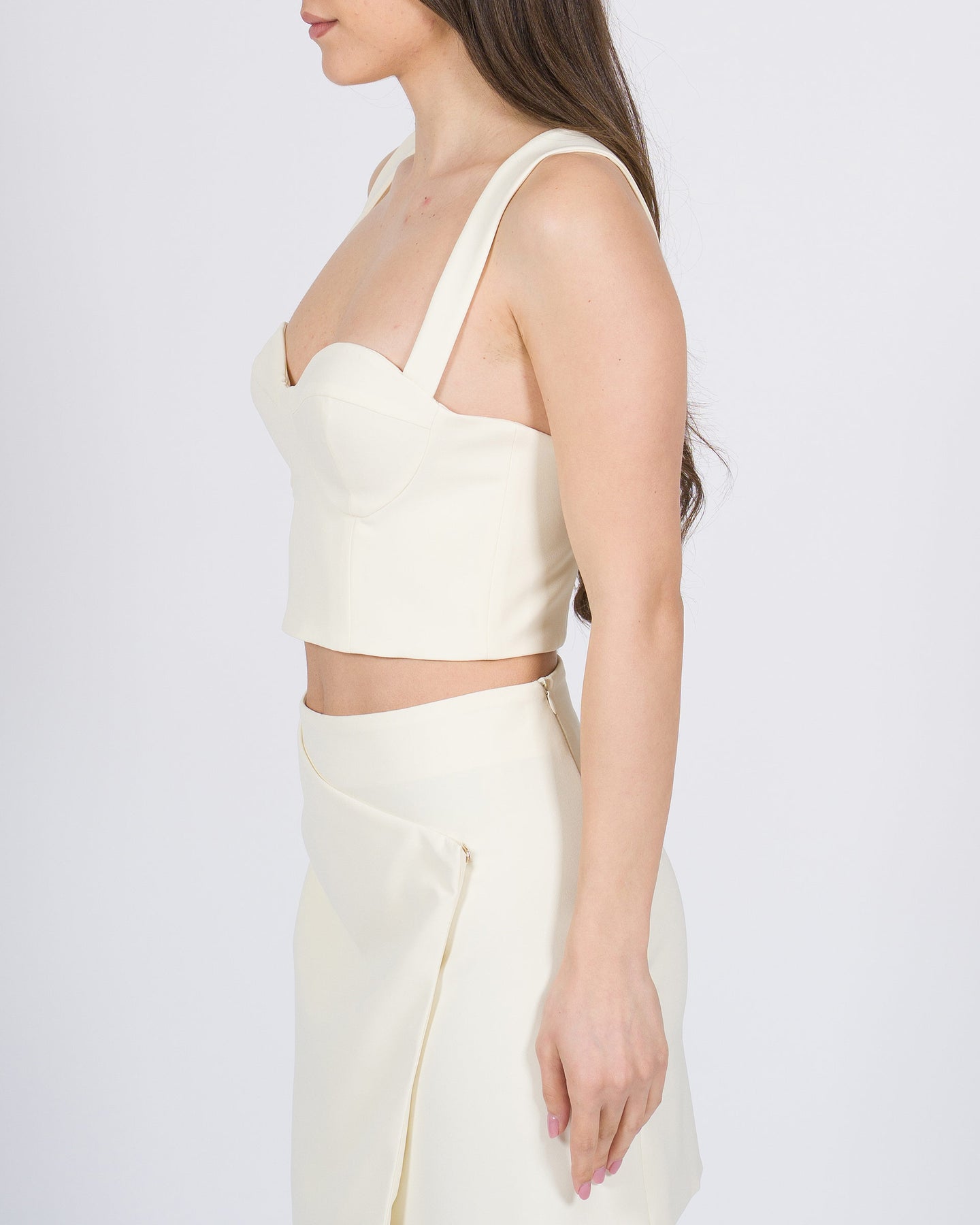 Raffinato top da donna panna del brand Silence, caratterizzato da coppe interne che offrono sostegno e valorizzano il décolleté. Il design essenziale e aderente lo rende versatile, perfetto da indossare sia da solo per un look sofisticato, sia abbinato a giacche, blazer o gonne per outfit più eleganti.
