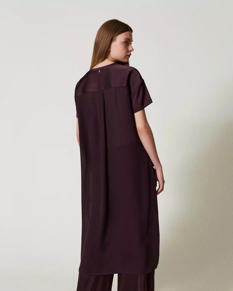 Blusa collezione Actitude in raso con scollo tondo, maniche corte e pannello asimmetrico in georgette più lungo sul retro, spacchi laterali, linea morbida.